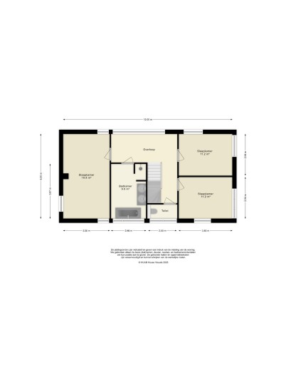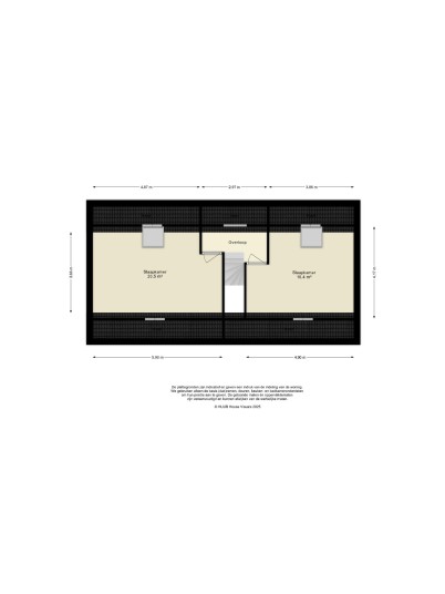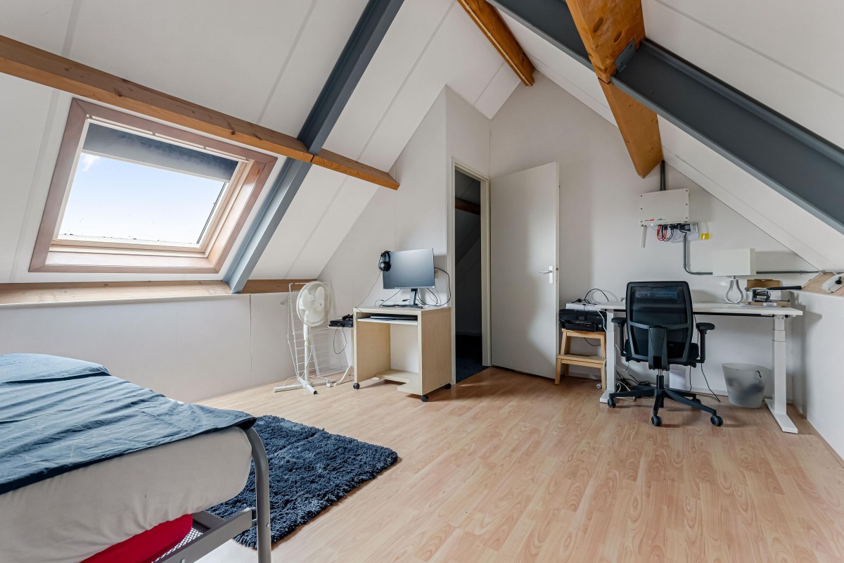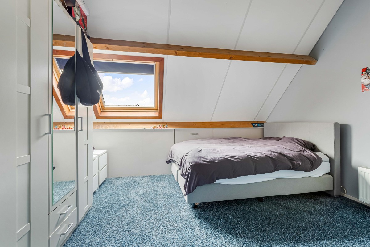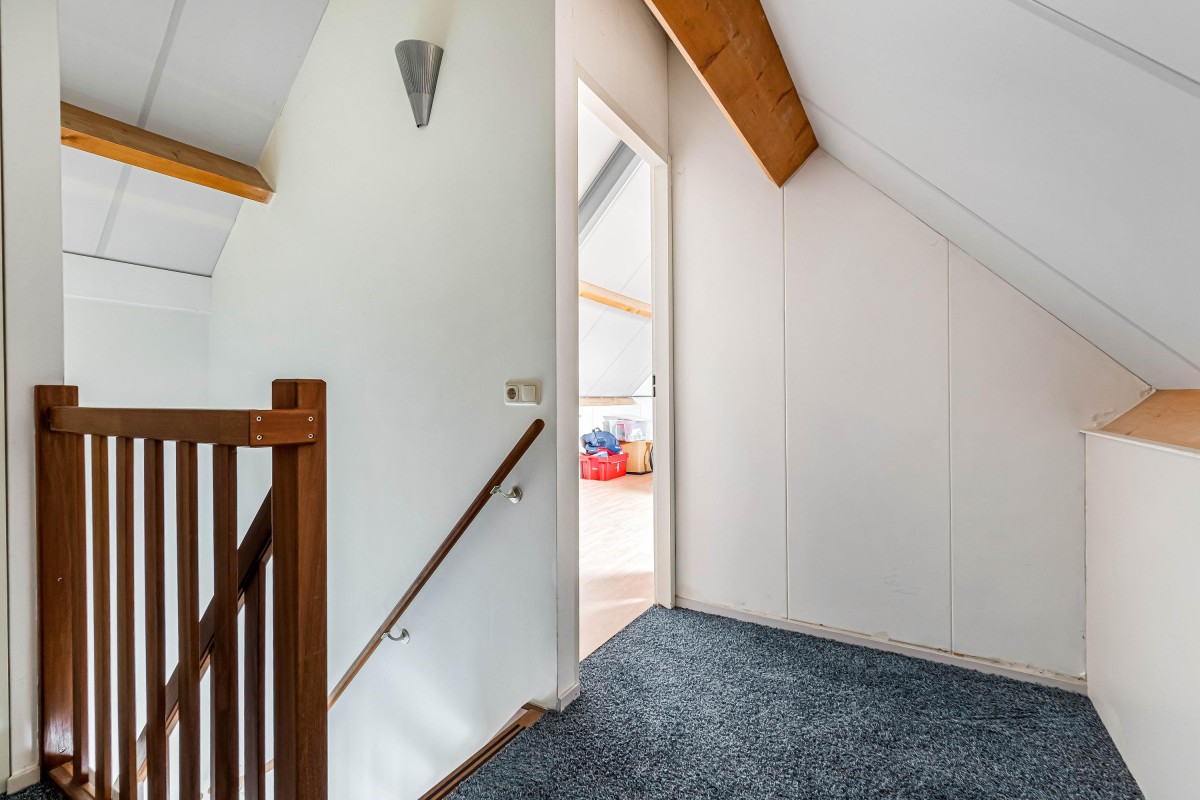 De zolder biedt nog twee ruime slaapkamers van respectievelijk ca. 20 m² en 16 m². Achter de knieschotten is veel bergruimte aanwezig.