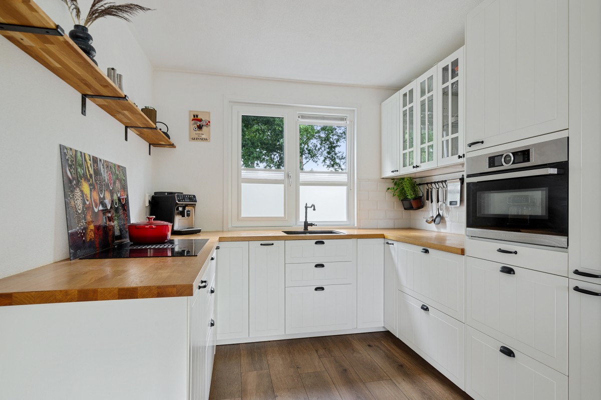 De woning beschikt over een moderne en strak afgewerkte keuken die in 2022 is geplaatst. De keuken is van alle gemakken voorzien en uitgerust met diverse inbouwapparatuur waaronder een vaatwasser, inductie kookplaat met geïntegreerde afzuiging, combi-oven en een koelkast met daaronder een vriesgedeelte.
