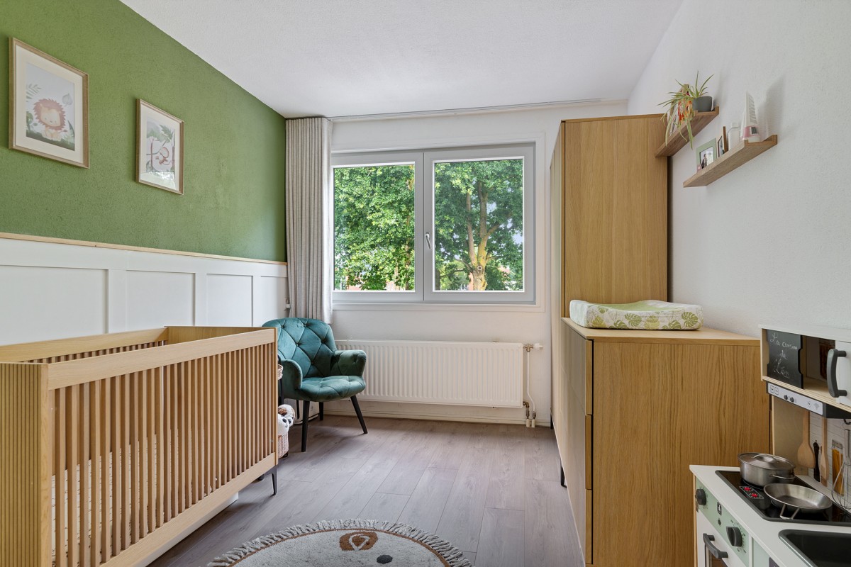 De slaapkamer aan de voorzijde is voorzien van een verhuisraam.
