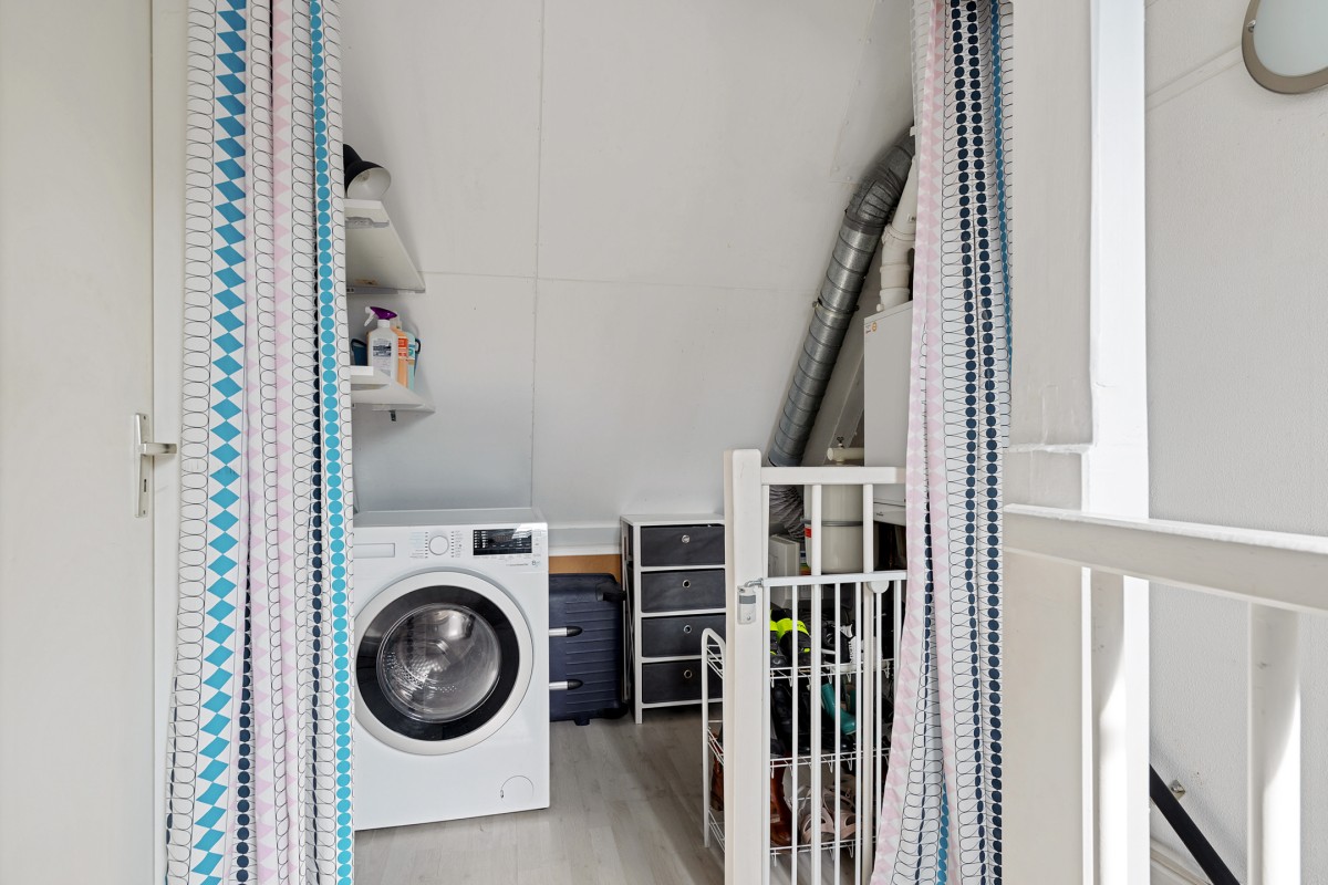 Overloop met de opstelplaats van de cv-ketel uit 2017, de mechanische ventilatie (2022) en de aansluitingen voor de wasmachine en de wasdroger.