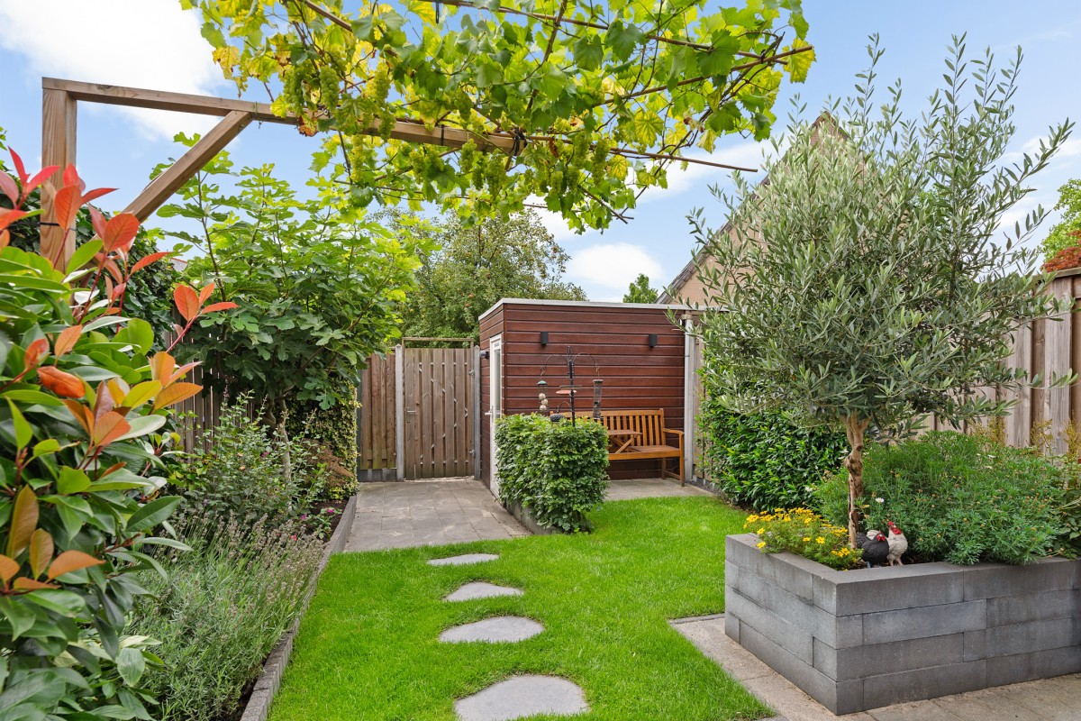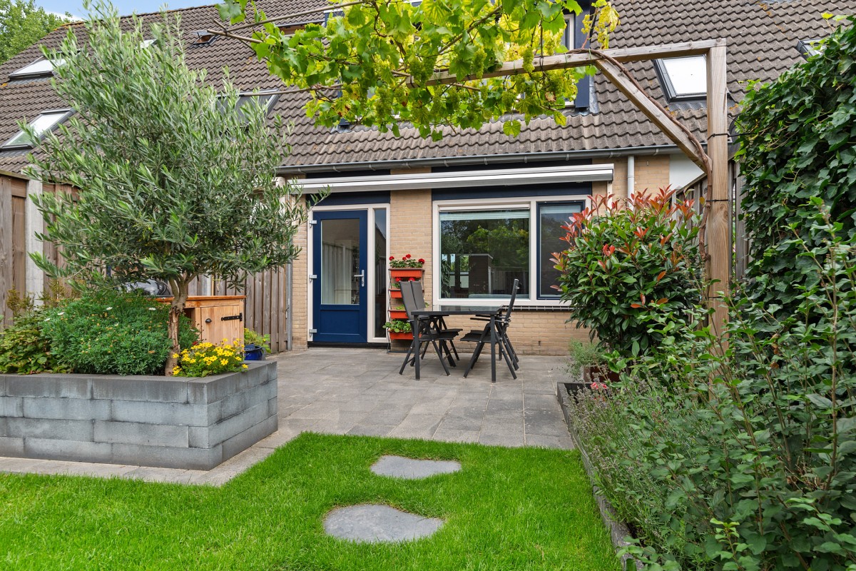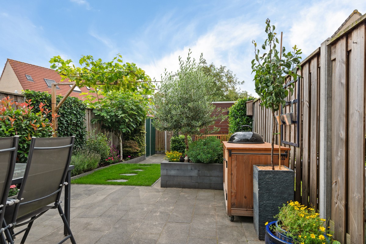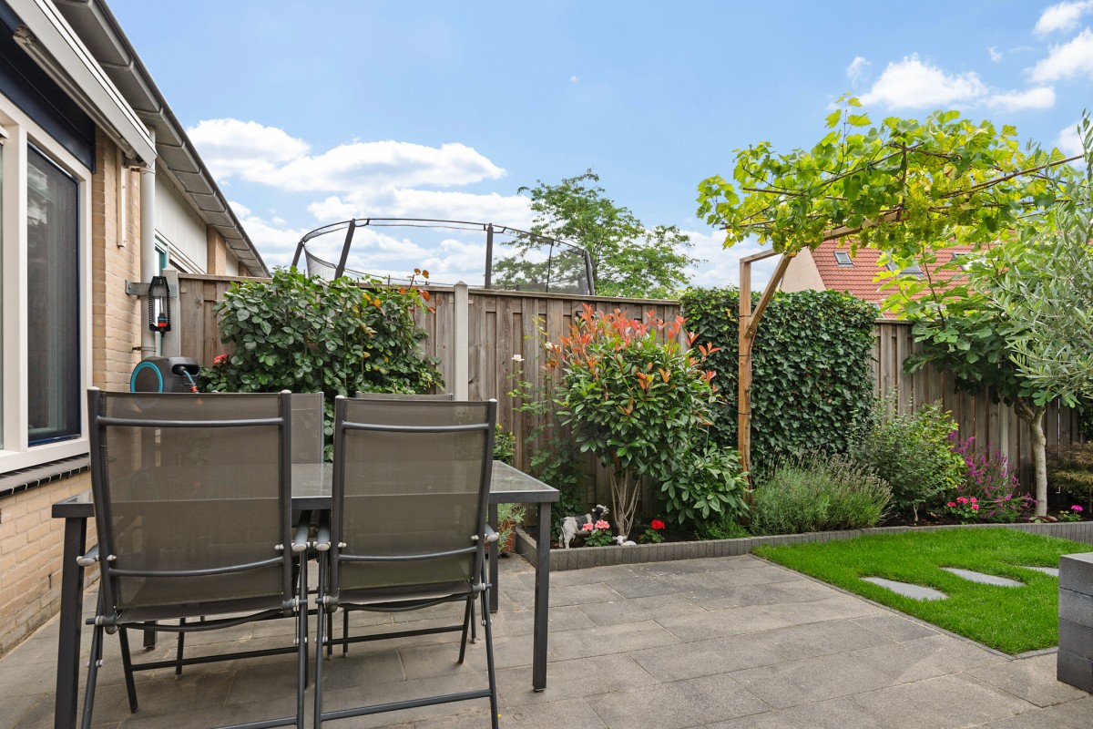 De achtertuin is keurig aangelegd en biedt voor ieder wat wils. Het ruime terras zorgt voor een fijne plek om te ontspannen of te dineren in de buitenlucht. Het strakke gazon wordt omringd door diverse planten en struiken, wat zorgt voor een groene en sfeervolle uitstraling. Verder beschikt de tuin over een vaste plantenbak en een handige wateraansluiting, ideaal voor tuinliefhebbers of het onderhoud van het groen. Een heerlijke plek om in alle rust van het buitenleven te genieten!