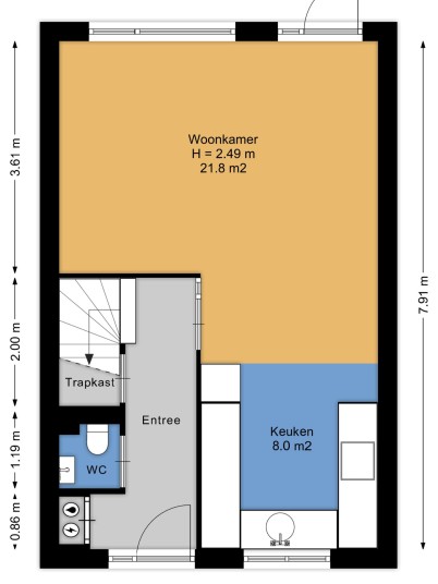 Entree, hal met toegang tot de meterkast met glasvezelaansluiting, vrij-hangend toilet met fonteintje, trap naar de verdieping met daaronder de trapkast en de deur naar de woonkamer.