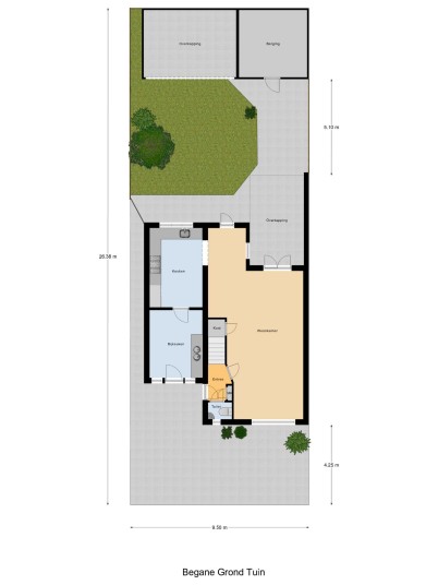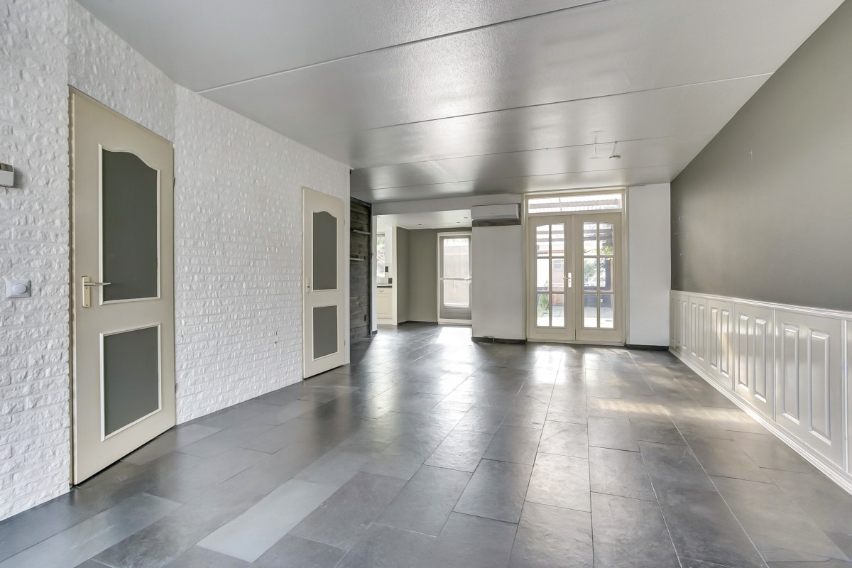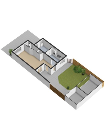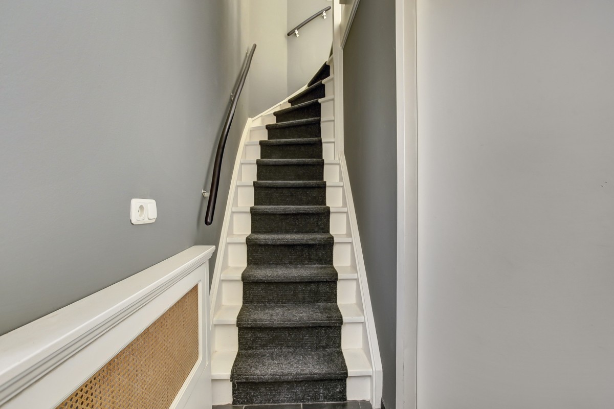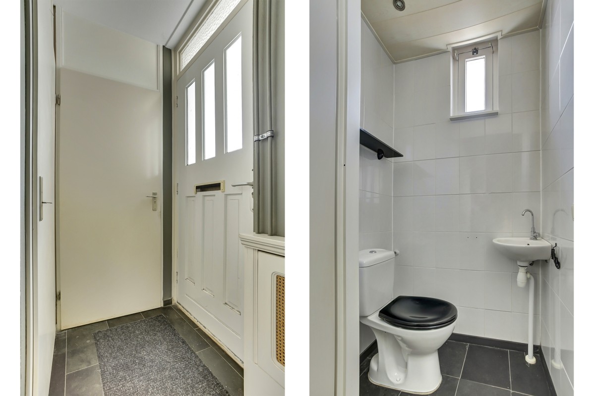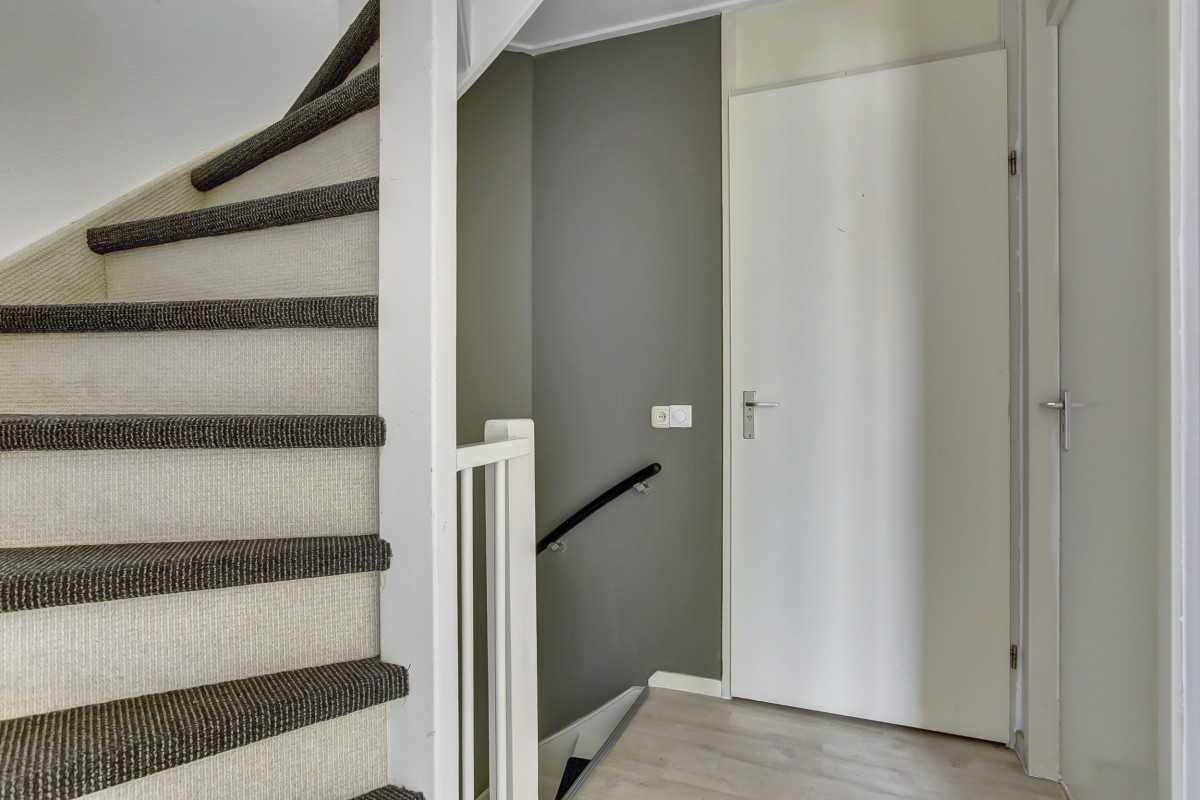 Begane grond: entree, hal met meterkast, toiletruimte, garderobe en trapopgang naar de verdieping. Straat gerichte woonkamer met openslaande deuren naar het overdekte terras.