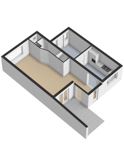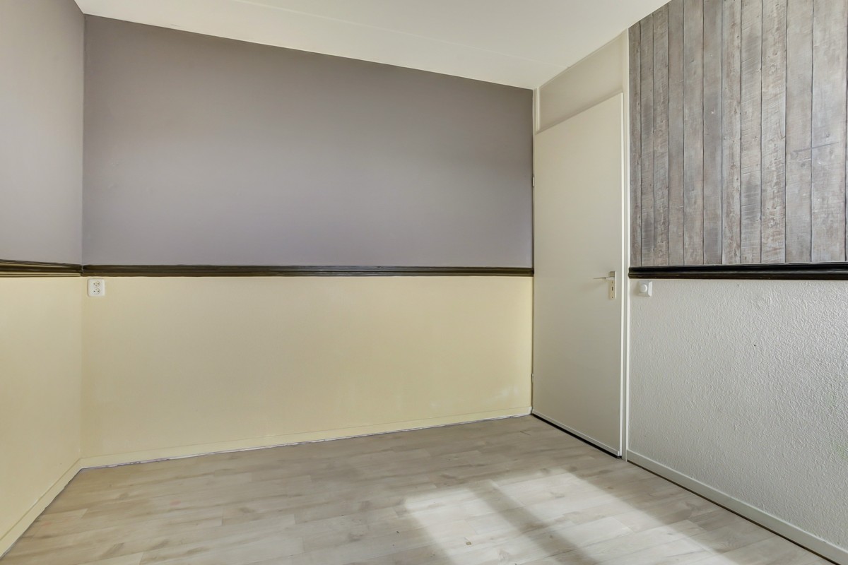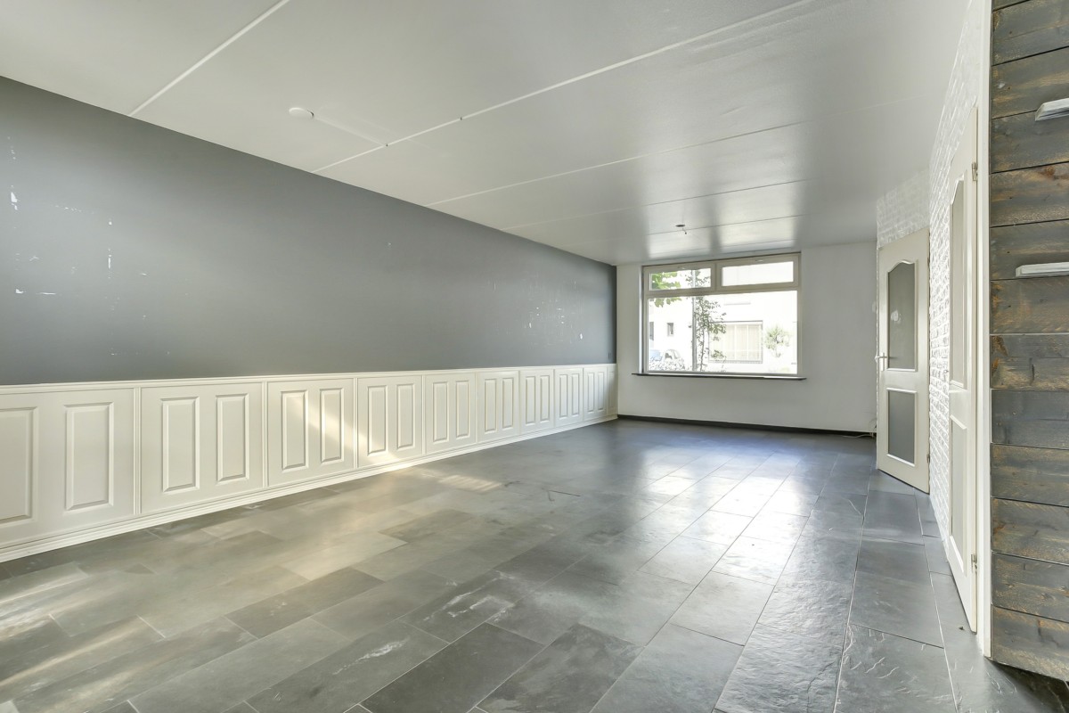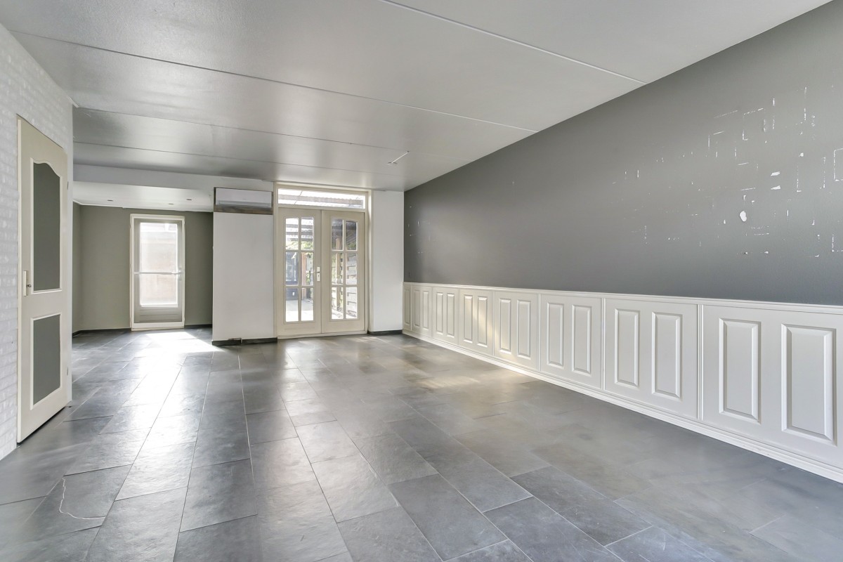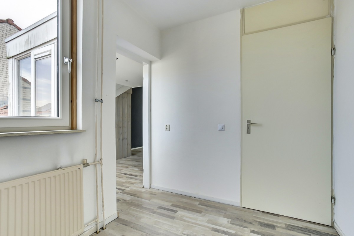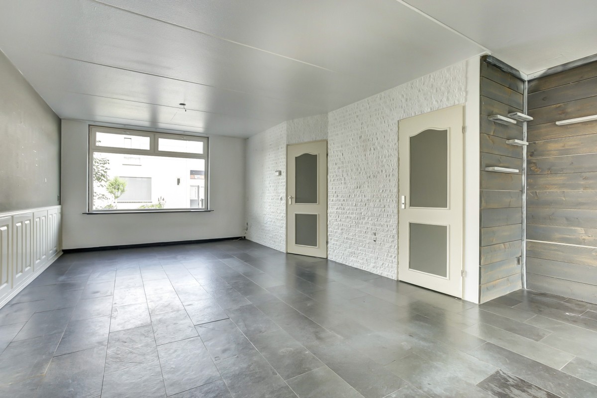 Begane grond: entree, hal met meterkast, toiletruimte, garderobe en trapopgang naar de verdieping. Straat gerichte woonkamer met openslaande deuren naar het overdekte terras.
