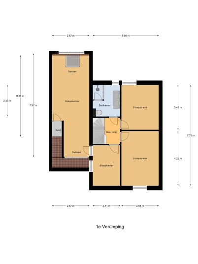 Eerste verdieping: overloop met aansluitend 4 slaapkamers en de badkamer. De slaapkamers en overloop beschikken over een laminaatvloer en de badkamer heeft een inloopdouche, 2e toilet en een meubel met dubbele wastafel.