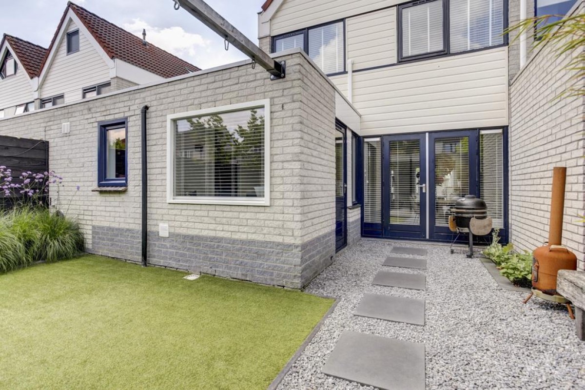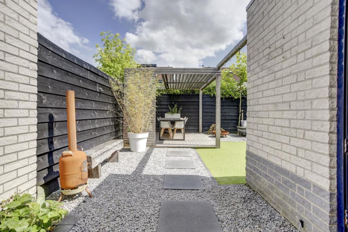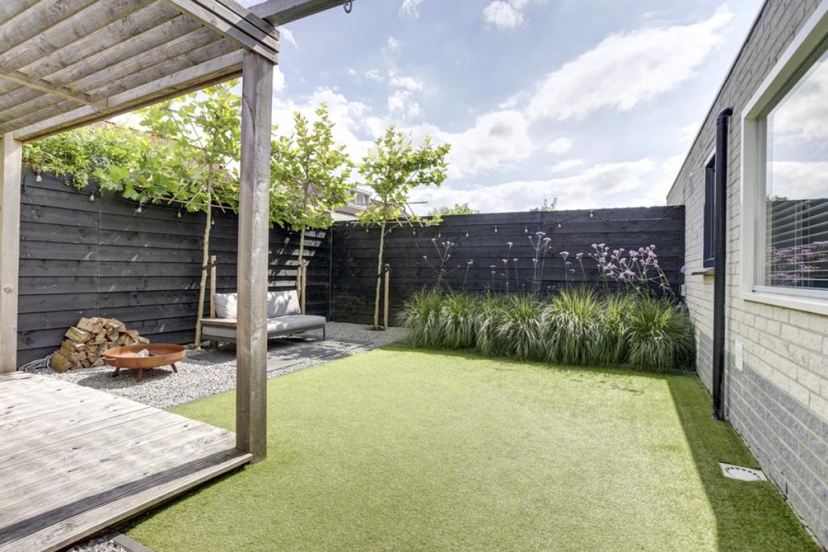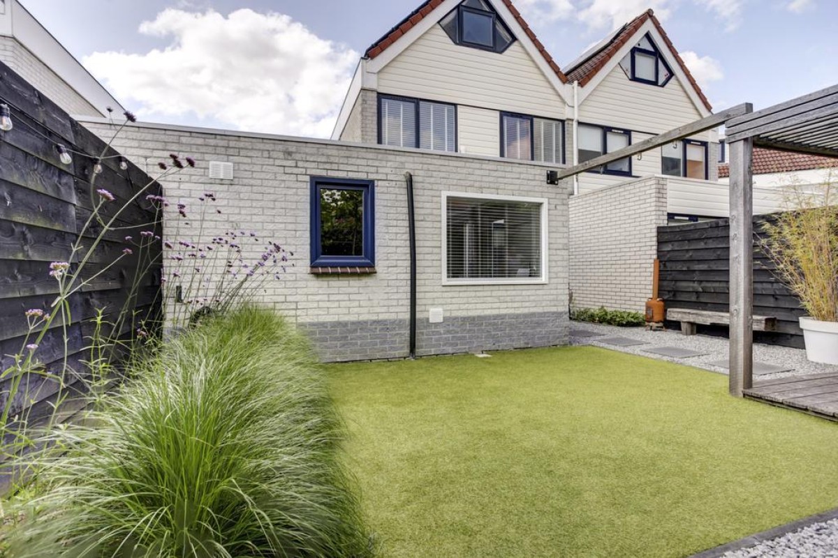Vanuit de keuken is er middels een loopdeur toegang tot de tuin en aan de keuken grenst een praktische lichte werkplek met uitzicht op de tuin. Vanuit de keuken is toegang tot de bijkeuken welke is voorzien van een plavuizen vloer en de nodige mogelijkheden biedt. Via de bijkeuken kom je binnendoor in de ruime aangebouwde stenen garage welke middels de lichtkoepel erg licht is. Verder is de garage voorzien van dubbele deuren naar de oprit, elektra en een wateraansluiting. Tevens bevindt zich hier de omvormer voor de zonnepanelen. De achtertuin is recent verzorgd aangelegd en biedt een kunstgrasgazon, vaste beplanting, strakke betegeling in siergrind en een heerlijk zonneterras met een fraaie pergola voorzien van shutters en een vlonderterras.