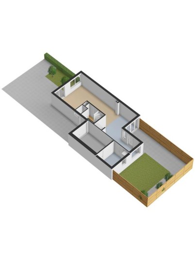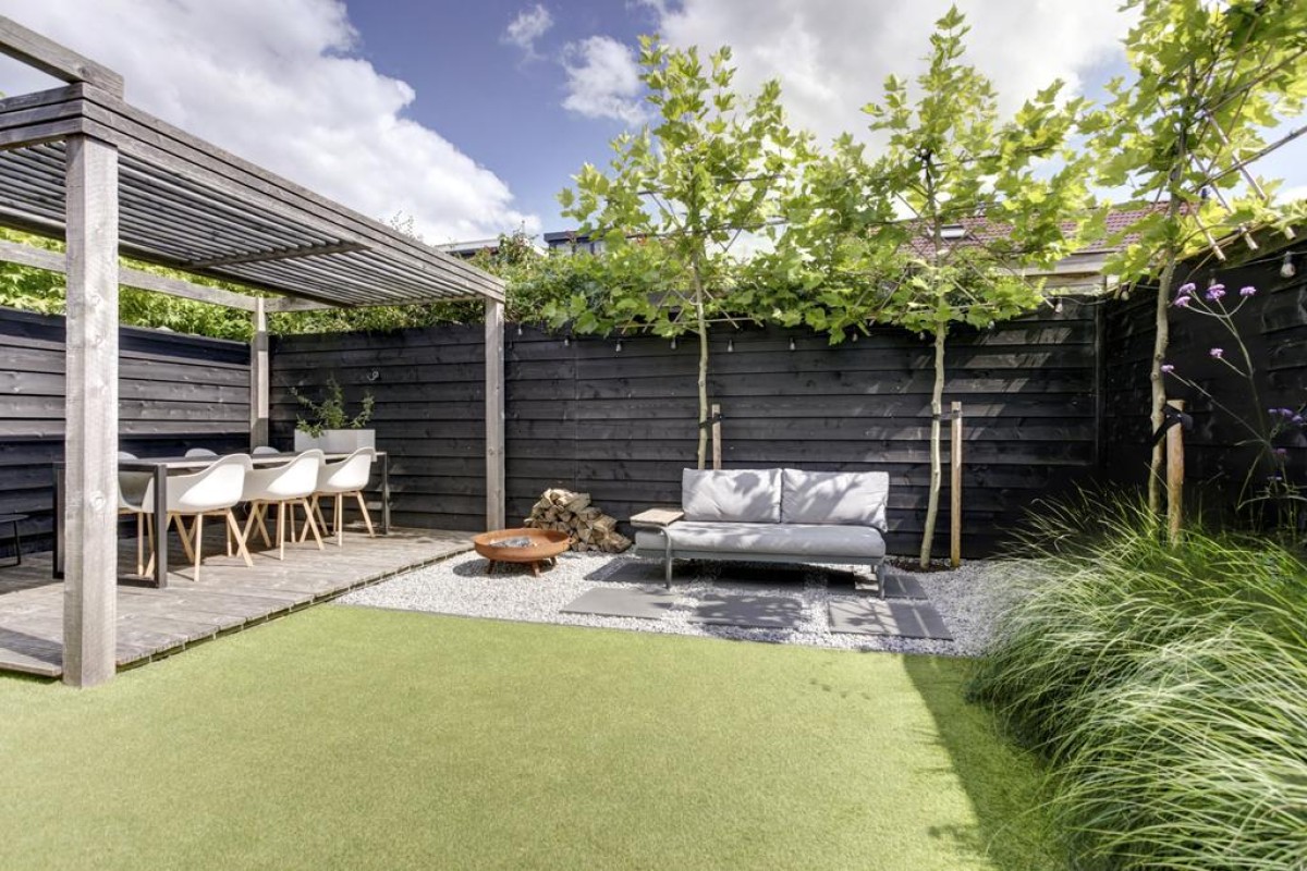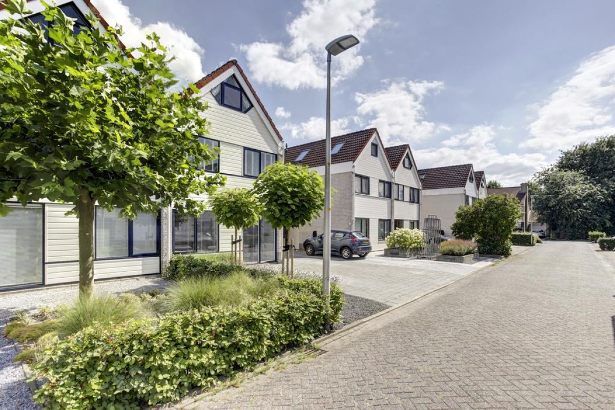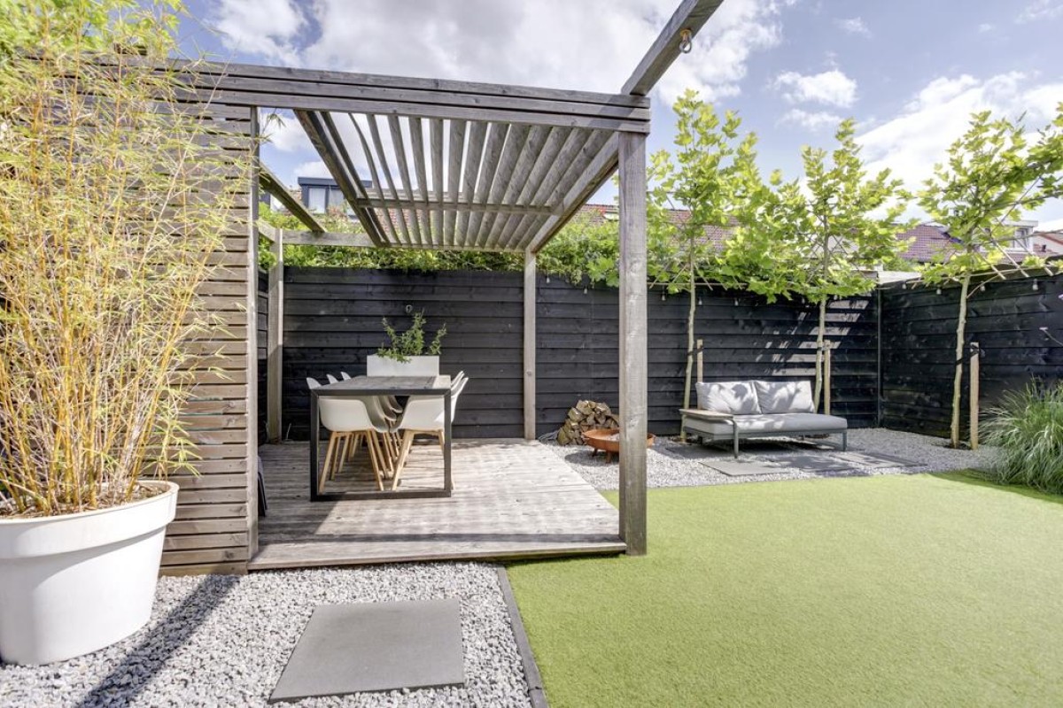Vanuit de keuken is er middels een loopdeur toegang tot de tuin en aan de keuken grenst een praktische lichte werkplek met uitzicht op de tuin. Vanuit de keuken is toegang tot de bijkeuken welke is voorzien van een plavuizen vloer en de nodige mogelijkheden biedt. Via de bijkeuken kom je binnendoor in de ruime aangebouwde stenen garage welke middels de lichtkoepel erg licht is. Verder is de garage voorzien van dubbele deuren naar de oprit, elektra en een wateraansluiting. Tevens bevindt zich hier de omvormer voor de zonnepanelen. De achtertuin is recent verzorgd aangelegd en biedt een kunstgrasgazon, vaste beplanting, strakke betegeling in siergrind en een heerlijk zonneterras met een fraaie pergola voorzien van shutters en een vlonderterras.