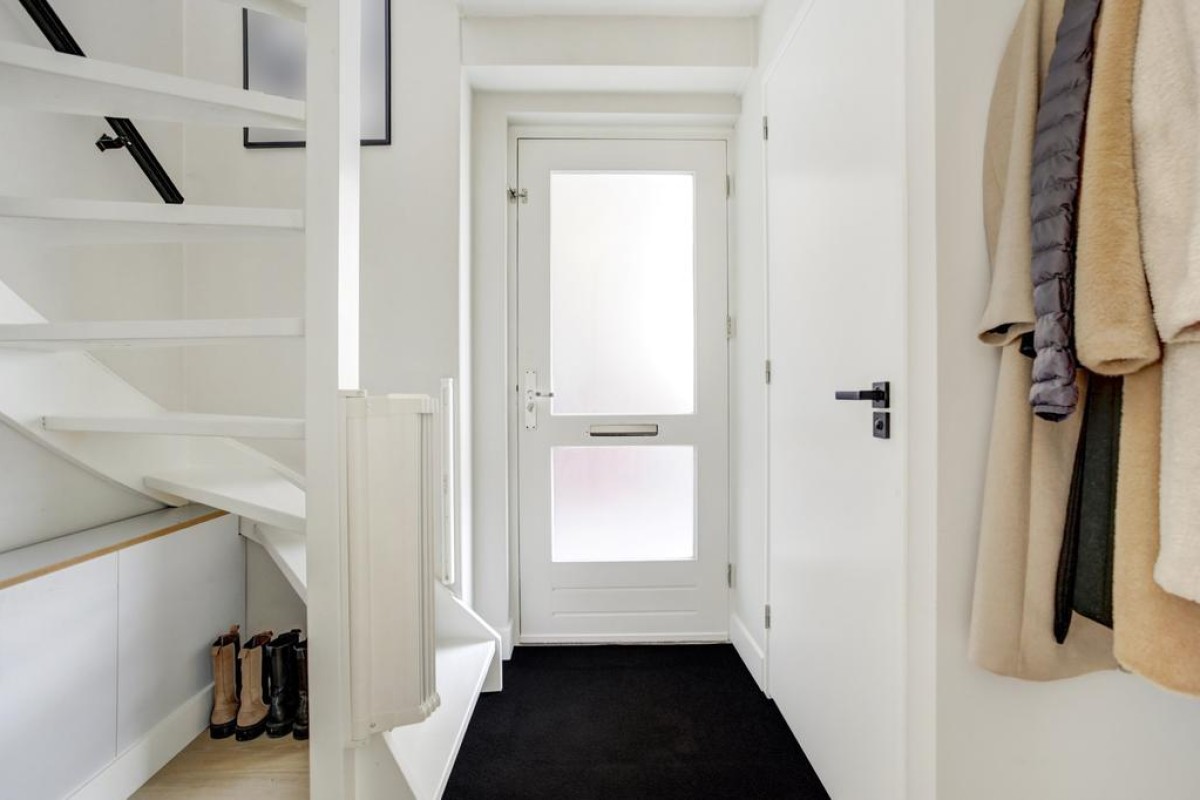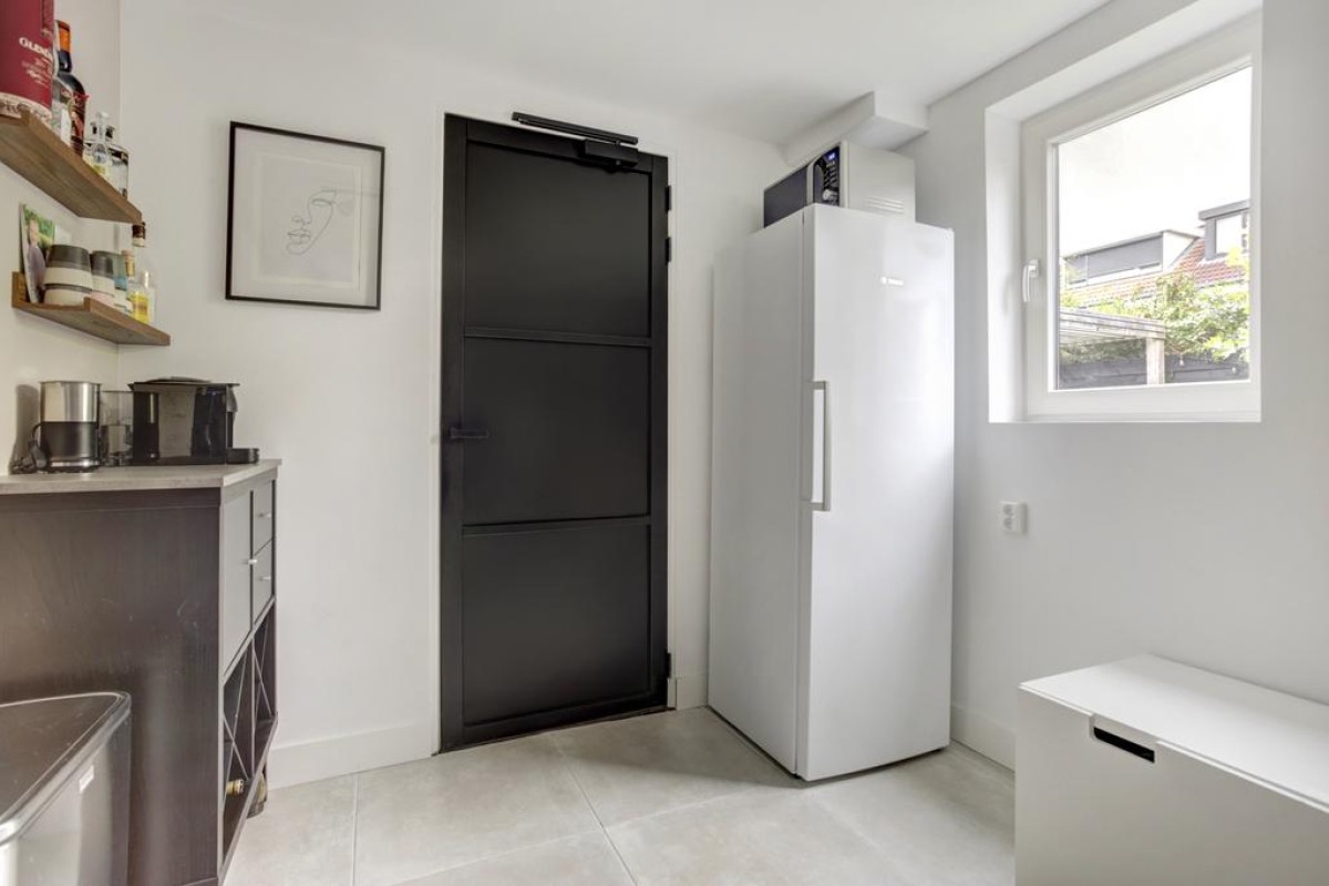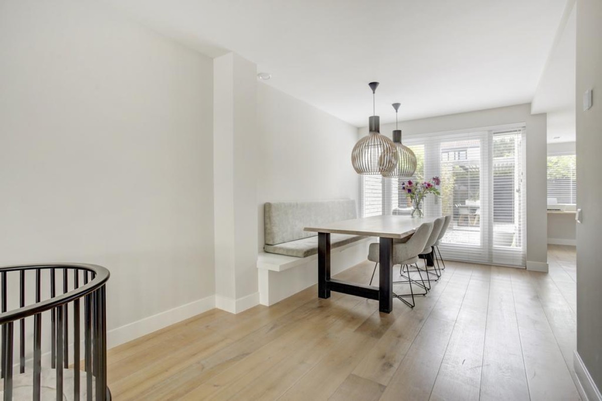 Begane grond: overdekt entree, lichte hal met garderobe, meterkast en moderne toiletruimte met hangcloset en fonteintje, middels een moderne glazen deur doorgang naar de ruime straatgerichte woonkamer met veel lichtinval middels de ramen tot aan de grond. De begane grondvloer is voorzien van een fraaie eiken houten vloer met vloerverwarming. Aan de achterzijde van de woning is de ruime eethoek gelegen welke een vaste bank aan de wand heeft en zicht op de fraaie tuin. Middels openslaande deuren loop je zo de mooi aangelegde tuin in. Aangrenzend aan de eethoek bevindt zich de vernieuwde luxe keuken. De keuken is in een rechte opstelling opgesteld en afgewerkt met een licht composiet werkblad en strakke zwarte fronten. De keuken beschikt over "studioLine" Siemens inbouw apparatuur waaronder een ingebouwde koelkast met vriesvak, een oven, een vaatwasser en een 5-pits inductie kookplaat met een Novy afzuigschouw.