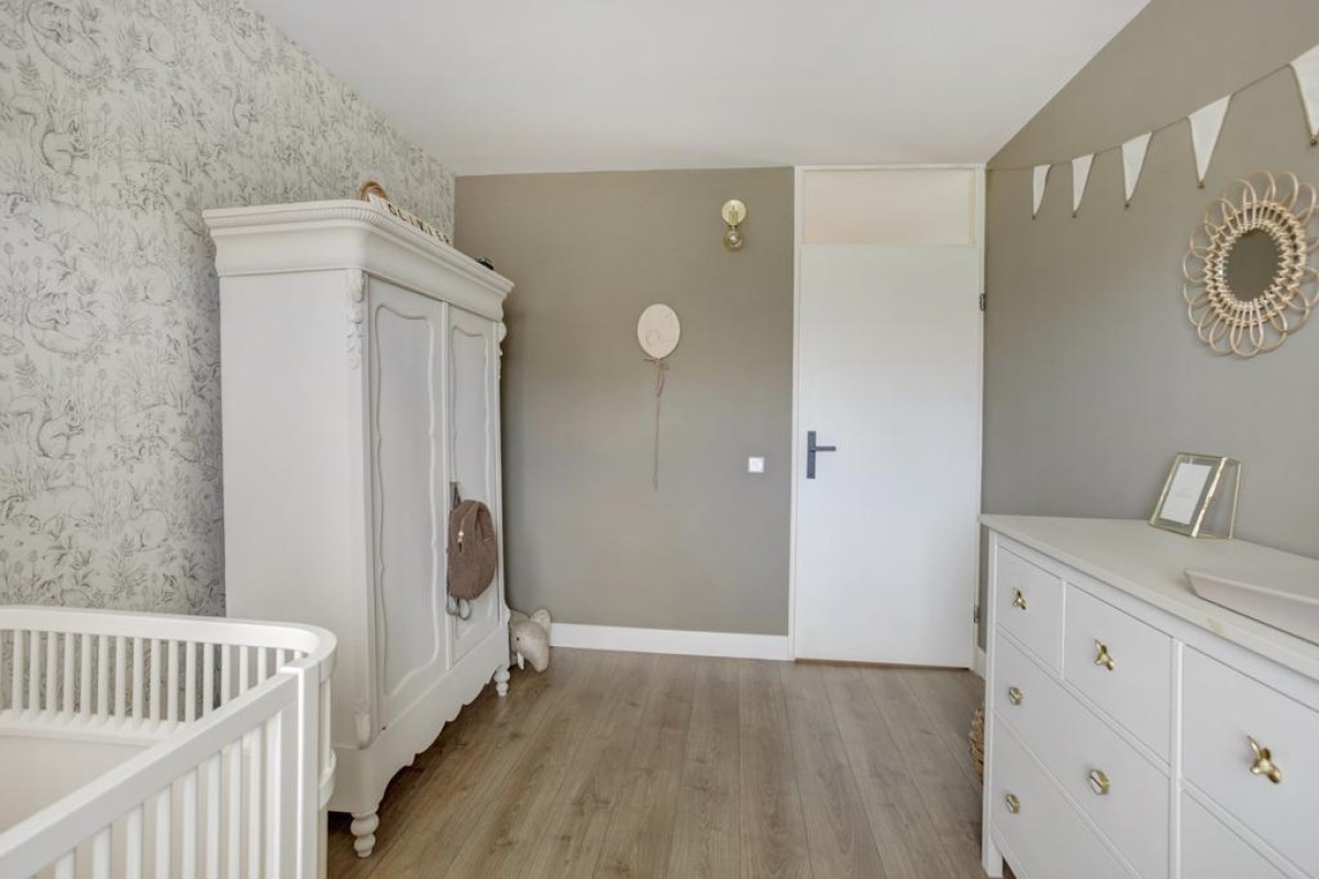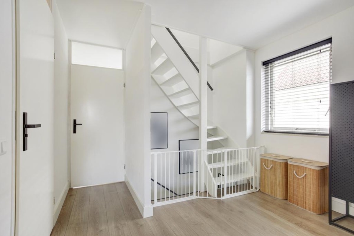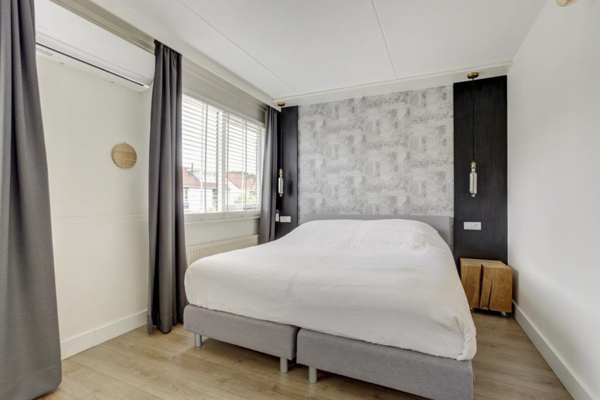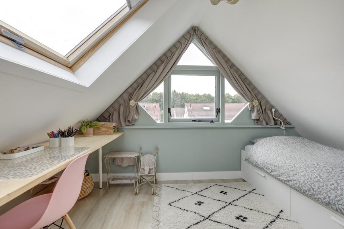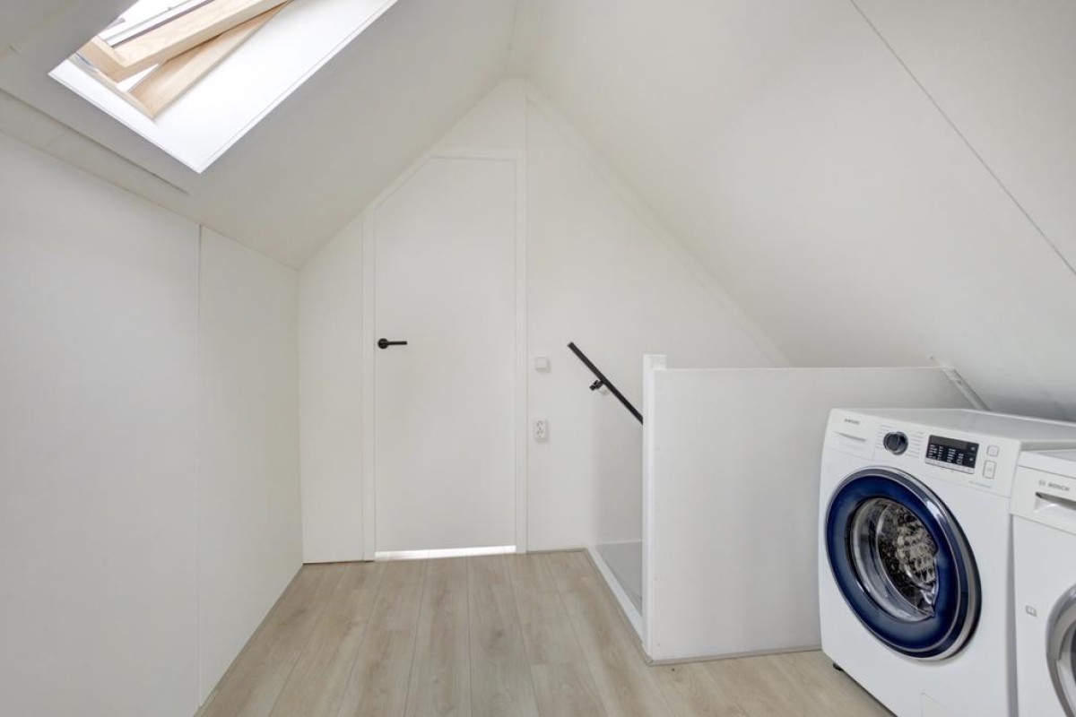 Tweede verdieping: middels een vaste trap is de royale zolderverdieping bereikbaar, waar mede door de aanwezigheid van een dakvenster een lichte voorzolder met opstelplaats van de wasapparatuur is. Zowel aan de voorzijde van de woning alsmede aan de achterzijde zijn nog een 4e en 5e slaapkamer welke recent (2023 en 2022) van een nieuw Velux dakraam zijn voorzien en in een van de kamers is in een kast de c.v.-ketel opgesteld. Achter de knieschotten is veel bergruimte beschikbaar en de gehele etage is afgewerkt met een lichte laminaatvloer.
