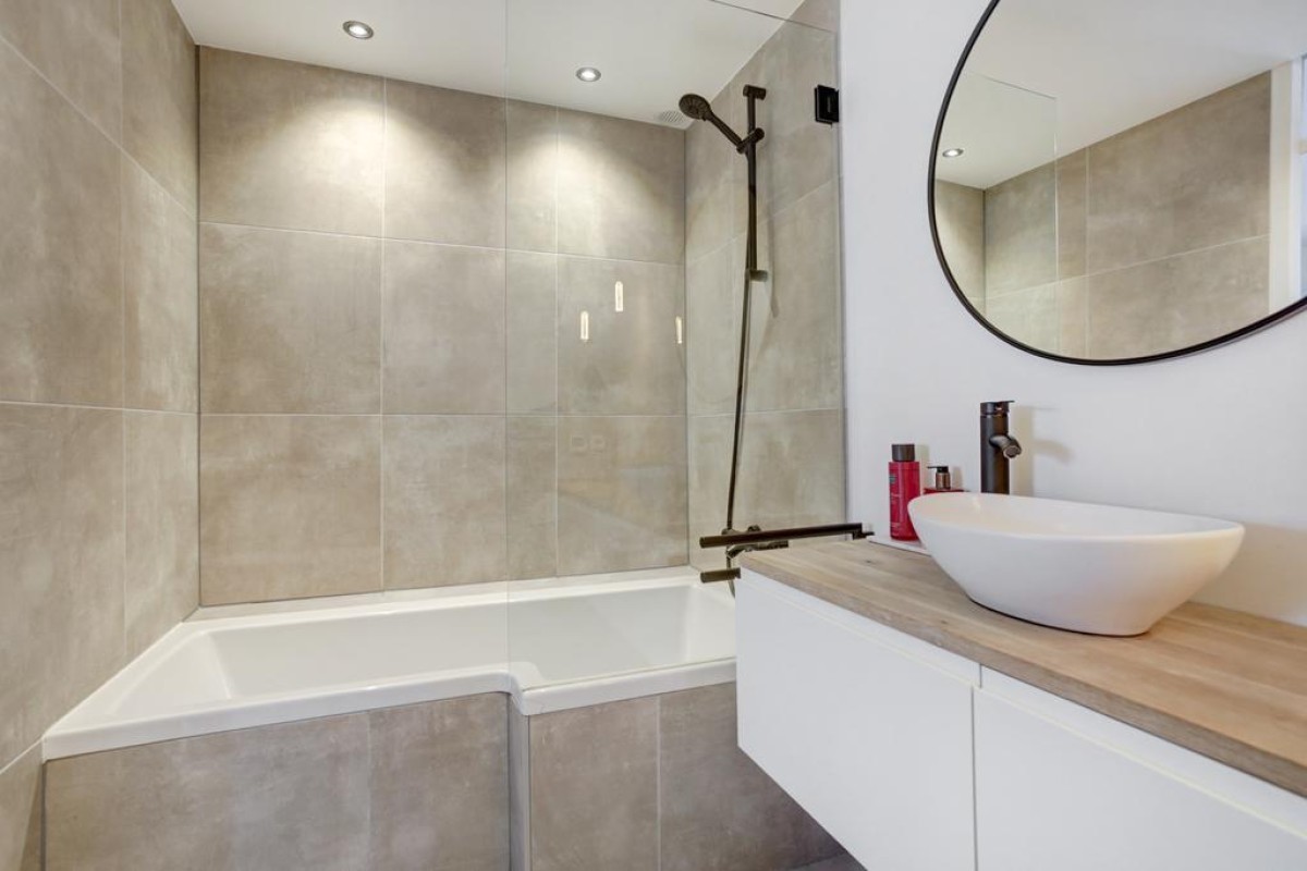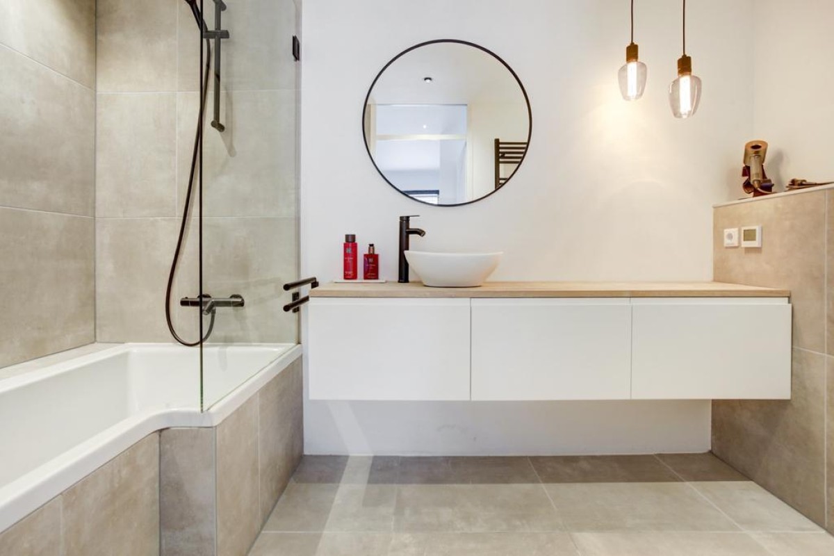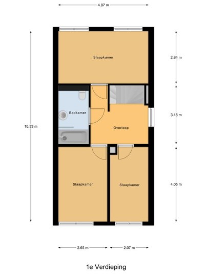 Eerste verdieping: vaste trap naar de ruime overloop met aansluitend 3 mooie slaapkamers en de moderne badkamer. De ouderslaapkamer is voorzien van airconditioning welke kan koelen en verwarmen. De overloop en slaapkamers beschikken over een moderne doorgelegde lichte laminaatvloer. De luxe badkamer is voorzien van een 2e hangcloset, designradiator, een breed wastafelmeubel met een waskom, en een douche-in-bad combinatie met glazen scherm.