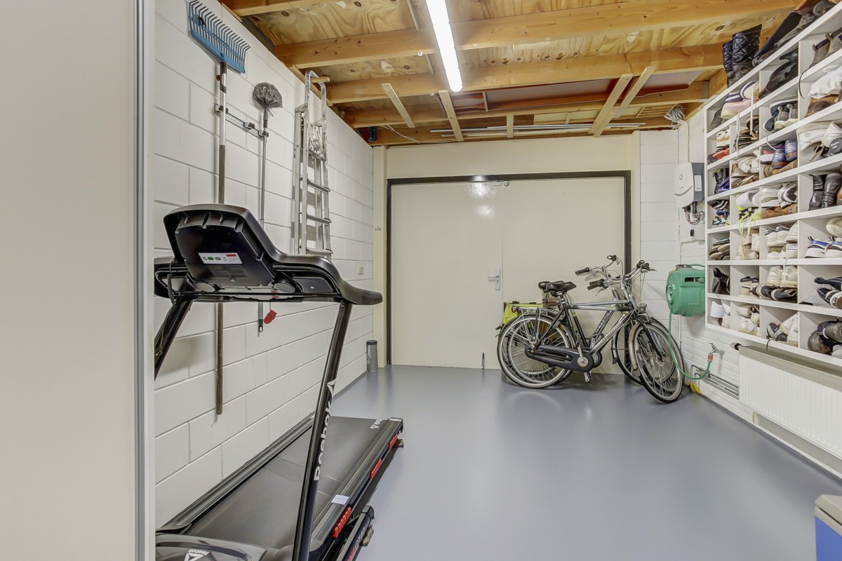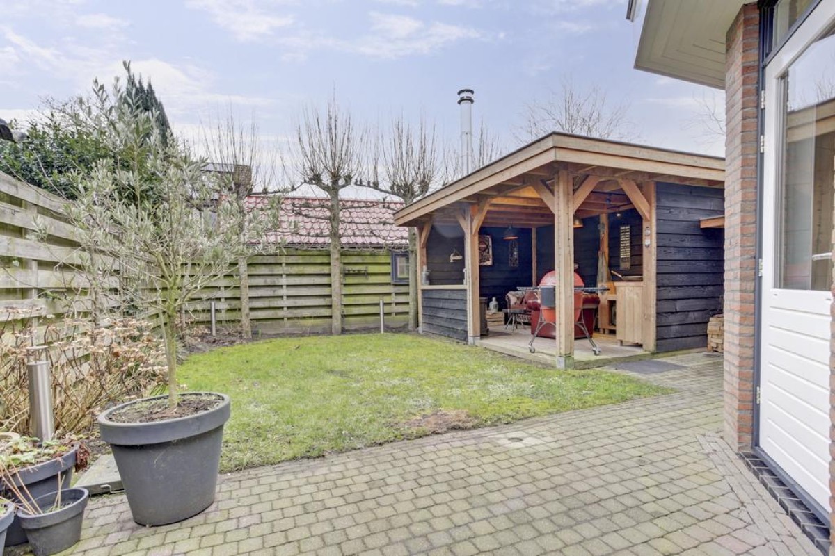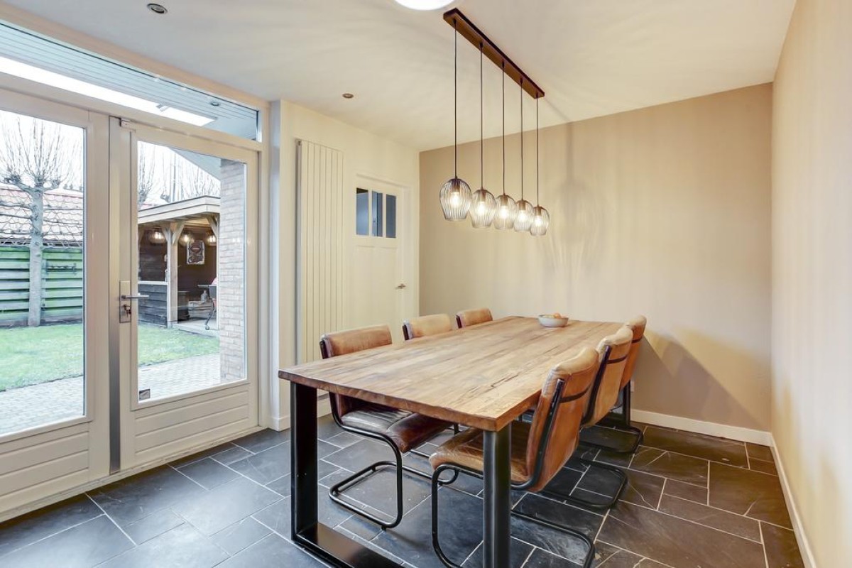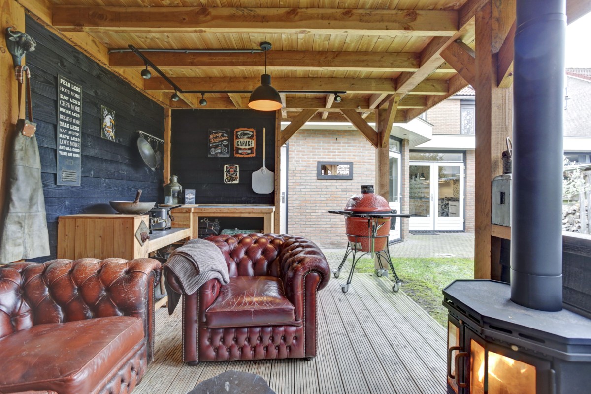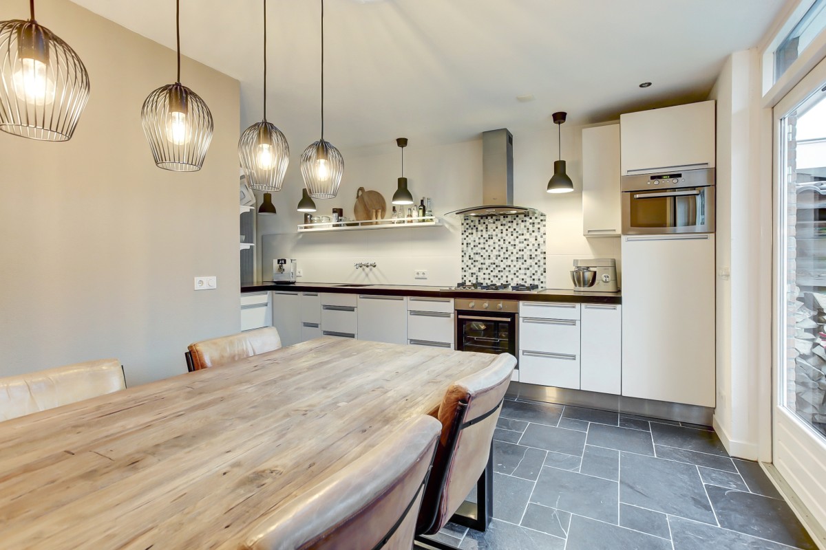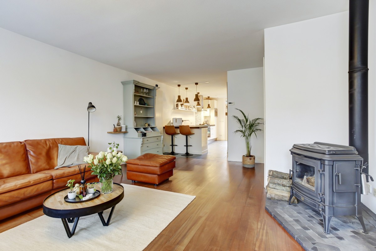 Begane grond: overdekt entree, lichte hal met garderobe, meterkast, toiletruimte met hangcloset en fonteintje, doorgang naar de ruime straatgerichte woonkamer met veel lichtinval. De woonkamer heeft een sfeervolle houtkachel en een praktische trapkast. De vloer is voorzien van een fraaie houten lamellen parket vloer. Aan de achterzijde van de woning is de woning uitgebouwd en biedt een ruime keuken met openslaande deuren naar de tuin, een eethoek, een solartube welke voor veel daglicht zorgt en een natuurstenen vloer met vloerverwarming. De keuken is uitgevoerd in een hoekopstelling met een gezellige ontbijtbar en afgewerkt met een granieten werkblad, lichte fronten en ingebouwde kranen. De keuken beschikt over een ingebouwde koelkast, een oven, combimagnetron, een vaatwasser en een 5-pits RVS gaskookplaat met een RVS afzuigkap. Vanuit de keuken heeft u toegang tot de bijkeuken met opstelplaats voor de wasmachine, droger en is voorzien van een klein keukenblokje met warm en koud water en een ingebouwde koel-vriescombinatie. De bijkeuken is voorzien van een plavuizen vloer. Via de bijkeuken kunt u naar de garage en naar de tuin. De garage heeft openslaande houten deuren nar de oprit, is geïsoleerd en voorzien van een betonvloer, een waterpunt, verwarming, een klein keukenblokje en heeft een deur naar de tuin. De zonnige tuin is onderhoudsarme aangelegd en voorzien van een terras, een gazon, vaste beplanting en een fraaie overkapping met vlonderterras, een buitenkeuken en houtkachel.