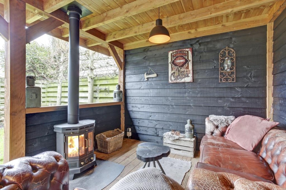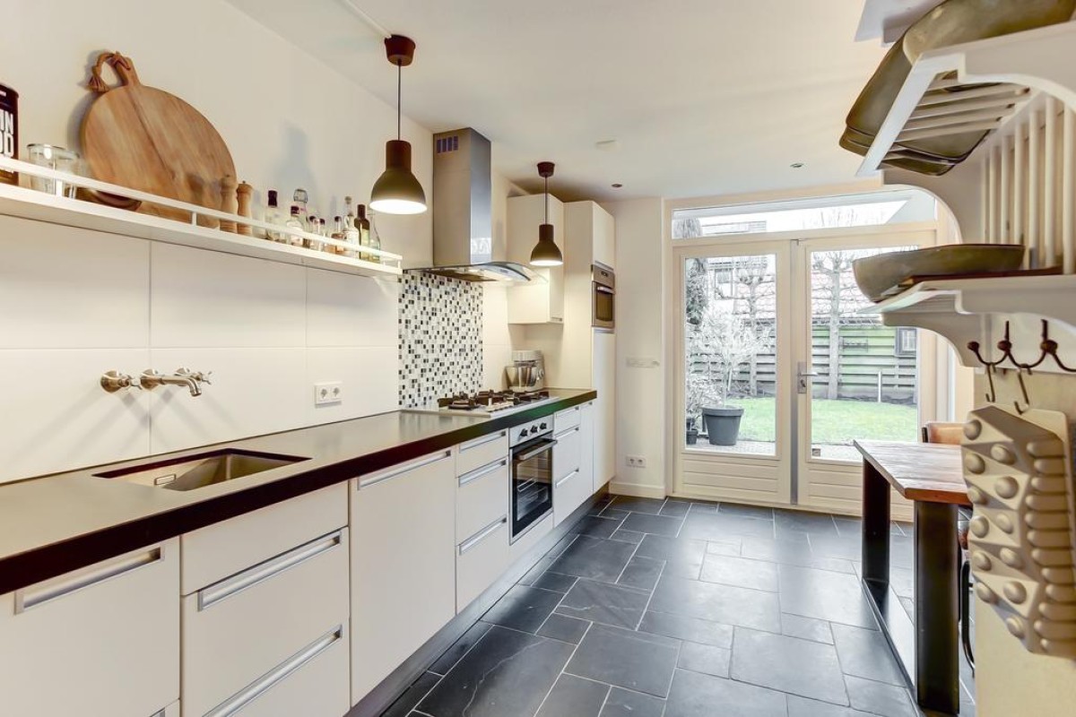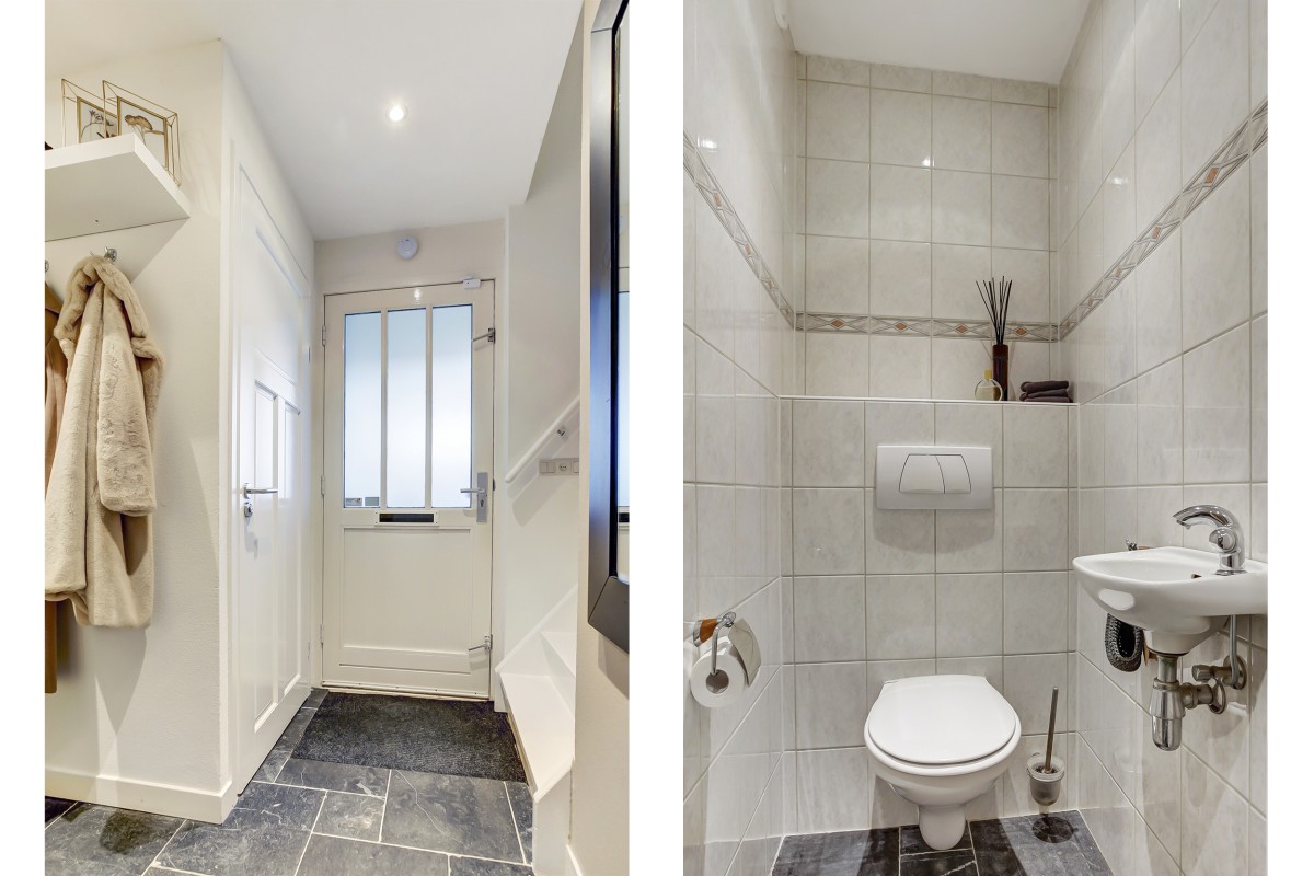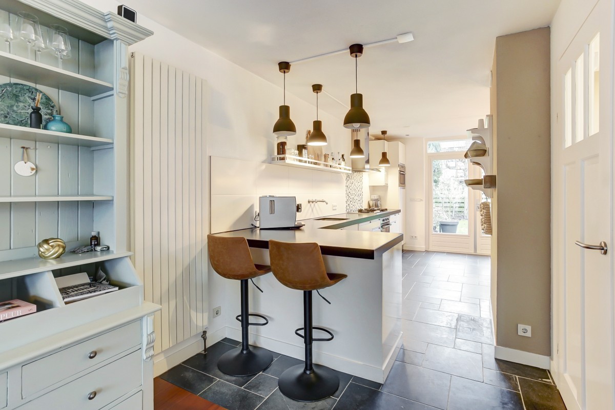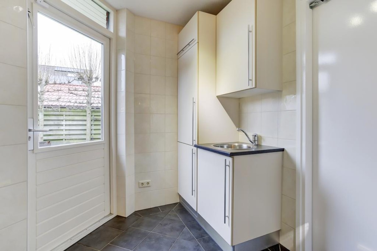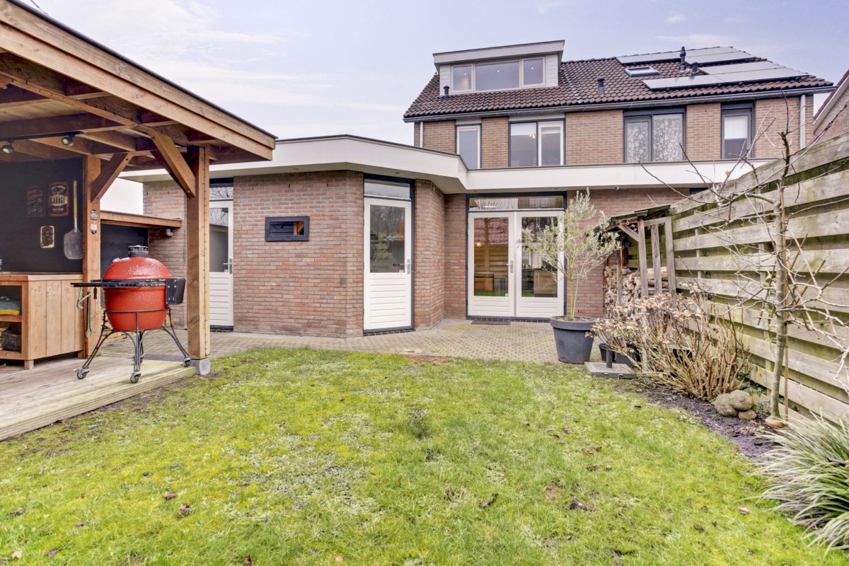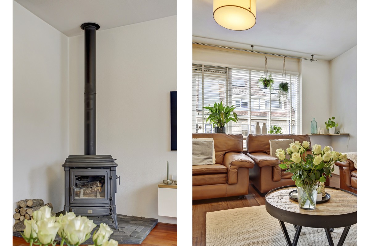 Begane grond: overdekt entree, lichte hal met garderobe, meterkast, toiletruimte met hangcloset en fonteintje, doorgang naar de ruime straatgerichte woonkamer met veel lichtinval. De woonkamer heeft een sfeervolle houtkachel en een praktische trapkast. De vloer is voorzien van een fraaie houten lamellen parket vloer. Aan de achterzijde van de woning is de woning uitgebouwd en biedt een ruime keuken met openslaande deuren naar de tuin, een eethoek, een solartube welke voor veel daglicht zorgt en een natuurstenen vloer met vloerverwarming. De keuken is uitgevoerd in een hoekopstelling met een gezellige ontbijtbar en afgewerkt met een granieten werkblad, lichte fronten en ingebouwde kranen. De keuken beschikt over een ingebouwde koelkast, een oven, combimagnetron, een vaatwasser en een 5-pits RVS gaskookplaat met een RVS afzuigkap. Vanuit de keuken heeft u toegang tot de bijkeuken met opstelplaats voor de wasmachine, droger en is voorzien van een klein keukenblokje met warm en koud water en een ingebouwde koel-vriescombinatie. De bijkeuken is voorzien van een plavuizen vloer. Via de bijkeuken kunt u naar de garage en naar de tuin. De garage heeft openslaande houten deuren nar de oprit, is geïsoleerd en voorzien van een betonvloer, een waterpunt, verwarming, een klein keukenblokje en heeft een deur naar de tuin. De zonnige tuin is onderhoudsarme aangelegd en voorzien van een terras, een gazon, vaste beplanting en een fraaie overkapping met vlonderterras, een buitenkeuken en houtkachel.