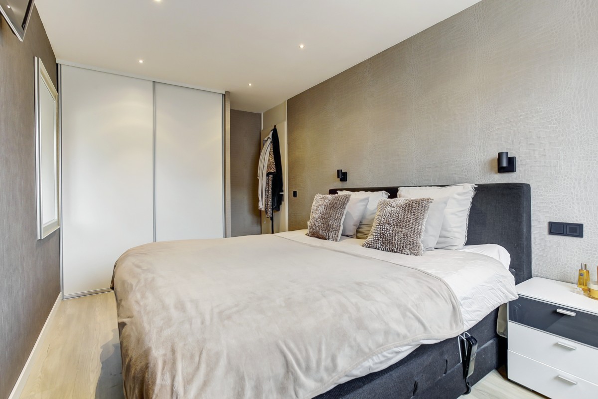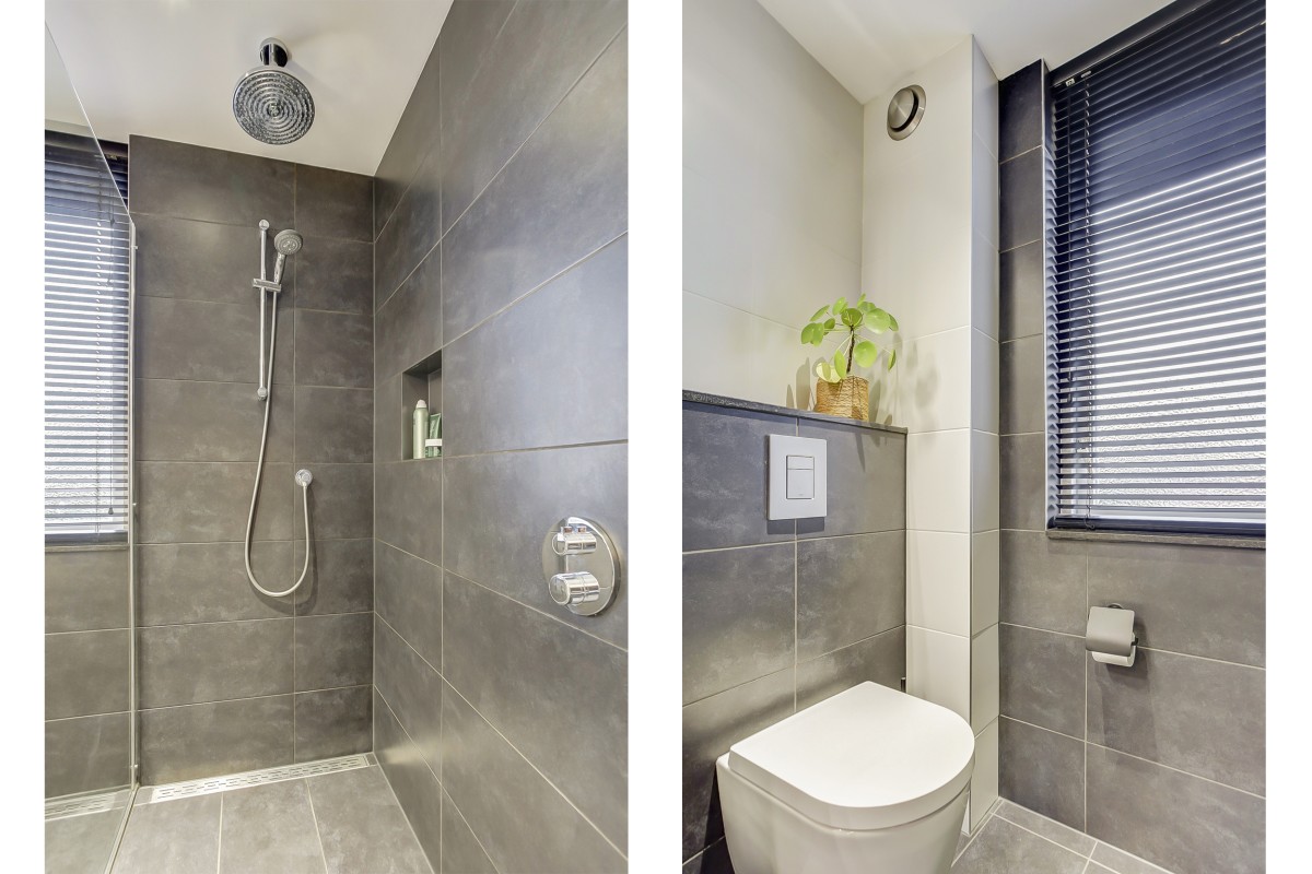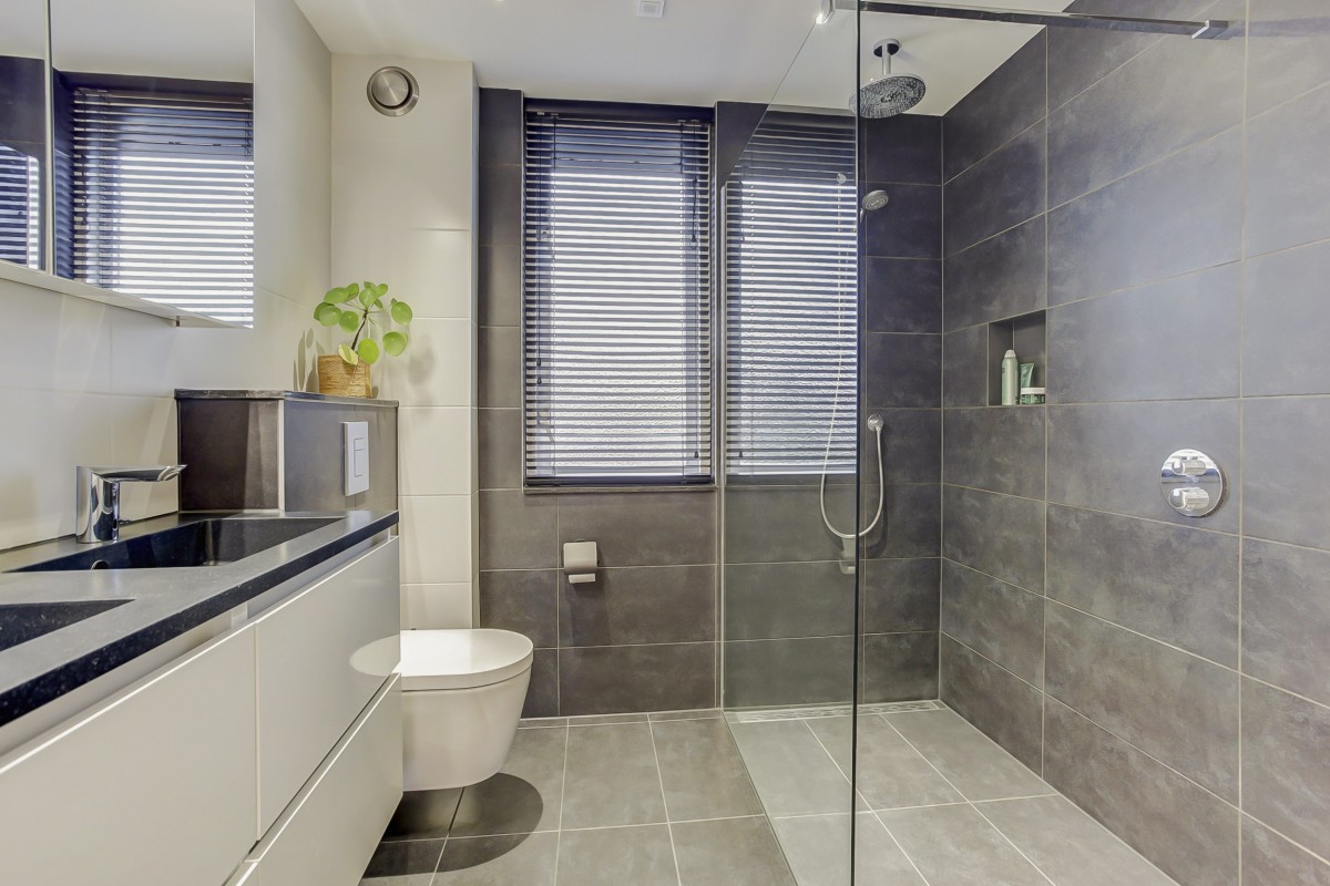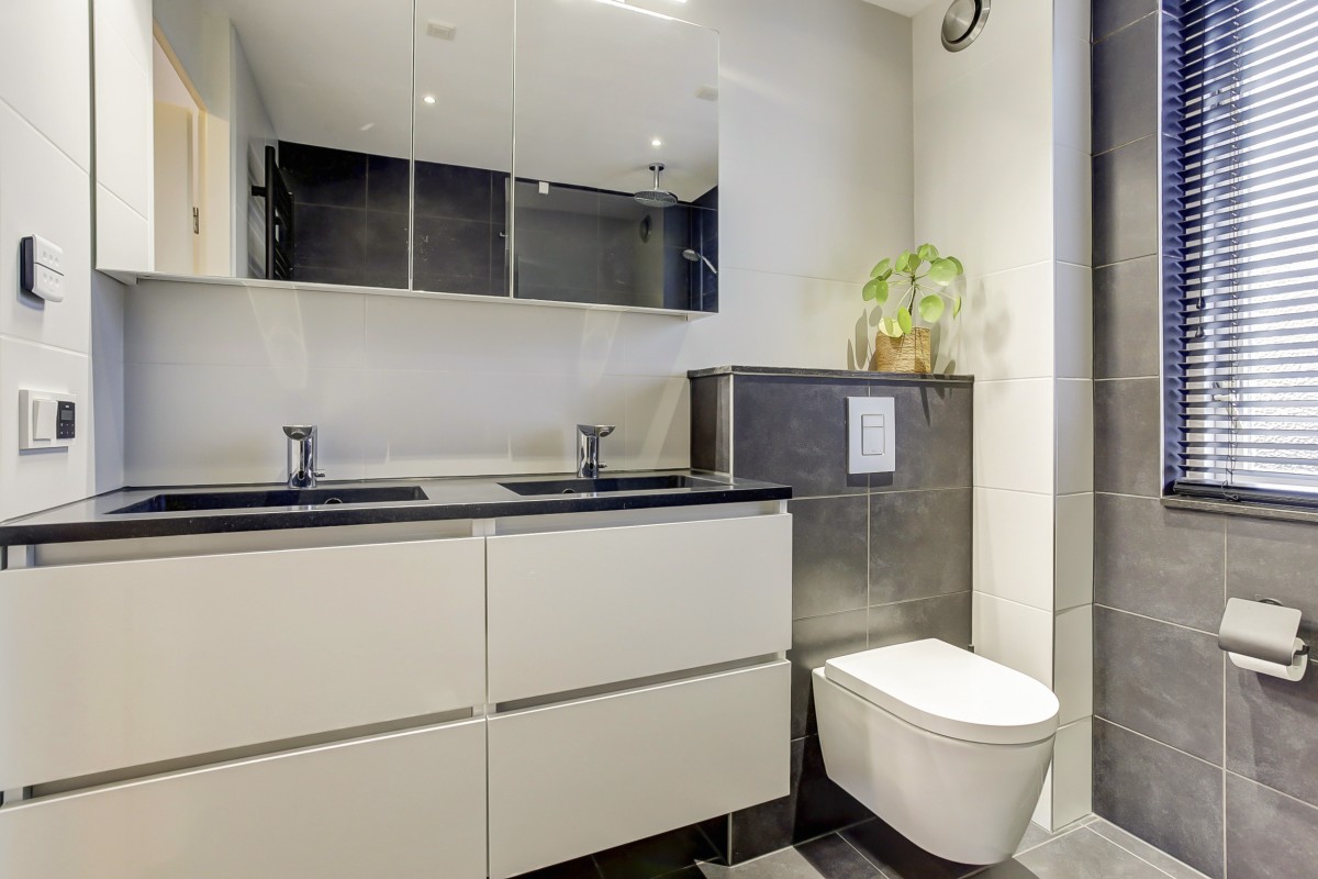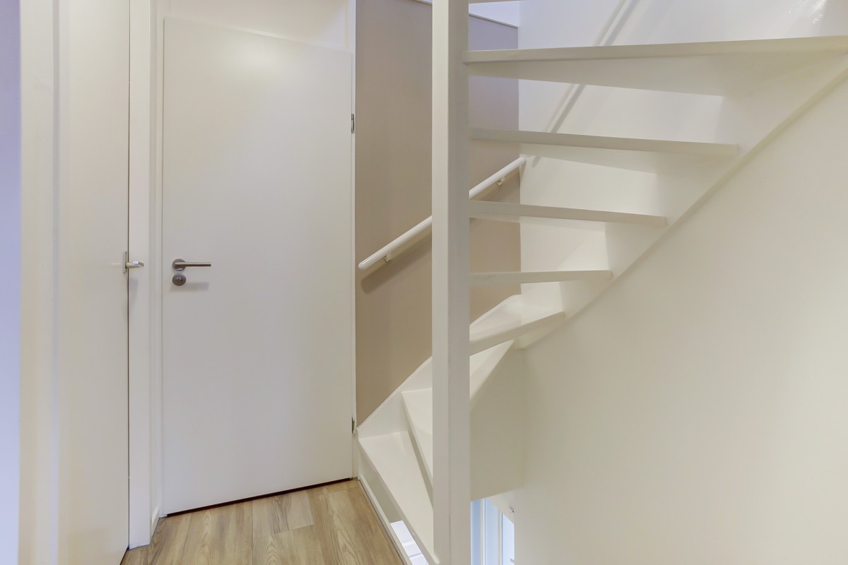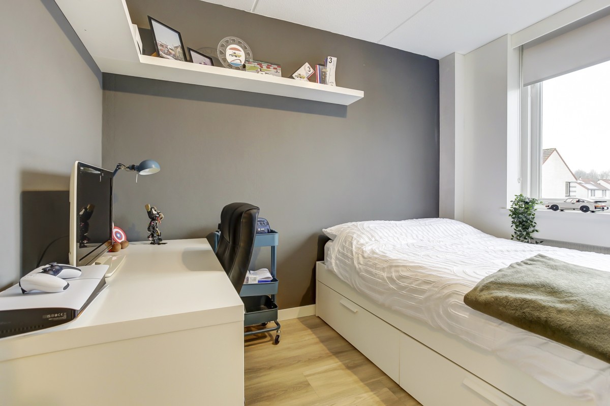 Eerste verdieping: vaste trap naar de ruime overloop met aansluitend 3 mooie slaapkamers en de moderne badkamer. De ouderslaapkamer is voorzien van een verlaagd plafond met ingebouwde spots, een vaste kast, radiator ombouw en een ingebouwde radio. De overloop en slaapkamers beschikken over een moderne doorgelegde lichte pvc vloer. De luxe badkamer is voorzien van een inloopdouche met regen- en handdouche en een ingebouwde nis, 2e hangcloset, designradiator, ingebouwde radio, een dubbel wastafelmeubel met elektronische kranen en vloerverwarming.