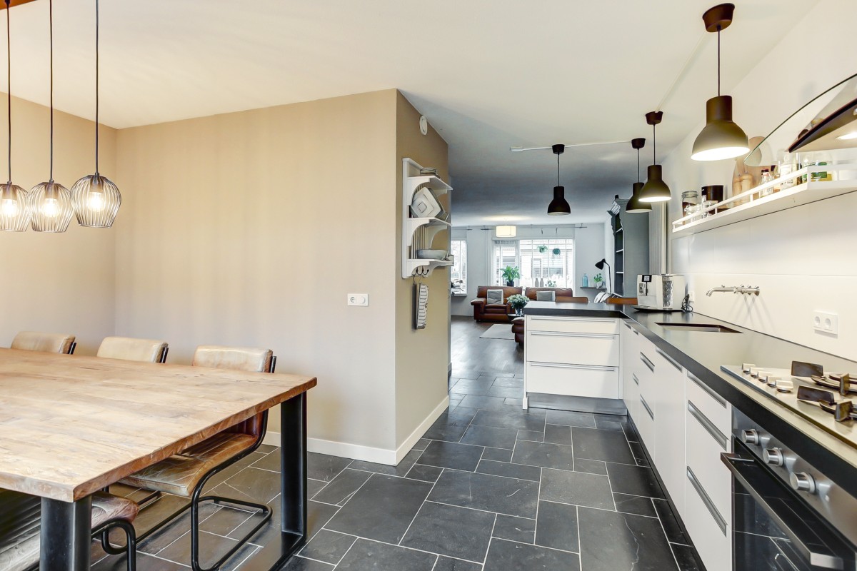 * Uitgebouwde woonkeuken met natuurstenen vloer met vloerverwarming