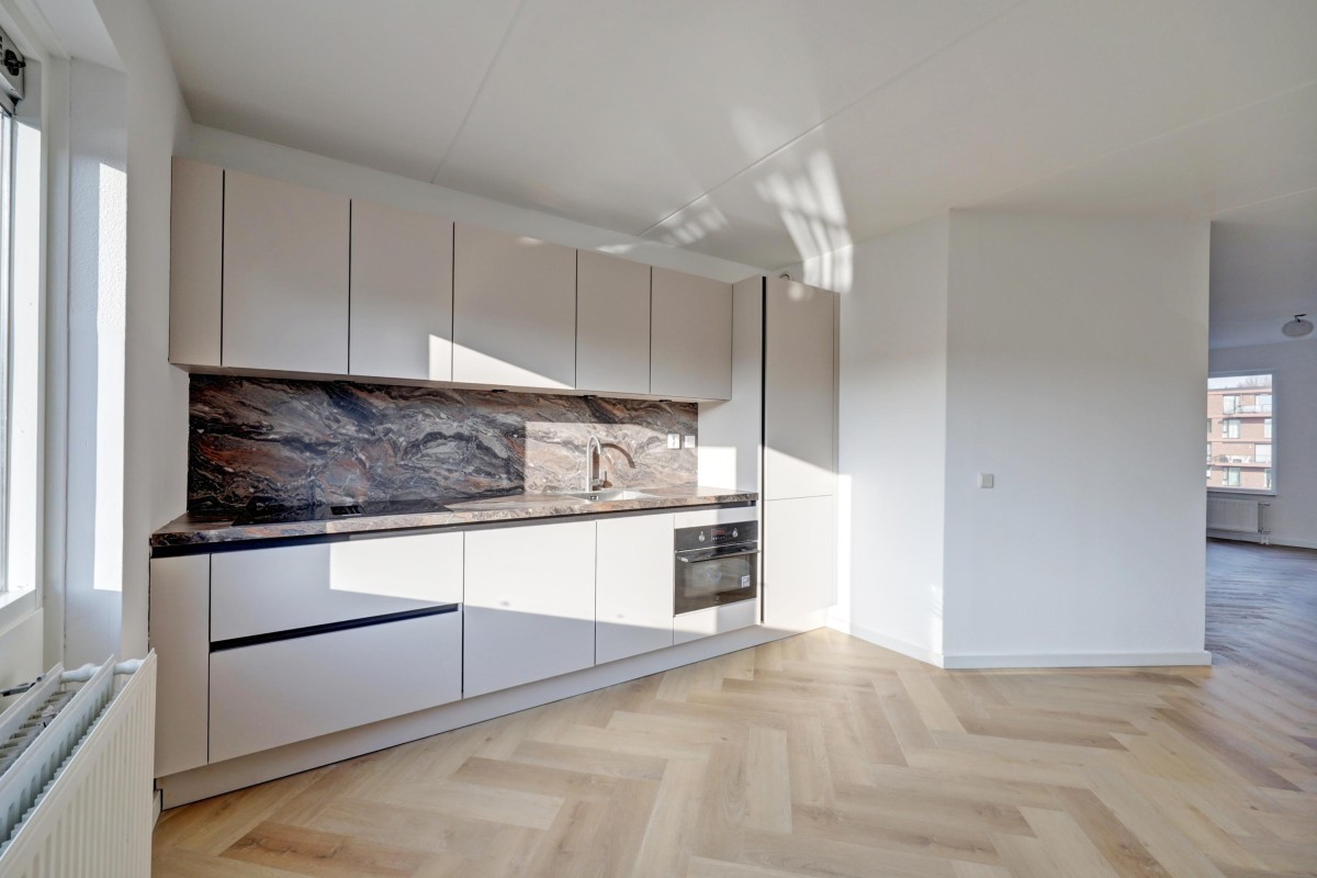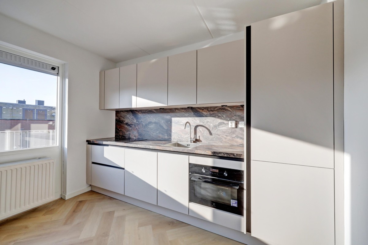 De moderne keuken is in een rechte opstelling geplaatst en voorzien van strakke witte fronten met een fraai marmerlook werkblad en spatwand. De keuken is voorzien van een ingebouwd koel-/vriescombinatie, een oven, een vaatwasser, een Bora inductie kookplaat met down-draft afzuiging. Vanuit de keuken is middels een loopdeur de doorgang naar het riante zonneterras op het zuiden. Het gehele appartement is voorzien van een fraaie pvc visgraatvloer. (2025)