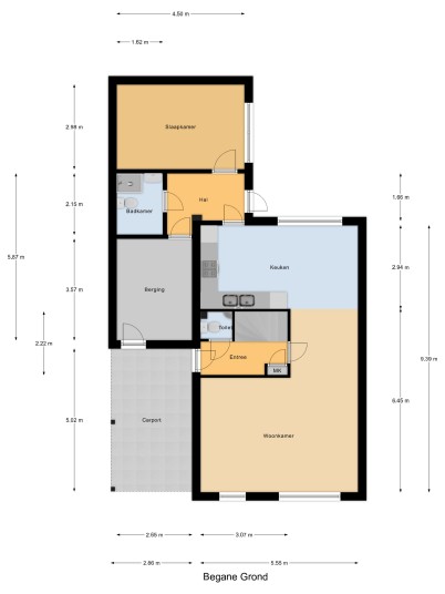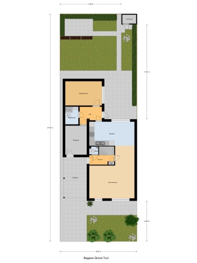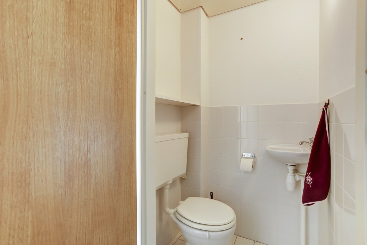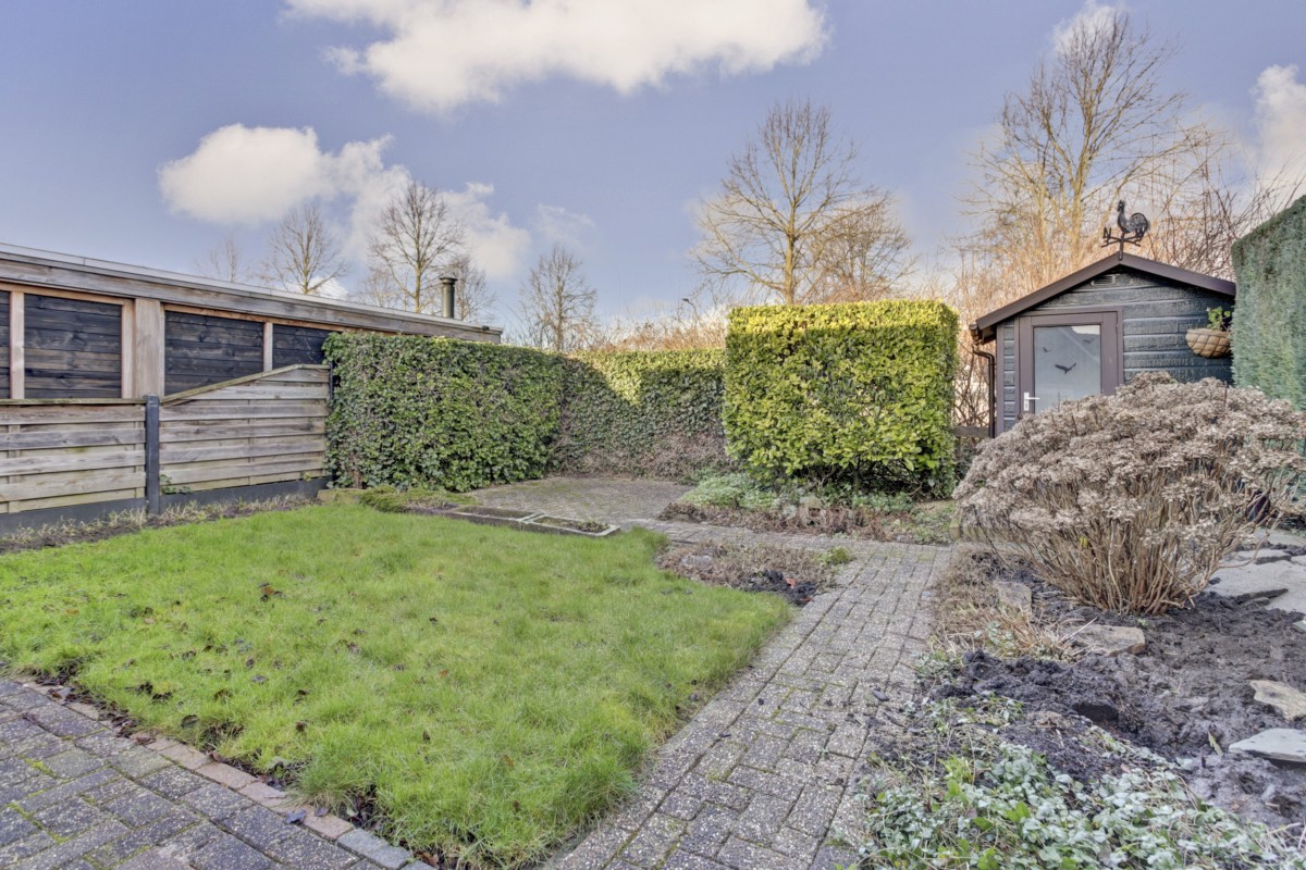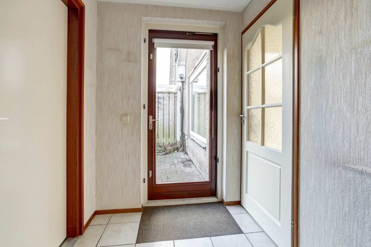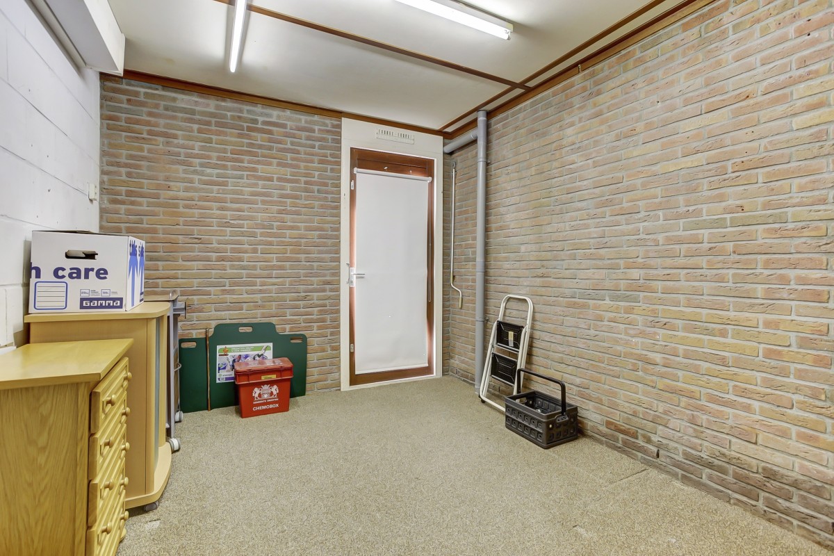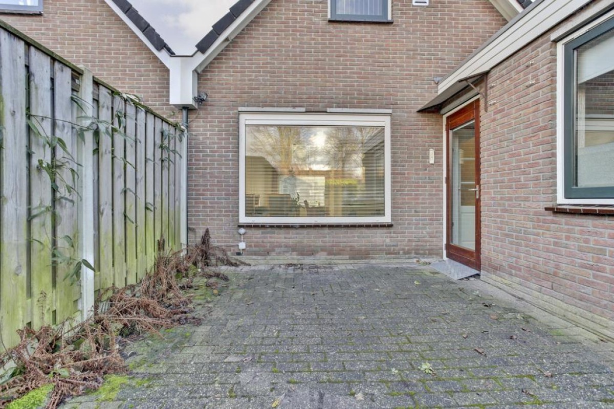 Begane grond: overdekt entree, hal met garderobe, toiletruimte met toilet en fonteintje, meterkast en doorgang naar de straatgerichte woonkamer. Aan de achterzijde van de woning is de eethoek gelegen met aansluitende de hoekopgestelde keuken welke voorzien is van een groot werkblad en ingebouwde apparatuur. Aan de achterzijde van de woning is tevens een ruime slaapkamer met aangrenzende badkamer gesitueerd. De badkamer beschikt over een douche met cabine, wastafel en 2e toilet. De tuin is vanuit de bijkeuken alsmede te betreden en voorzien van een vrijstaande houten berging. Aan de voorzijde van de woning is binnendoor een inpandige berging bereikbaar. De begane grond is voorzien van een tegelvloer gecombineerd met vloerbedekking in de slaapkamer.