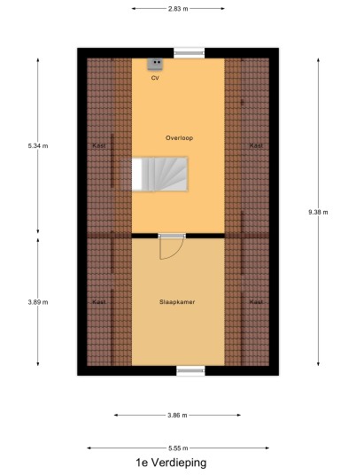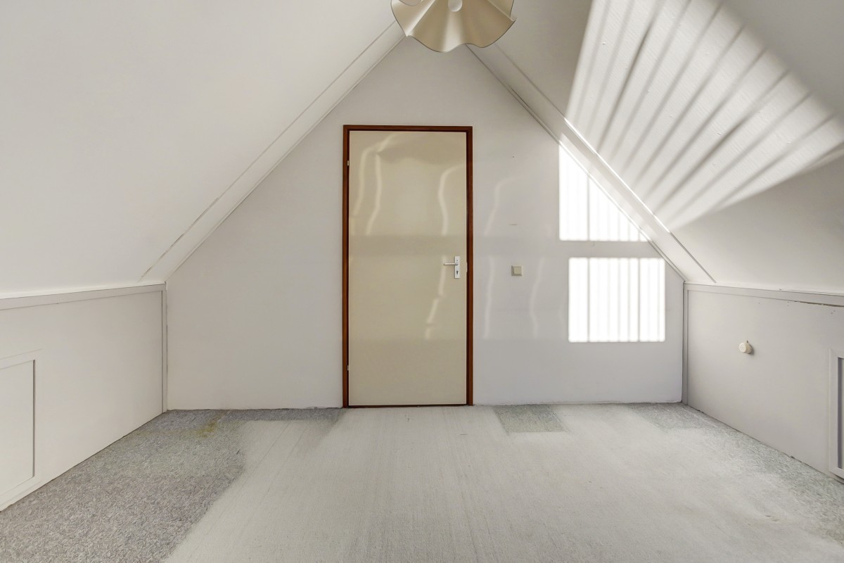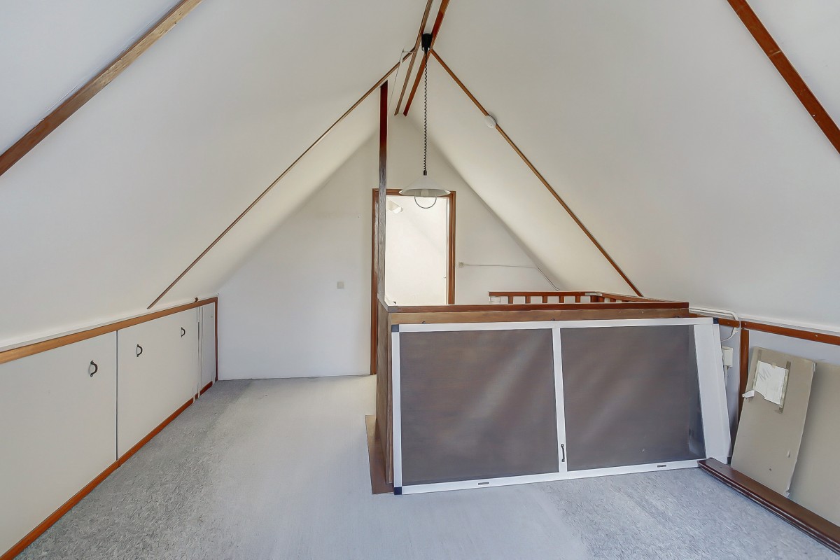 Eerste verdieping: vaste trap naar de overloop met aansluitend een ruime slaapkamer aan de voorzijde. Aan de achterzijde is ruime overloop met c.v.-ketel gesitueerd. Achter de knieschotten is de nodige bergruimte beschikbaar.