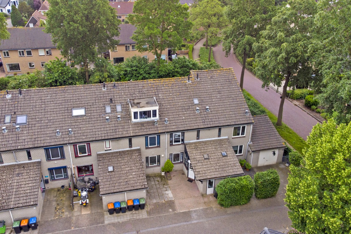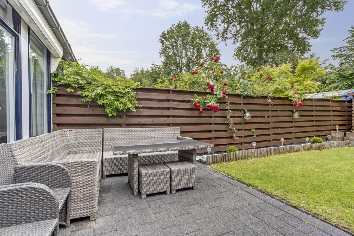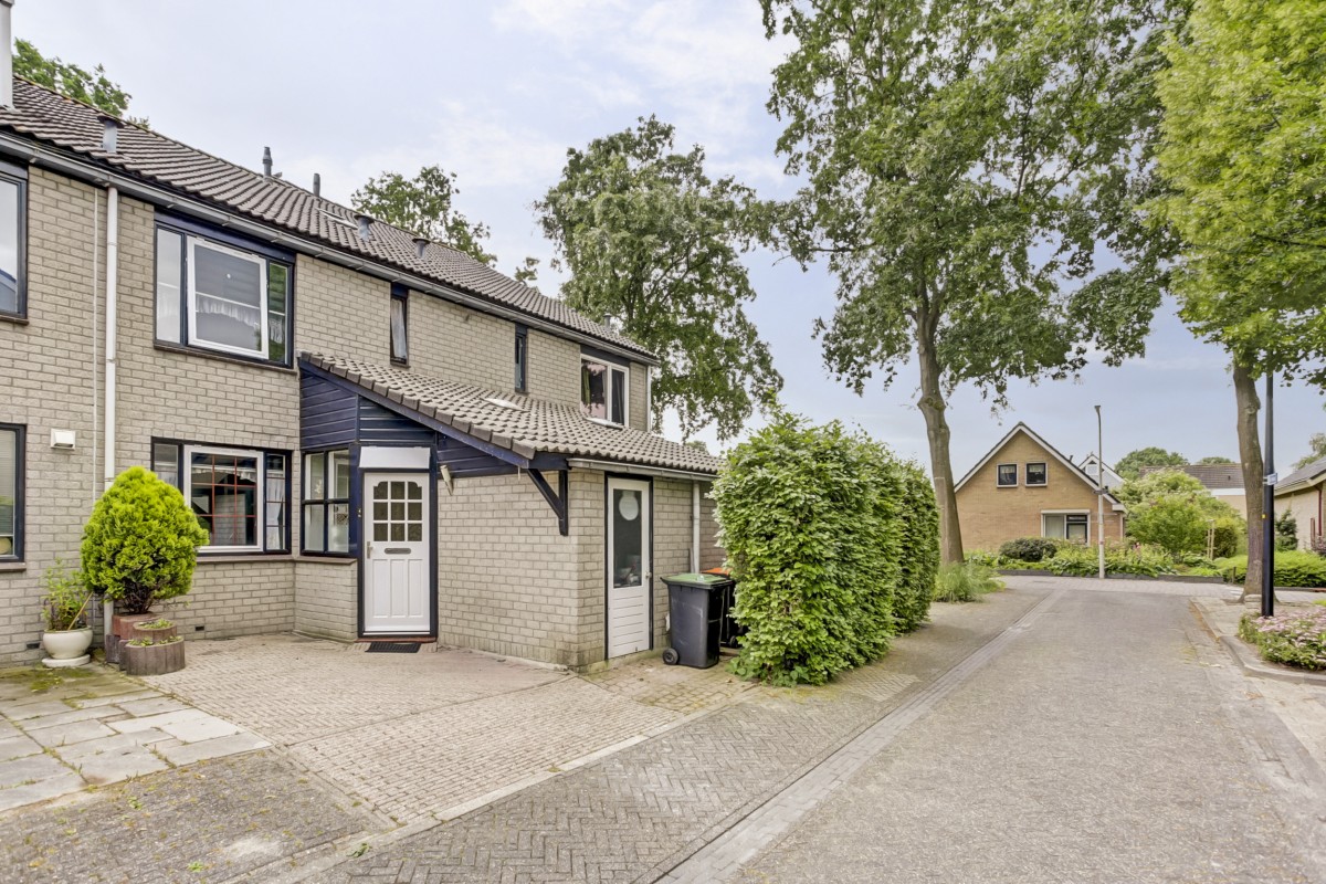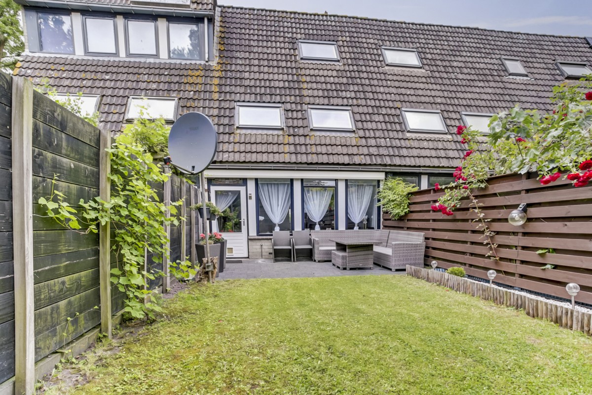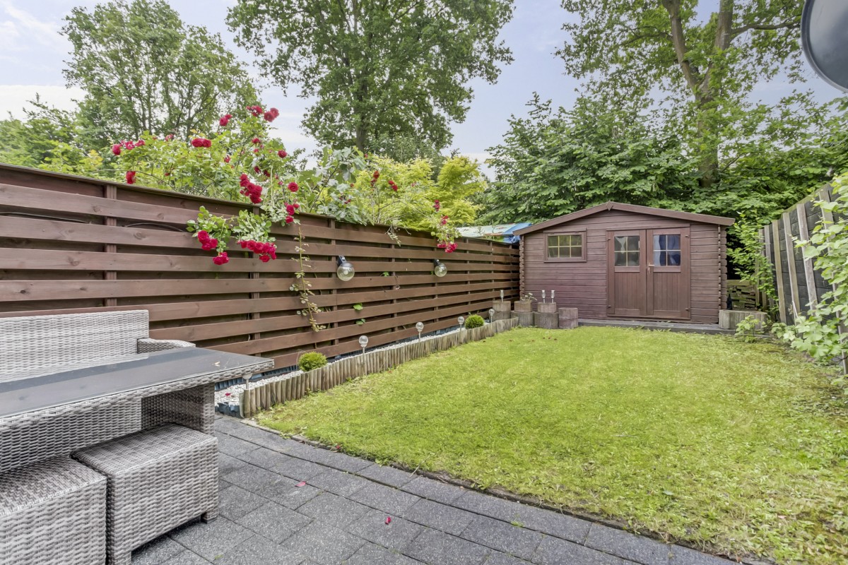 Begane grond: overdekt entree, hal met garderobe en meterkast, binnendoor naar de berging, straatgerichte halfopen keuken in een U-vorm opgesteld en voorzien van een los fornuis met oven en gaskookplaat, een rvs afzuigkap en een ingebouwde vaatwasser en een losse koelkast. Aan de achterzijde van de woning is de tuingerichte woonkamer gesitueerd welke door de grote raampartijen heerlijk licht is. Een loopdeur naar de zonnige tuin welke voorzien is van een terras met zonnescherm, gazon, borders en houten tuinhuis. De tuin biedt veel privacy omdat de tuin aan de achterzijde grenst aan de bosstrook.
