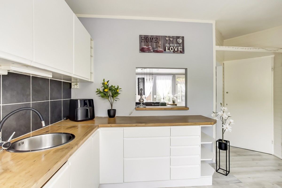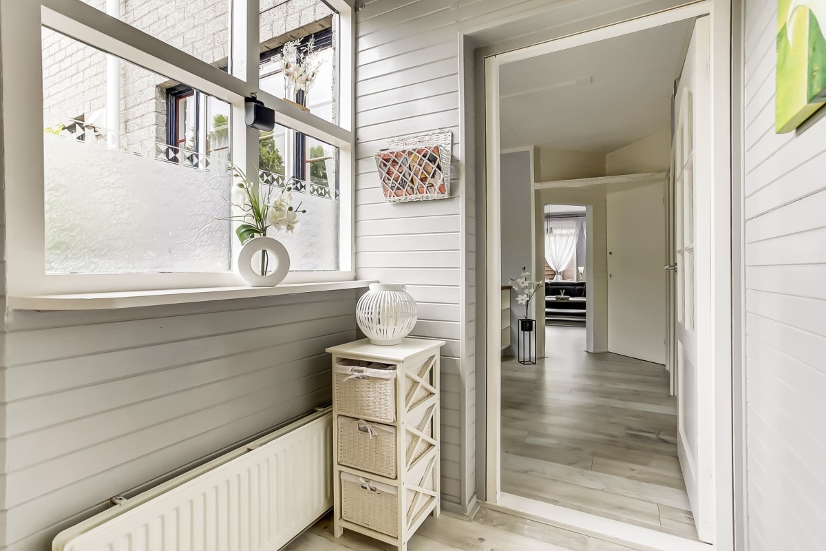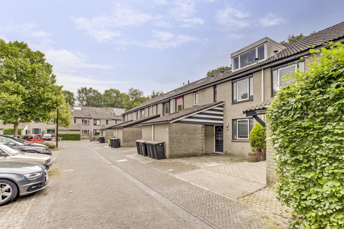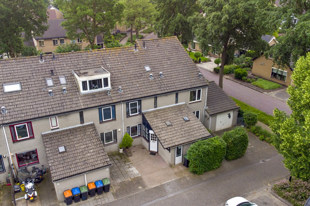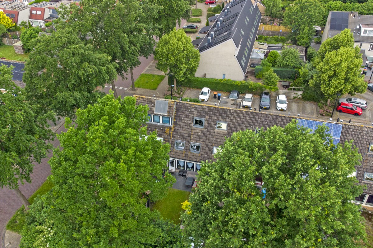 Begane grond: overdekt entree, hal met garderobe en meterkast, binnendoor naar de berging, straatgerichte halfopen keuken in een U-vorm opgesteld en voorzien van een los fornuis met oven en gaskookplaat, een rvs afzuigkap en een ingebouwde vaatwasser en een losse koelkast. Aan de achterzijde van de woning is de tuingerichte woonkamer gesitueerd welke door de grote raampartijen heerlijk licht is. Een loopdeur naar de zonnige tuin welke voorzien is van een terras met zonnescherm, gazon, borders en houten tuinhuis. De tuin biedt veel privacy omdat de tuin aan de achterzijde grenst aan de bosstrook.
