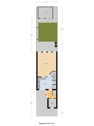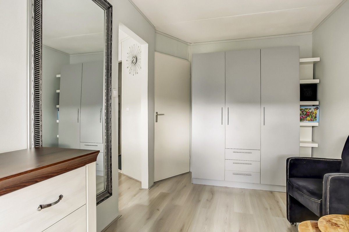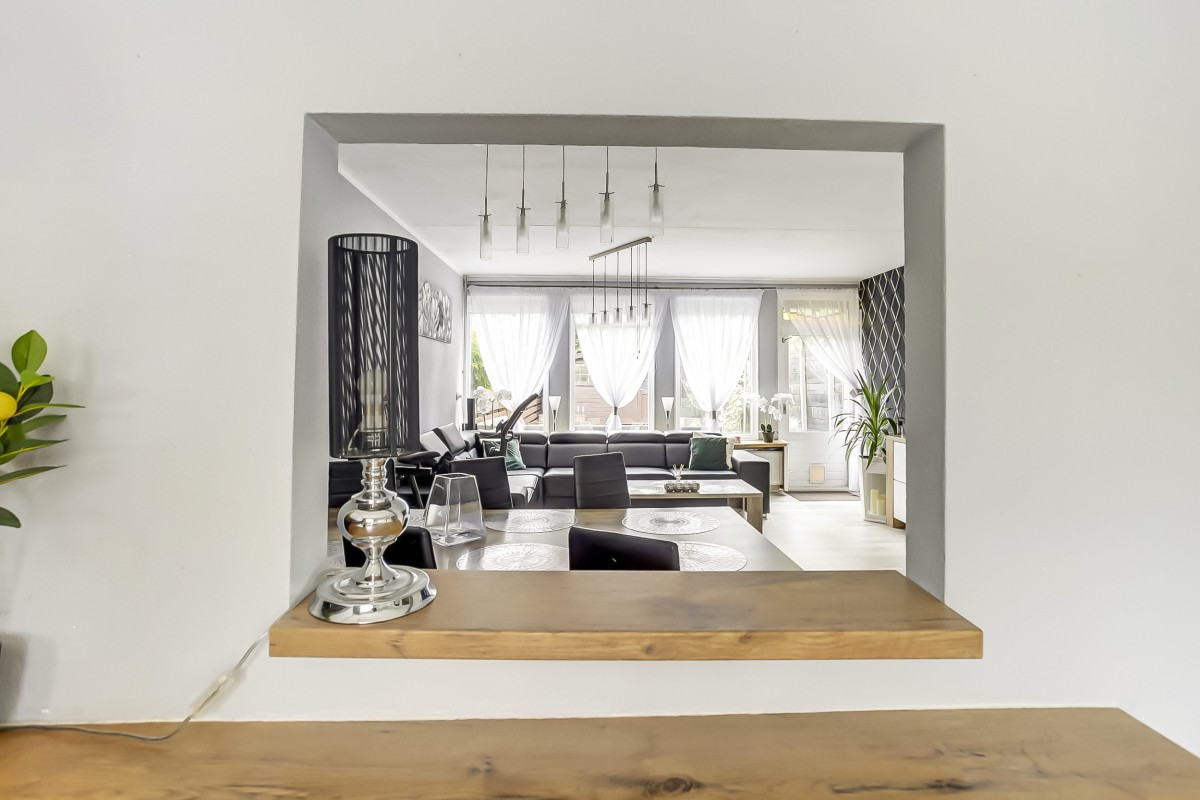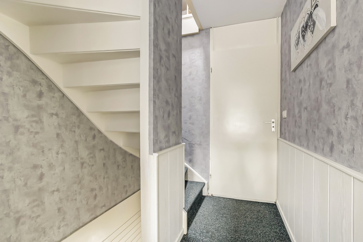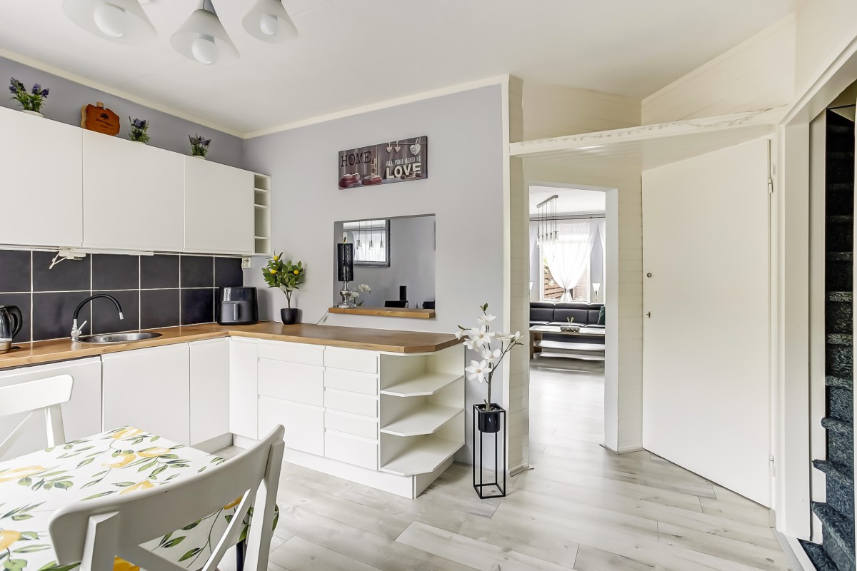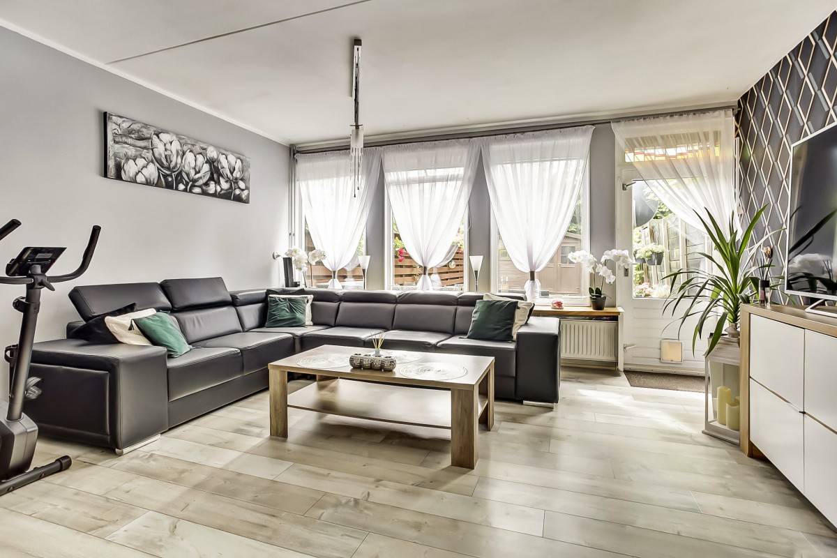 Begane grond: overdekt entree, hal met garderobe en meterkast, binnendoor naar de berging, straatgerichte halfopen keuken in een U-vorm opgesteld en voorzien van een los fornuis met oven en gaskookplaat, een rvs afzuigkap en een ingebouwde vaatwasser en een losse koelkast. Aan de achterzijde van de woning is de tuingerichte woonkamer gesitueerd welke door de grote raampartijen heerlijk licht is. Een loopdeur naar de zonnige tuin welke voorzien is van een terras met zonnescherm, gazon, borders en houten tuinhuis. De tuin biedt veel privacy omdat de tuin aan de achterzijde grenst aan de bosstrook.