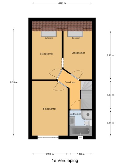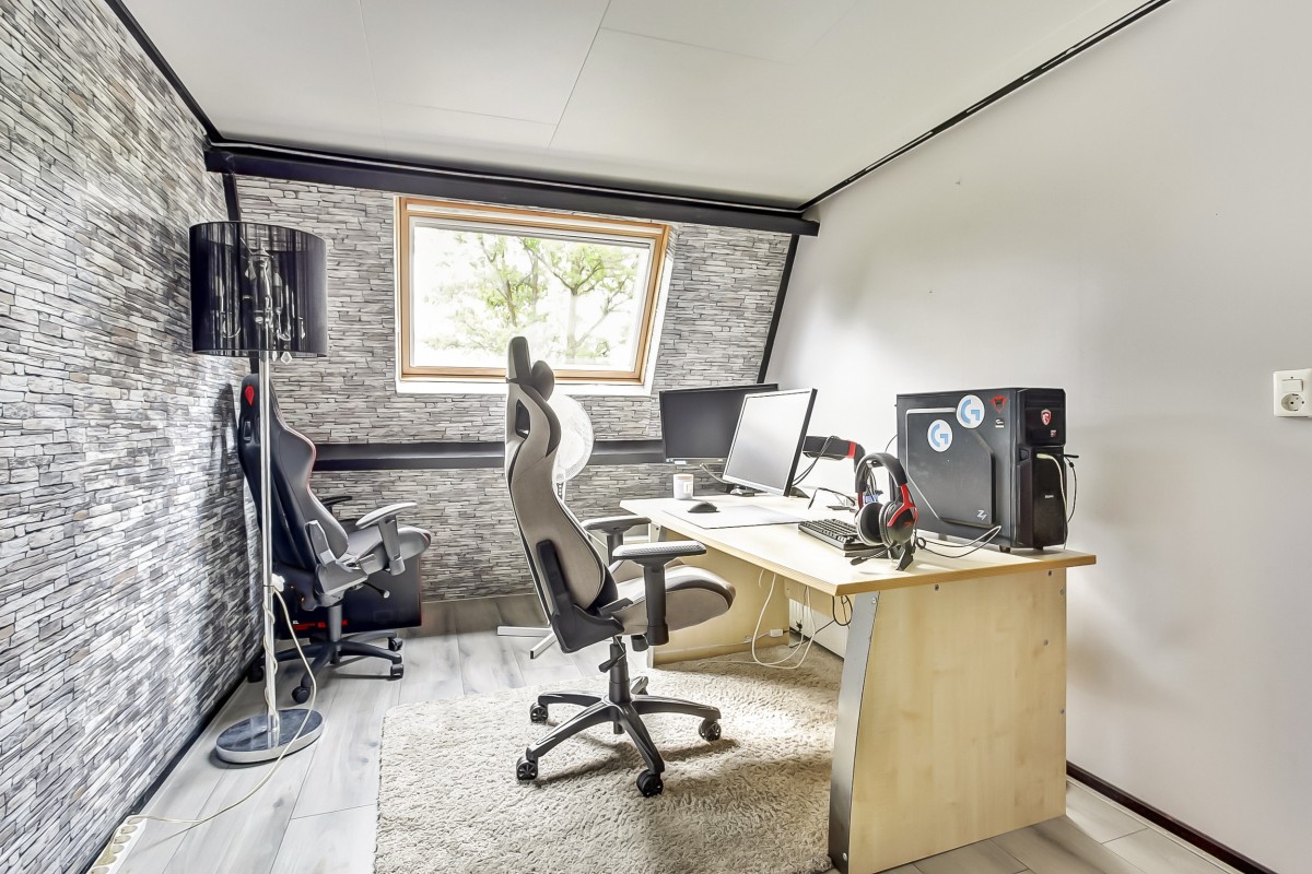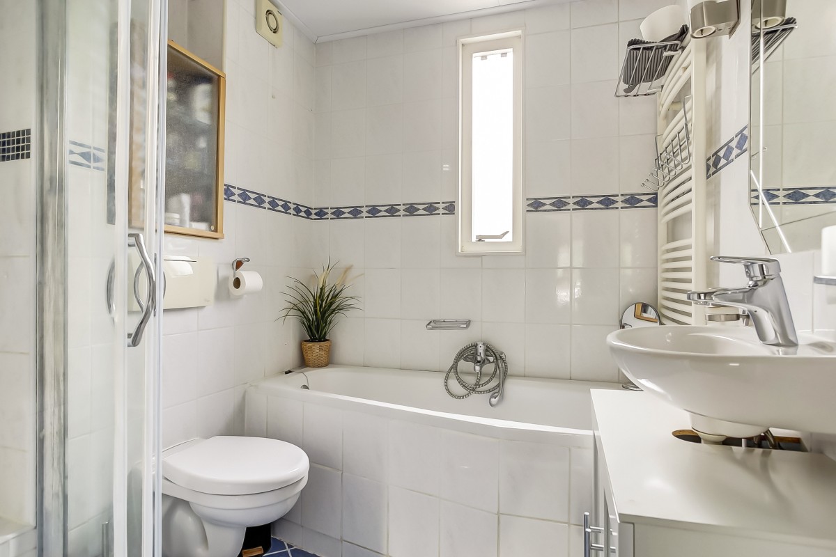 Eerste verdieping: overloop met aangrenzend twee ruime slaapkamers waarvan er 1 bestaat uit twee samengevoegde kamers. Op eenvoudige wijze zijn hier weer drie kamers te realiseren. De volledig betegelde badkamer is uitgevoerd in een lichte kleurstelling en beschikt over een wastafel, inloopdouche, een ligbad en 2e toilet.
