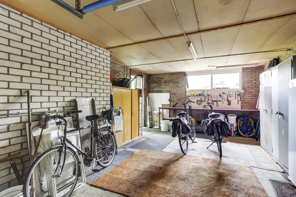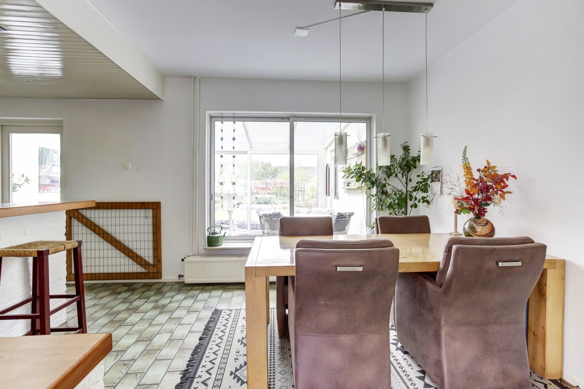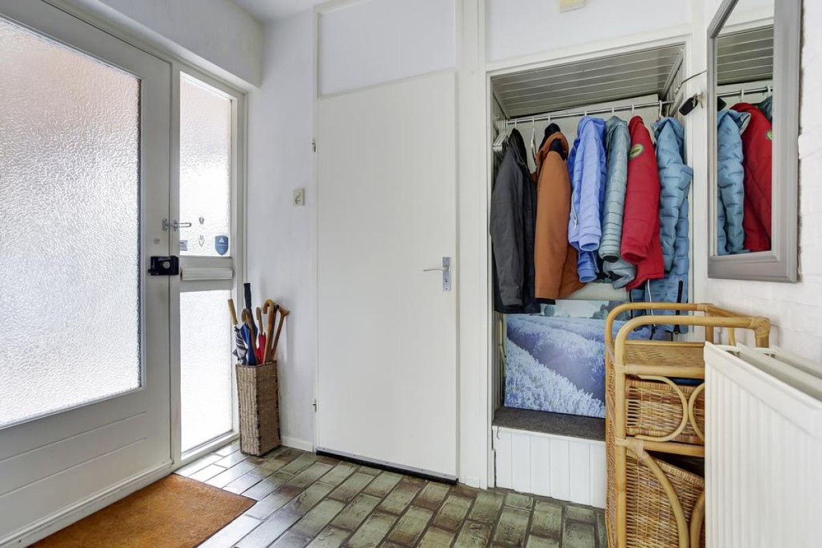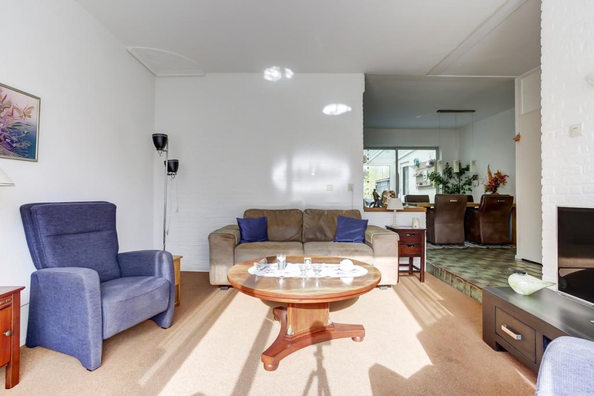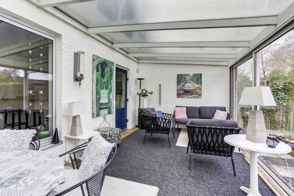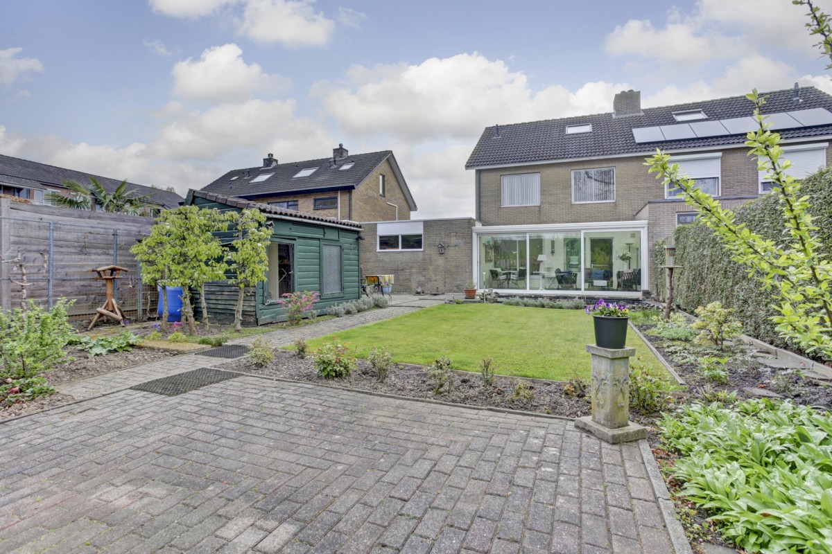 Begane grond: overdekt entree, hal met garderobe, meterkast en toiletruimte voorzien van toilet en fonteintje. De grote verdiepte woonkamer is straatgericht gelegen. De tuingerichte eethoek geeft zicht over de woonkamer, serre en aangrenzende keuken welke voorzien is van een ingebouwde koelkast, vaatwasser, combimagnetron, gaskookplaat en afzuigkap. Vanuit de keuken is de aangebouwde serre bereikbaar wat een heerlijke lichte zitkamer is om de zomerdagen "buiten" eerder te starten en te verlengen. De grote aangebouwde stenen garage is voorzien van een loopdeur naar de tuin en een loopdeur en kanteldeur naar de oprit. De achtertuin is op het westen gesitueerd, verzorgd aangelegd en voorzien van een groot terras en vrijstaand tuinhuis.