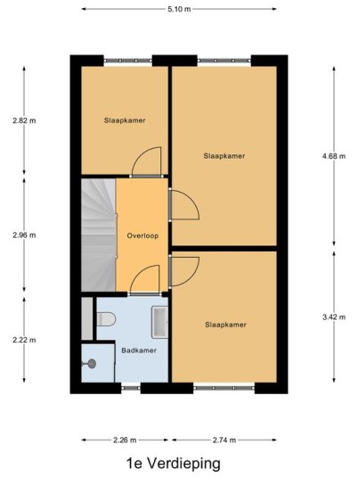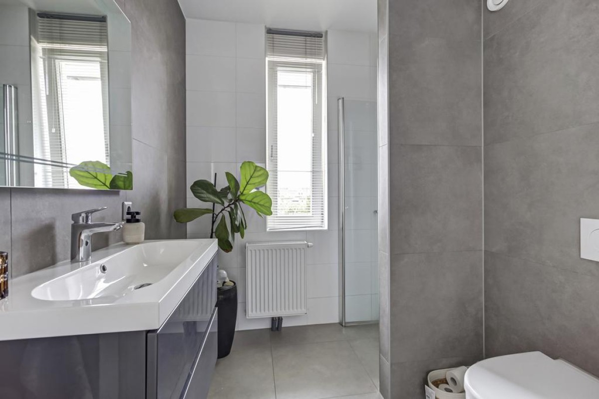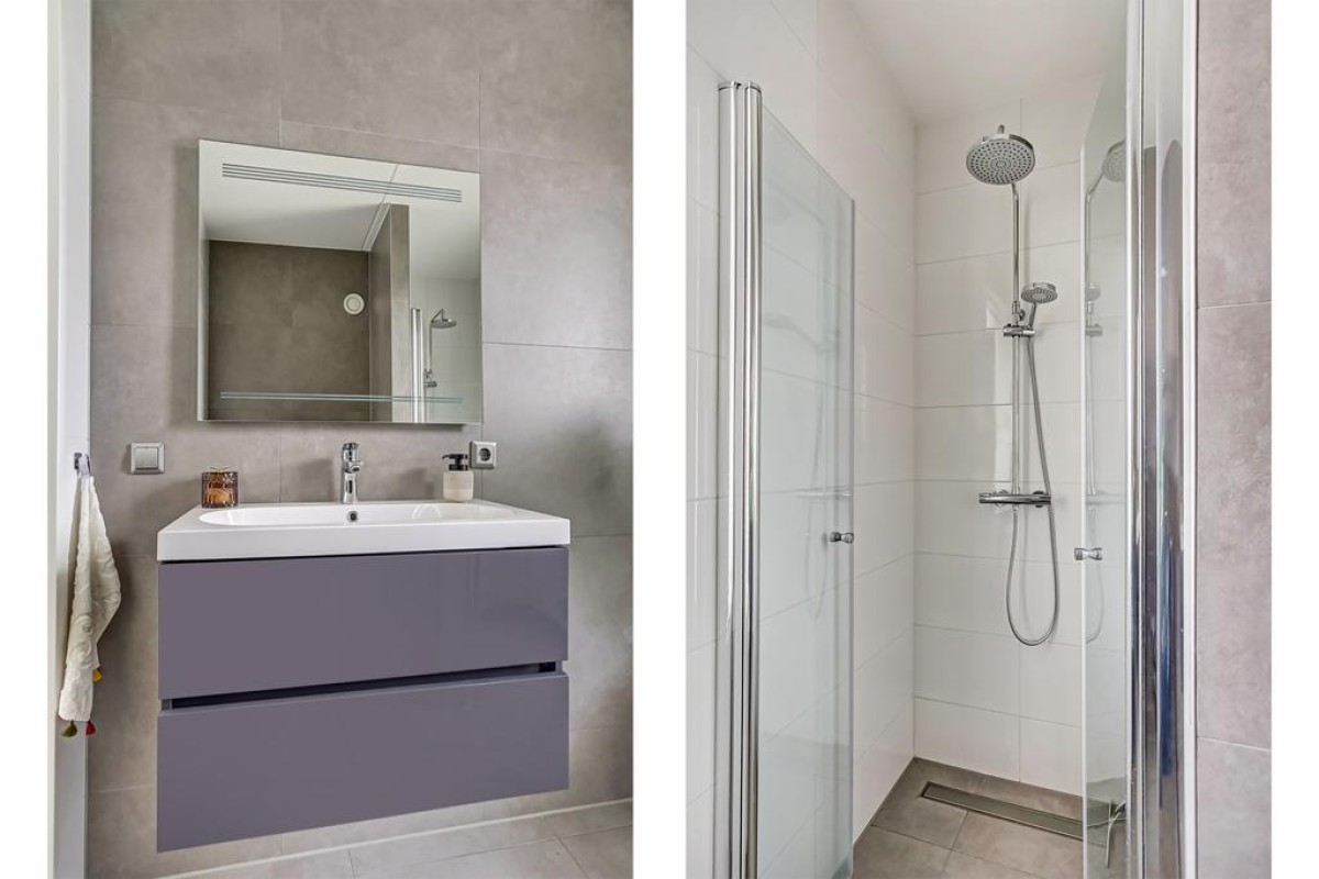 Eerste verdieping: overloop met aansluitend 3 mooie slaapkamers en moderne badkamer. Op deze verdieping ligt een nette vloerbedekking. De badkamer beschikt over een tweede hangcloset, een ruime douche en een wastafel met meubel.