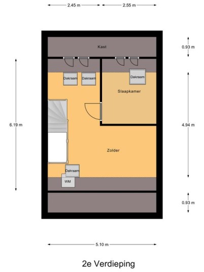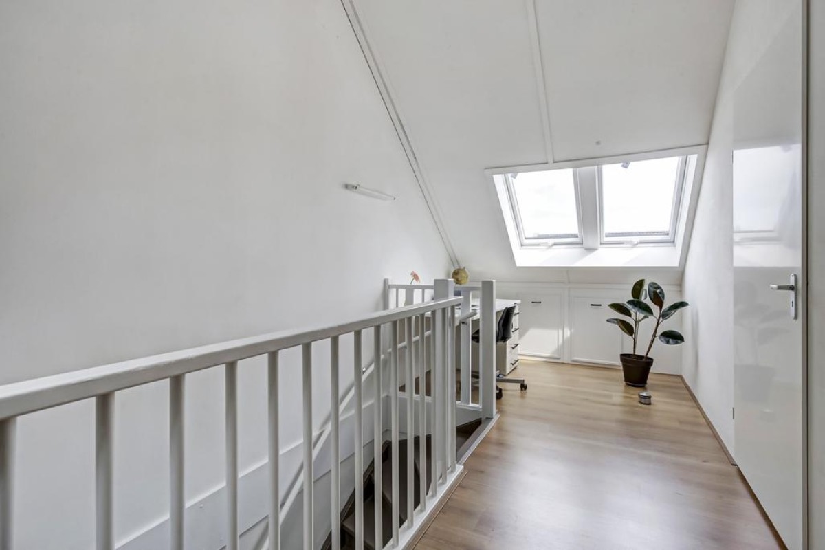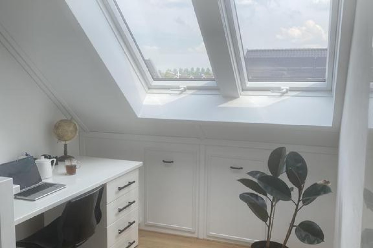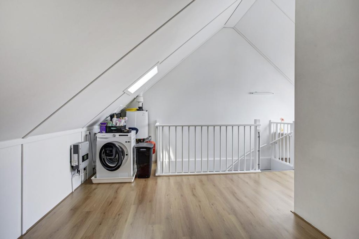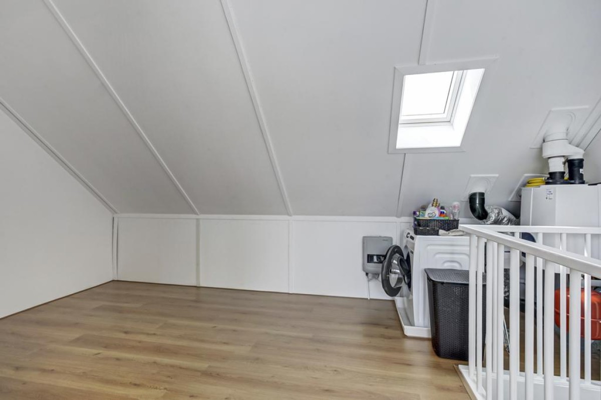 Tweede verdieping: middels een vaste trap bereikbare zolderverdieping waar de c.v.-ketel, wasmachine, omvormer en mechanische ventilatie zijn opgesteld. De zolderverdieping is voorzien van een nette laminaatvloer, een mooie lichte werkplek met twee dakramen en een goede 4e slaapkamer eveneens met een groot dakraam. Achter de knieschotten is de nodige bergruimte bereikbaar. Het is tevens mogelijk om op deze verdieping nog een extra kamer te realiseren.