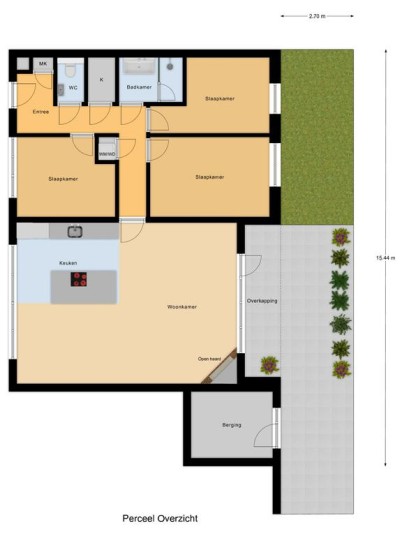 overdekte entree, hal met toegang tot de inpandige berging, badkamer, slaapkamers en woonkamer.