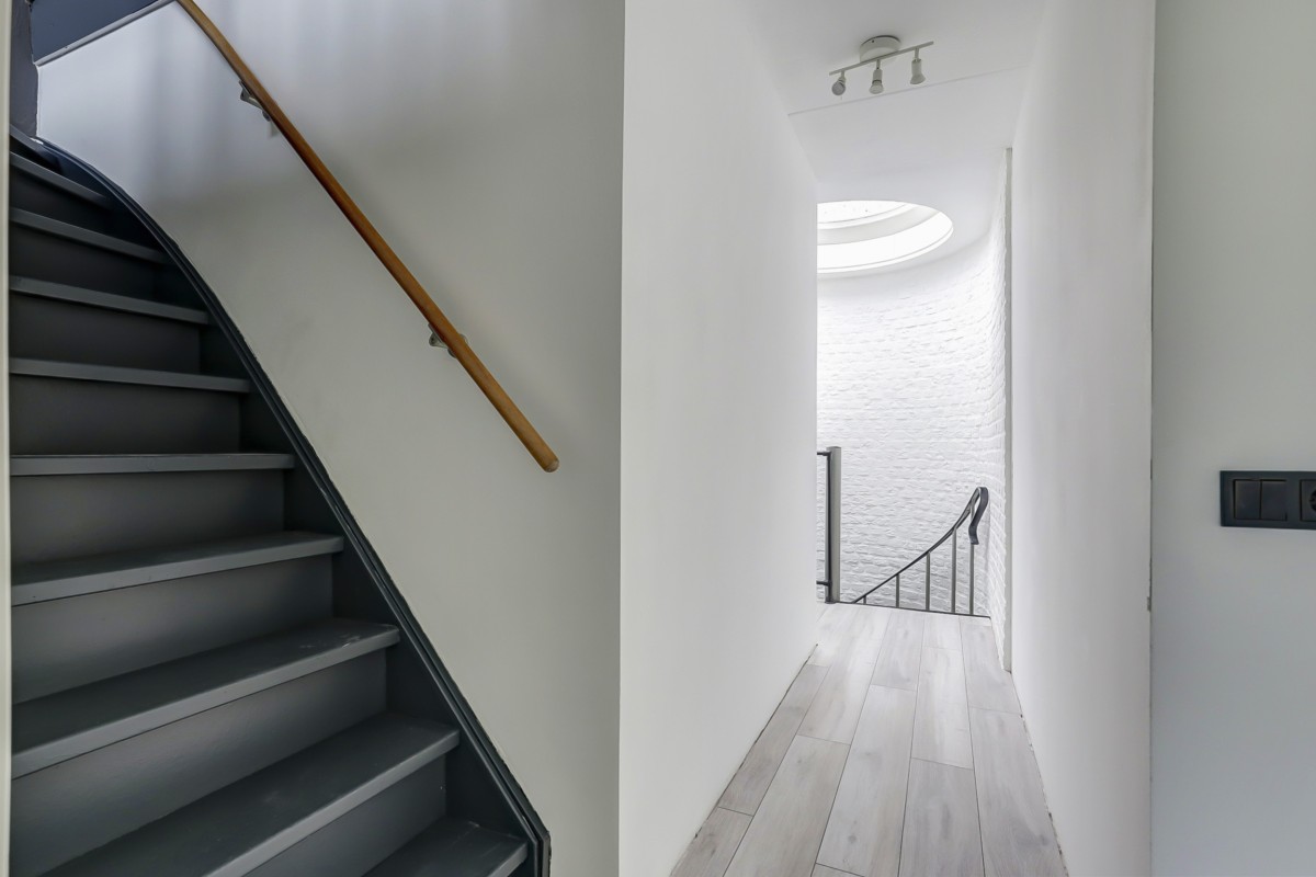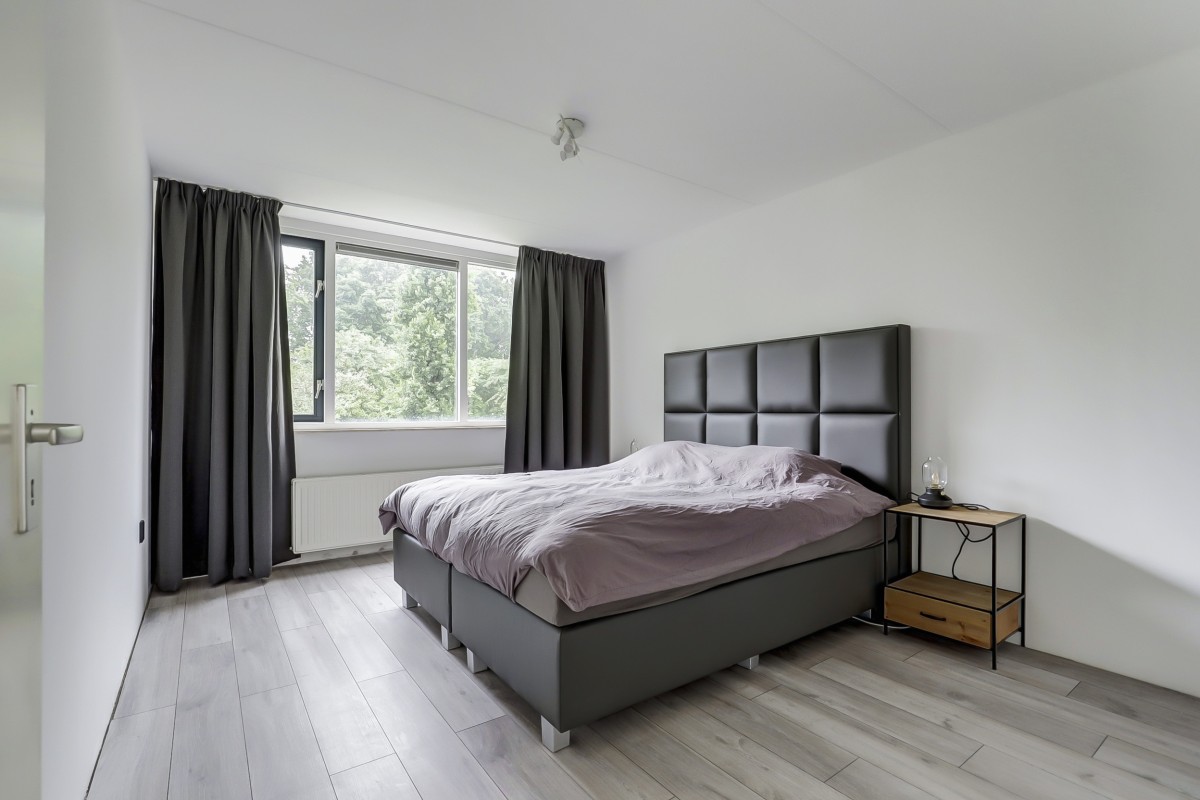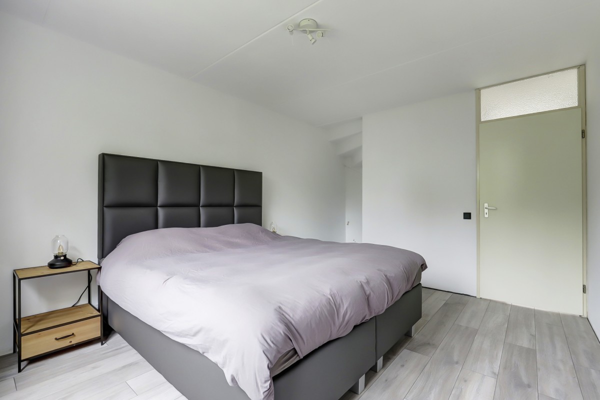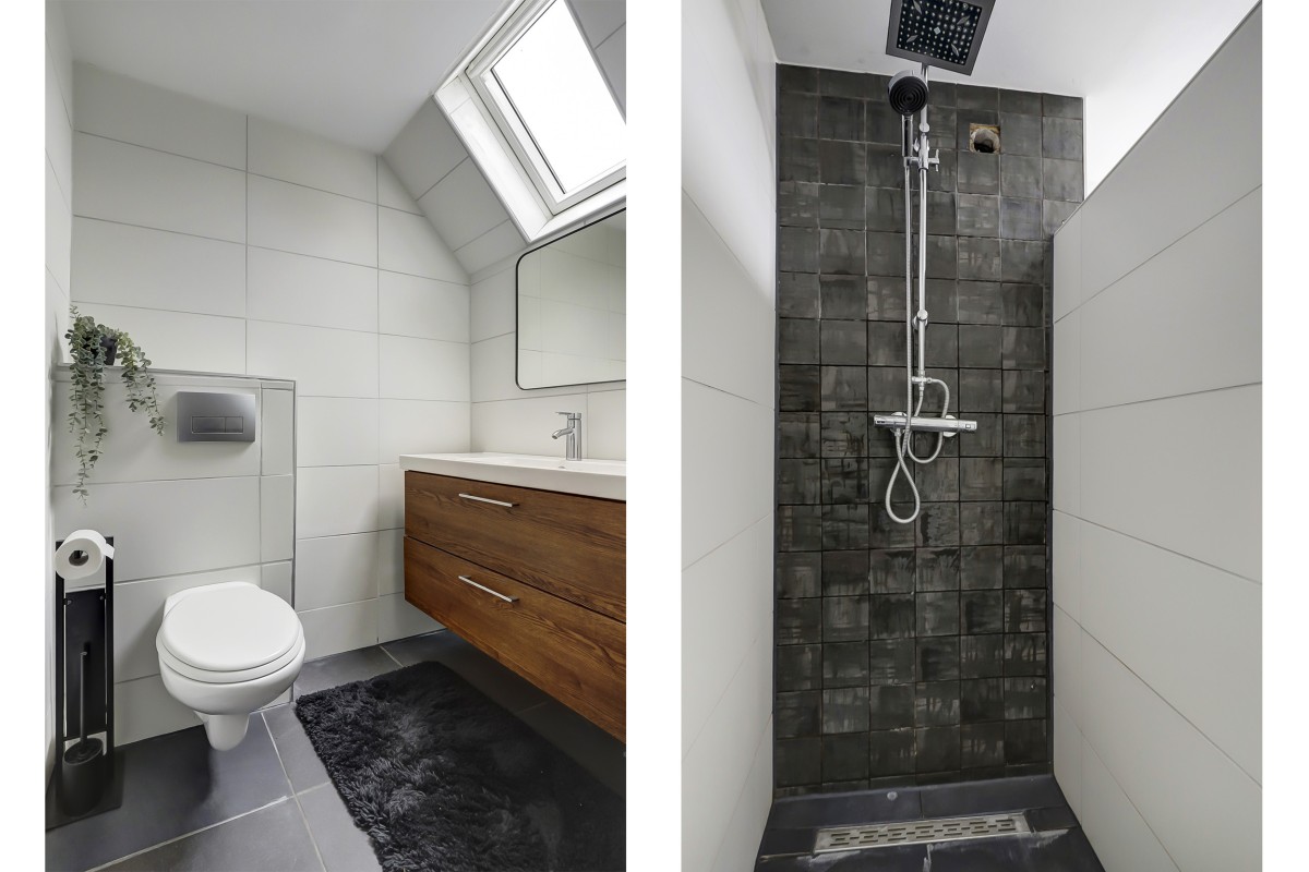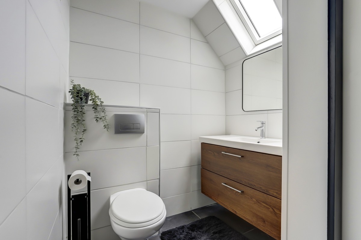 Eerste verdieping: Overloop met toegang tot drie ruime slaapkamers en de recent vernieuwde badkamer. De badkamer is volledig betegeld in een moderne kleurstelling en beschikt over een kunststof Velux-dakraam, inloopdouche, hangcloset en wastafelmeubel. Ook deze verdieping is voorzien van een laminaatvloer.
