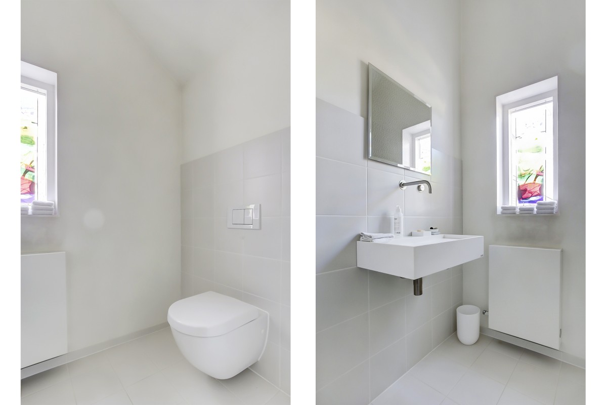 Begane grond: overdekte entree, ruime lichte moderne ontvangsthal met een garderobe en uitgebreide meterkast en luxe toiletruimte met hangcloset en wastafel.