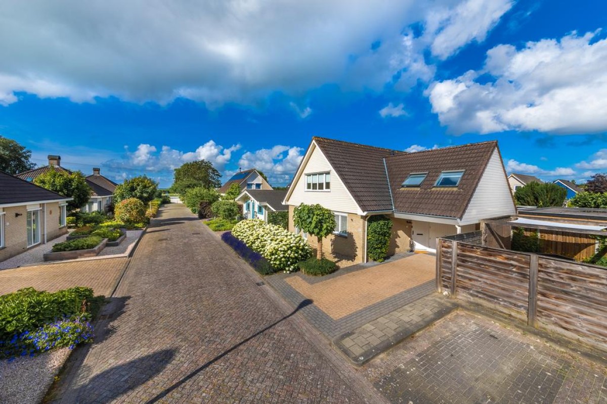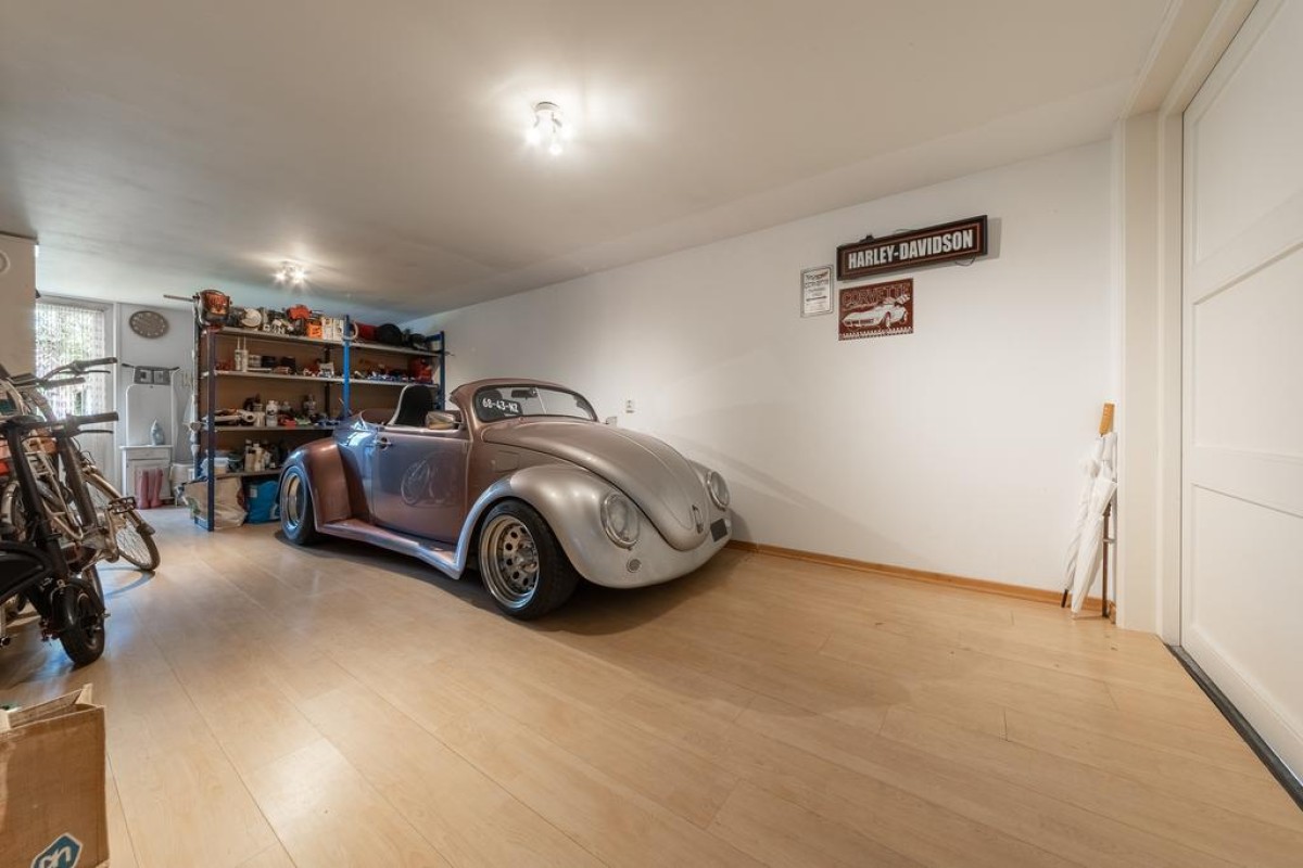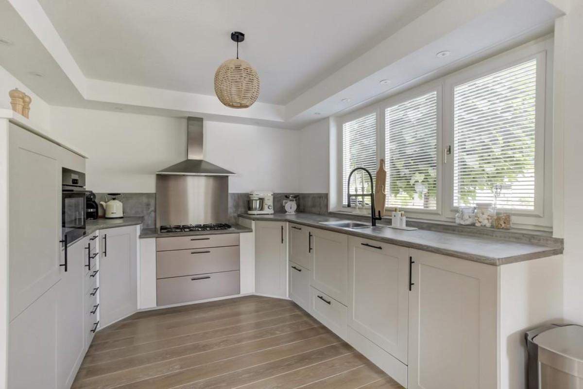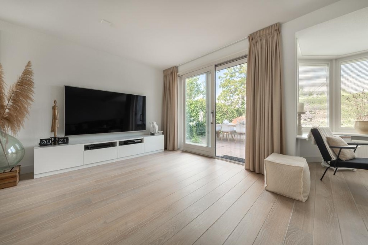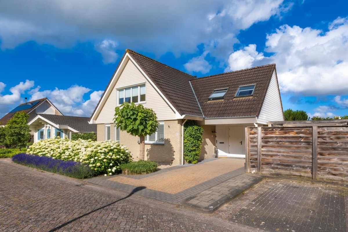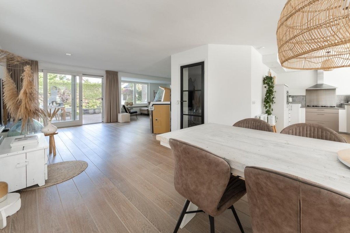 Begane grond: overdekte entree, ruime hal met garderobe, meterkast en grote toiletruimte met hangcloset en fonteintje, doorgang naar de sfeervolle L-vormige woonkamer welke beschikt over een houten vloer (Amerikaans Eiken White Wash), een schuifpui en leuke erker met uitzicht op de tuin. Aan de voorzijde van de woning is de ruime eethoek gesitueerd met aansluitend de ruime open U-keuken met ingebouwde koelkast, combimagnetron (recent nieuw), vaatwasser (recent nieuw), 6-pits gaskookplaat en afzuigkap. Vanuit de hal is binnendoor de ruime garage bereikbaar welke voorzien is van verwarming, alsmede de c.v.-ketel (Vaillant HR 2021), omvormer voor de zonnepanelen, uitstortgootsteen en wasmachine/droger aansluiting. Tevens biedt de garage een loopdeur naar de achtertuin en openslaande garagedeuren naar de oprit. De tuin is op het westen gesitueerd en erg fraai aangelegd en voorzien van een houten tuinhuis en een overkapping met lamellen tegen de achtergevel. Tevens is de achtertuin bereikbaar via een achterom.