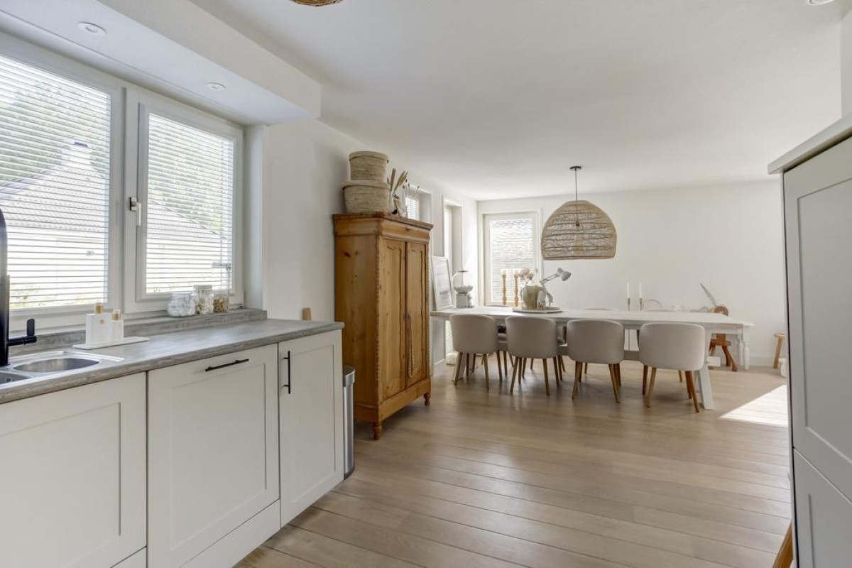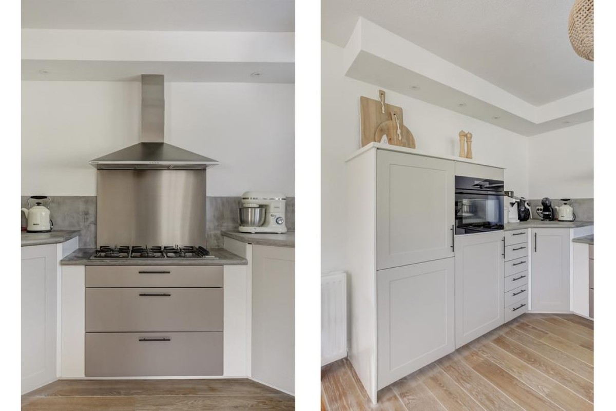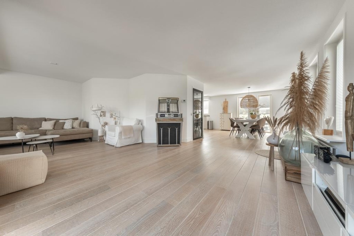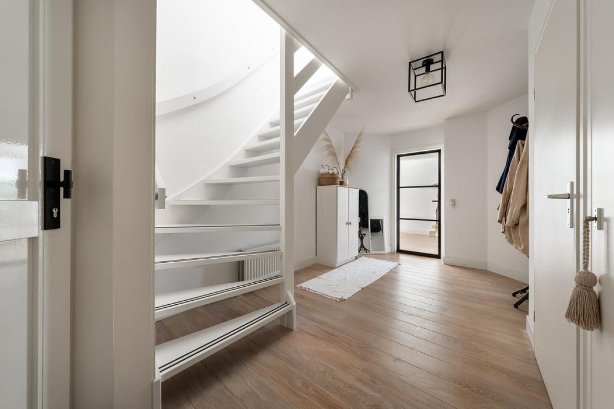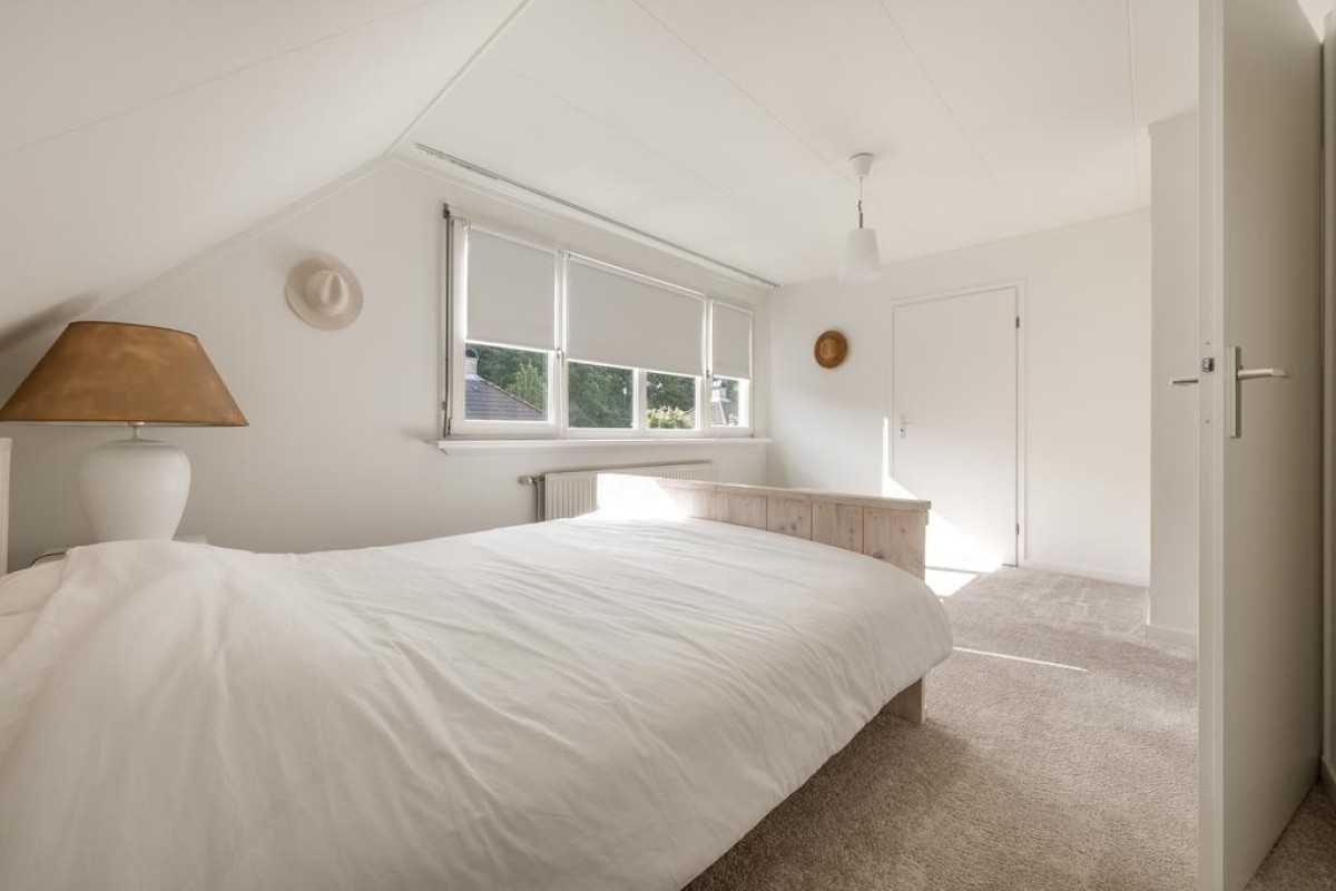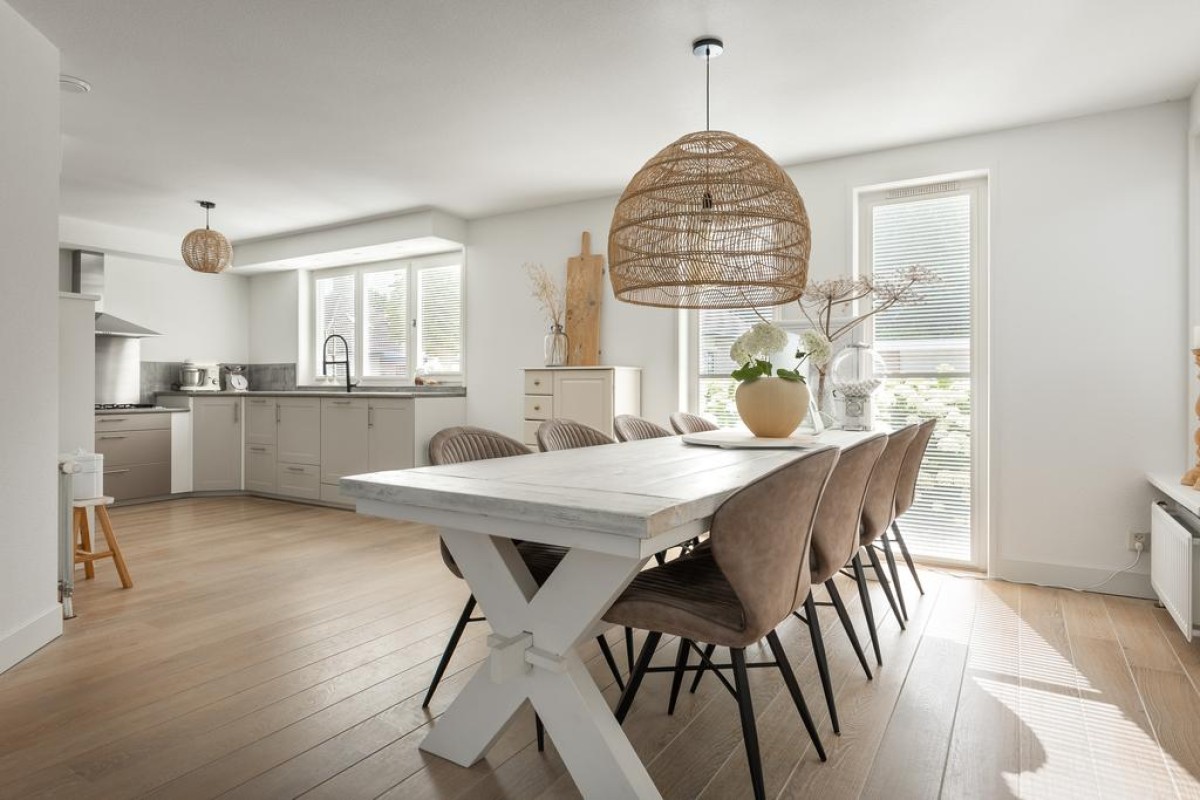 Begane grond: overdekte entree, ruime hal met garderobe, meterkast en grote toiletruimte met hangcloset en fonteintje, doorgang naar de sfeervolle L-vormige woonkamer welke beschikt over een houten vloer (Amerikaans Eiken White Wash), een schuifpui en leuke erker met uitzicht op de tuin. Aan de voorzijde van de woning is de ruime eethoek gesitueerd met aansluitend de ruime open U-keuken met ingebouwde koelkast, combimagnetron (recent nieuw), vaatwasser (recent nieuw), 6-pits gaskookplaat en afzuigkap. Vanuit de hal is binnendoor de ruime garage bereikbaar welke voorzien is van verwarming, alsmede de c.v.-ketel (Vaillant HR 2021), omvormer voor de zonnepanelen, uitstortgootsteen en wasmachine/droger aansluiting. Tevens biedt de garage een loopdeur naar de achtertuin en openslaande garagedeuren naar de oprit. De tuin is op het westen gesitueerd en erg fraai aangelegd en voorzien van een houten tuinhuis en een overkapping met lamellen tegen de achtergevel. Tevens is de achtertuin bereikbaar via een achterom.