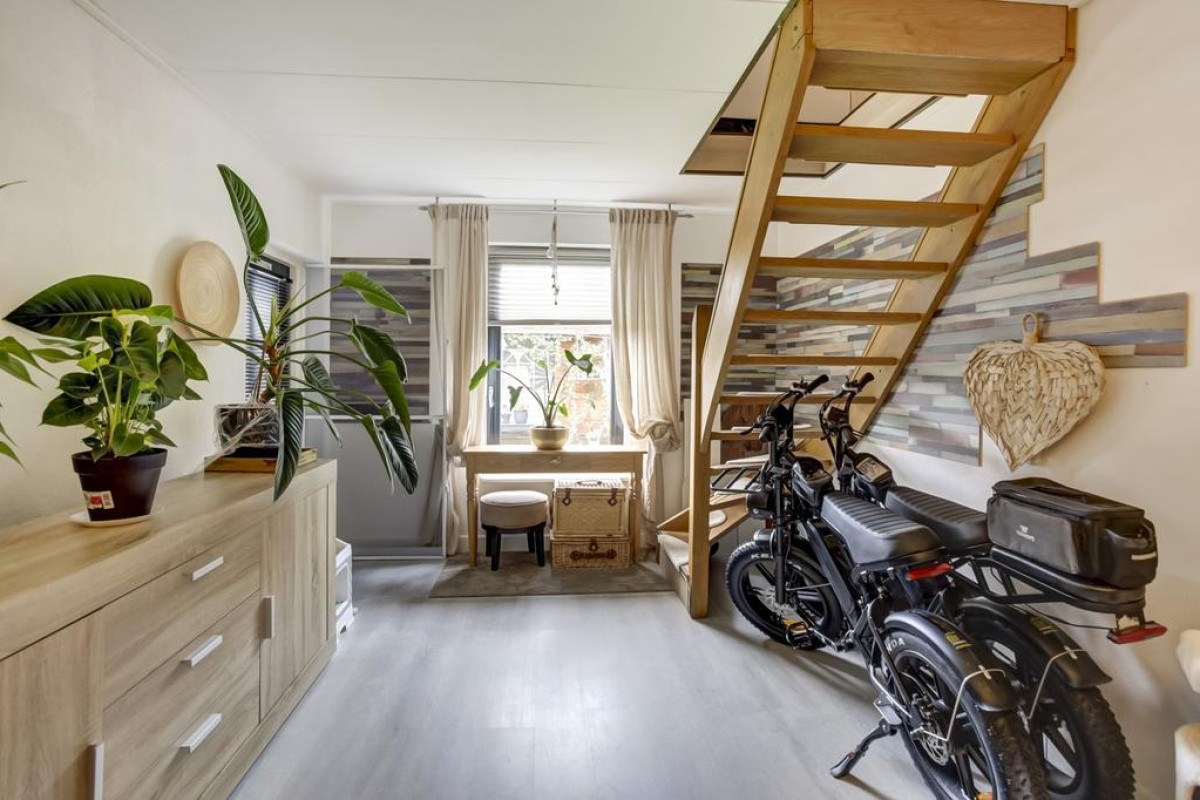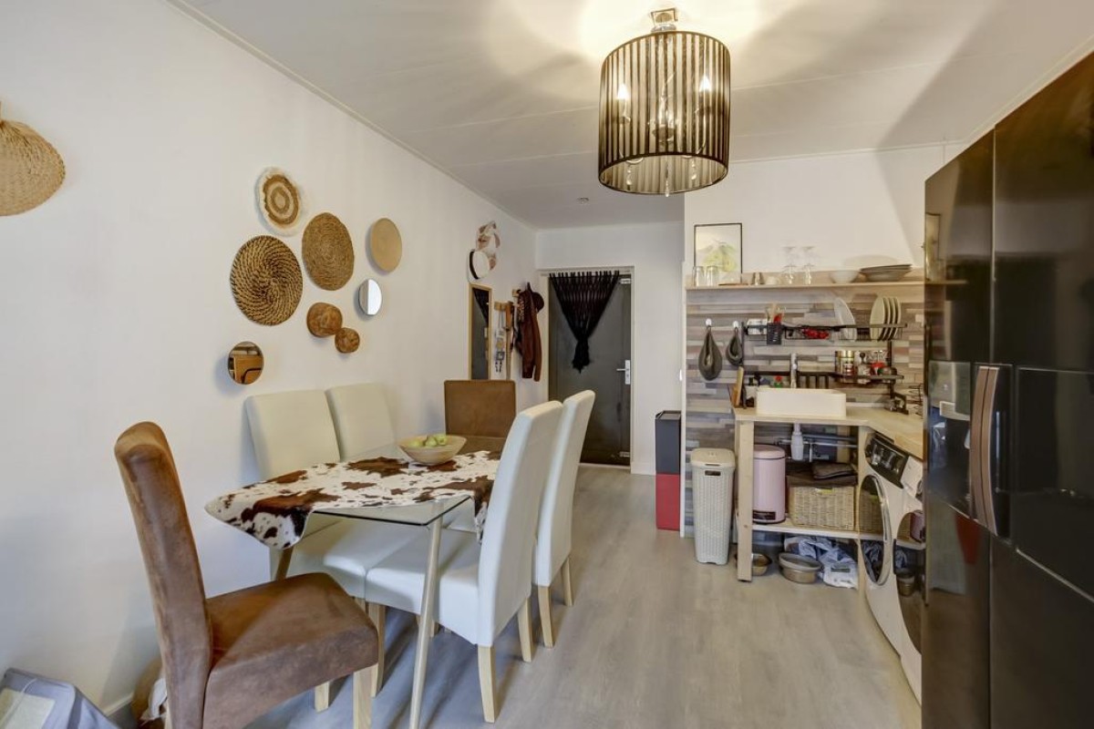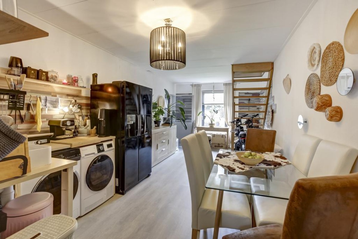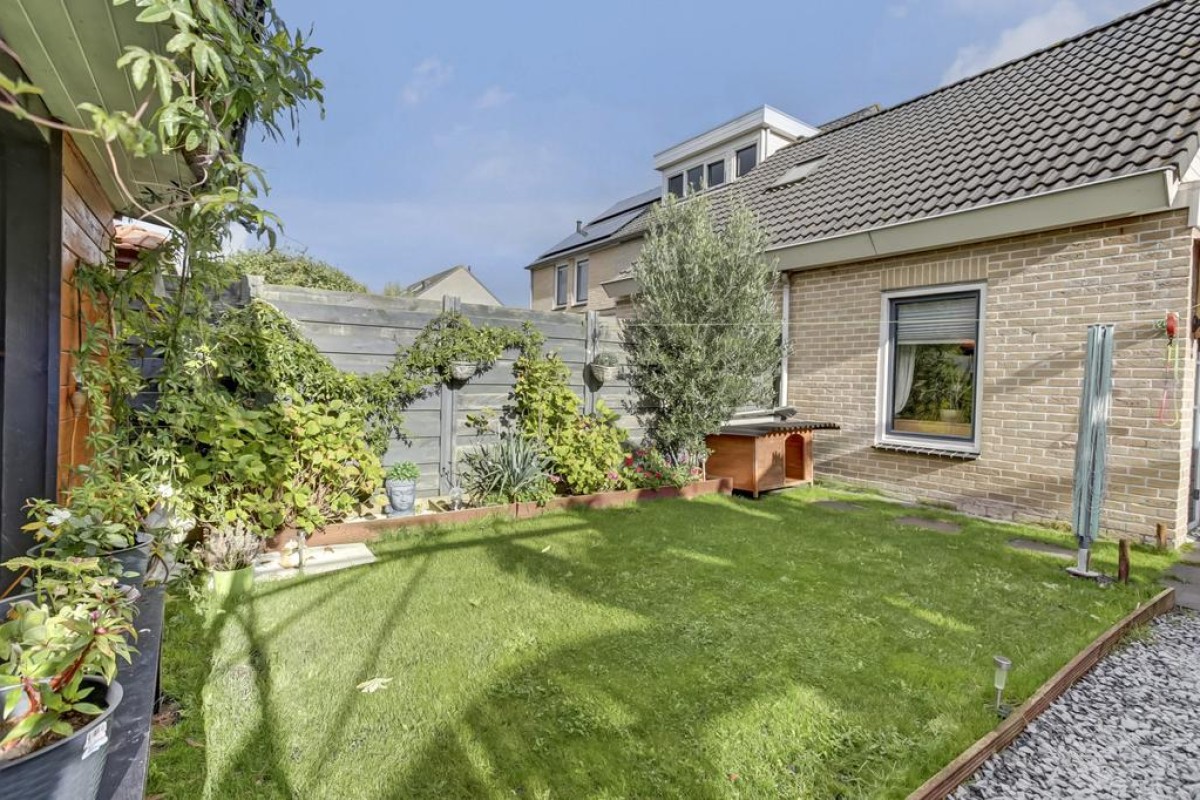 Vanuit de hal is de ruime aangebouwde multifunctionele ruimte met ruime opbouw bereikbaar welke voorzien is van een hoek opgestelde kitchenette met een waskom en opstelplaats voor de wasapparatuur, alsmede een deur naar de achtertuin en een vaste trap naar de riante zolder welke in gebruik is als slaapvetrek. Vanuit de multifunctionele ruimte zijn zowel de oprit als de fraai aangelegde tuin op het zuidwesten bereikbaar. De verzorgde tuin is voorzien van een groot terras met zonwering, een gazon, border met vaste beplanting, een zonneterras, een houten berging voorzien van elektra en een houten overkapping met houtkachel.