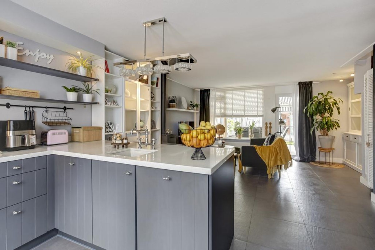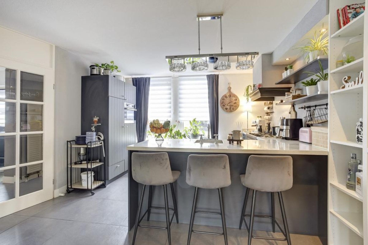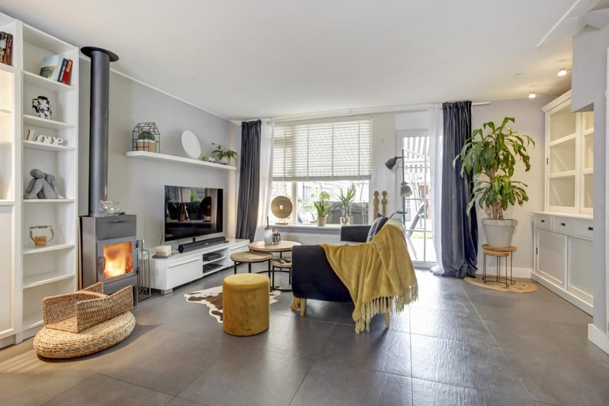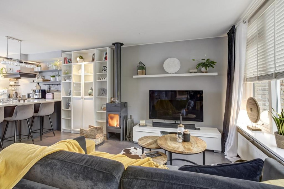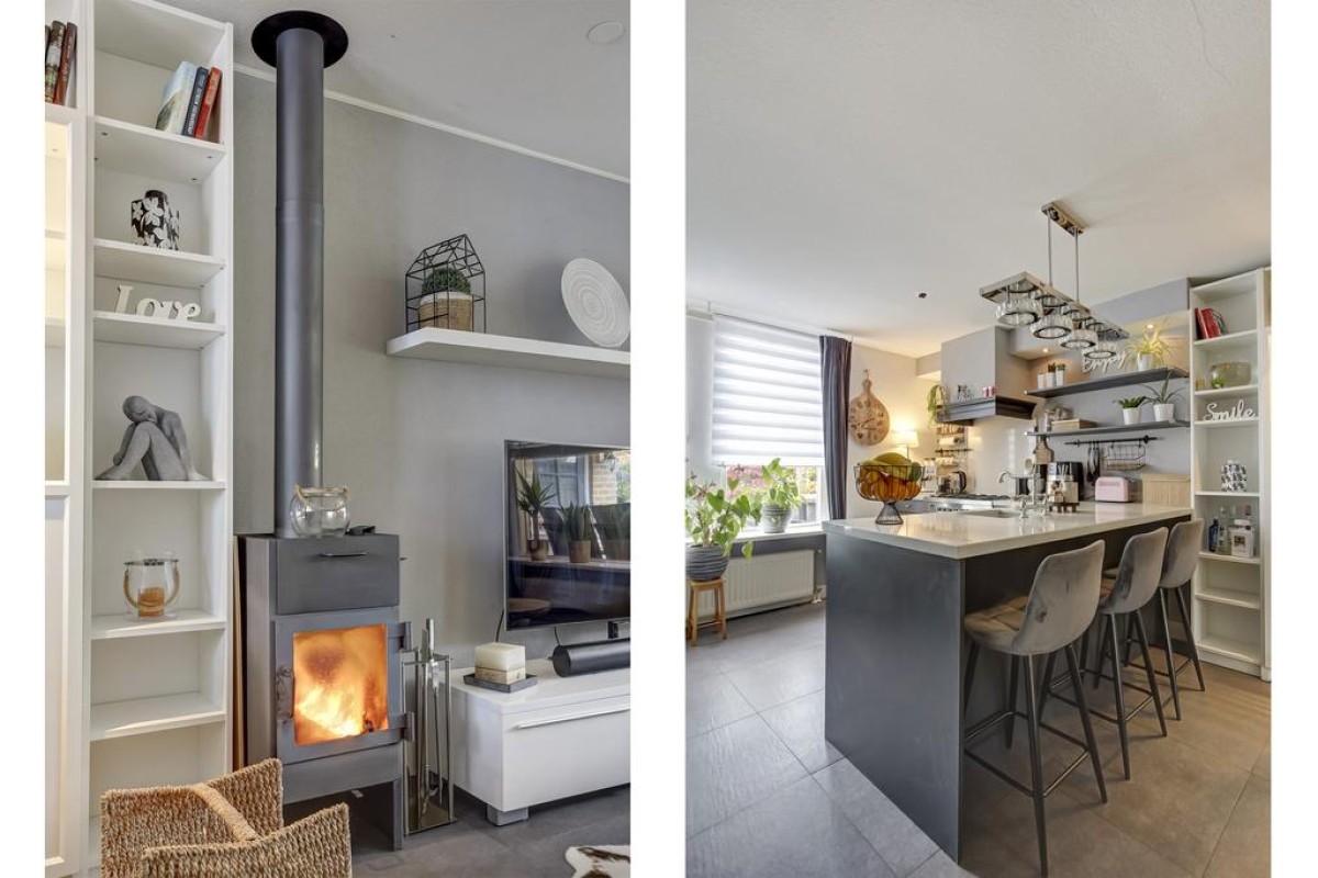 Lees verderTuingerichte woonkamer met een sfeervolle houtkachel en aangrenzend de luxe straatgerichte keuken met een ruime eetbar en veel kastruimte. De moderne keuken is voorzien van een ingebouwde koelkast, vrieskast, groot fornuis met 2 wokbranders en een grote oven, een afzuigschouw, een vaatwasser en een combimagnetron.