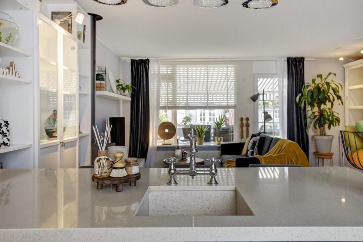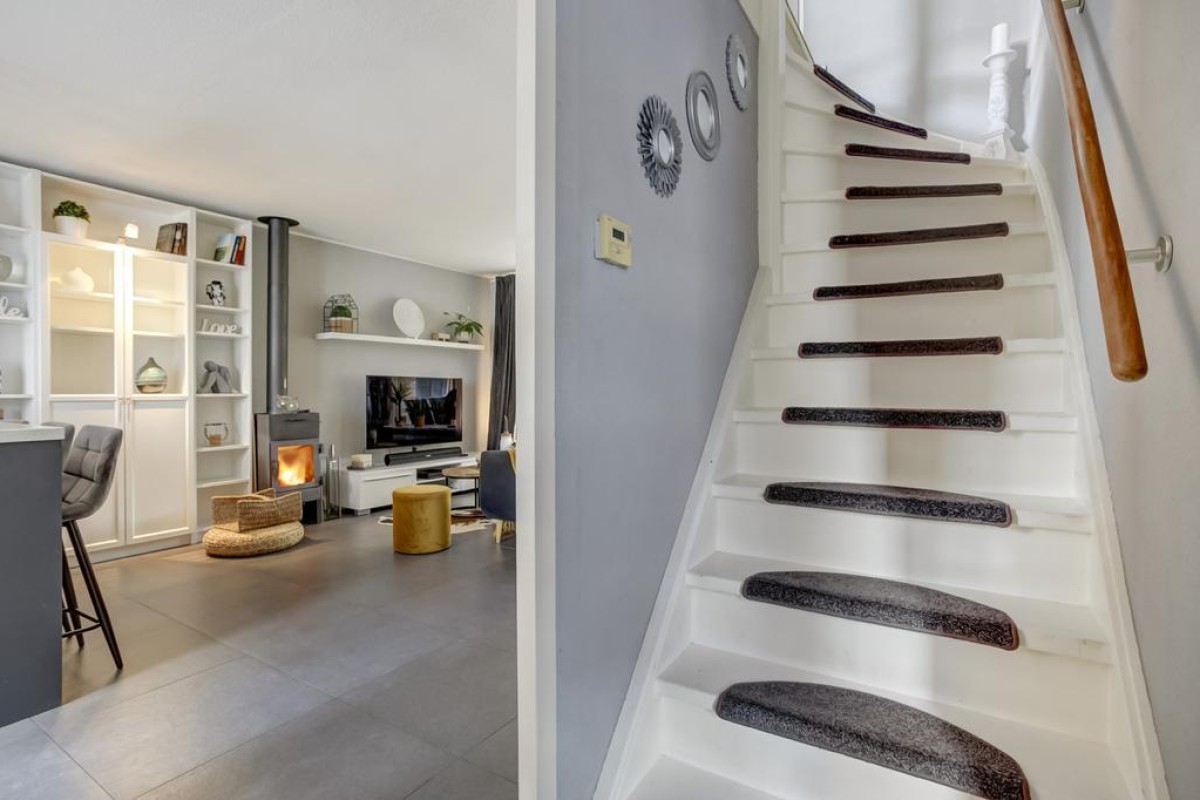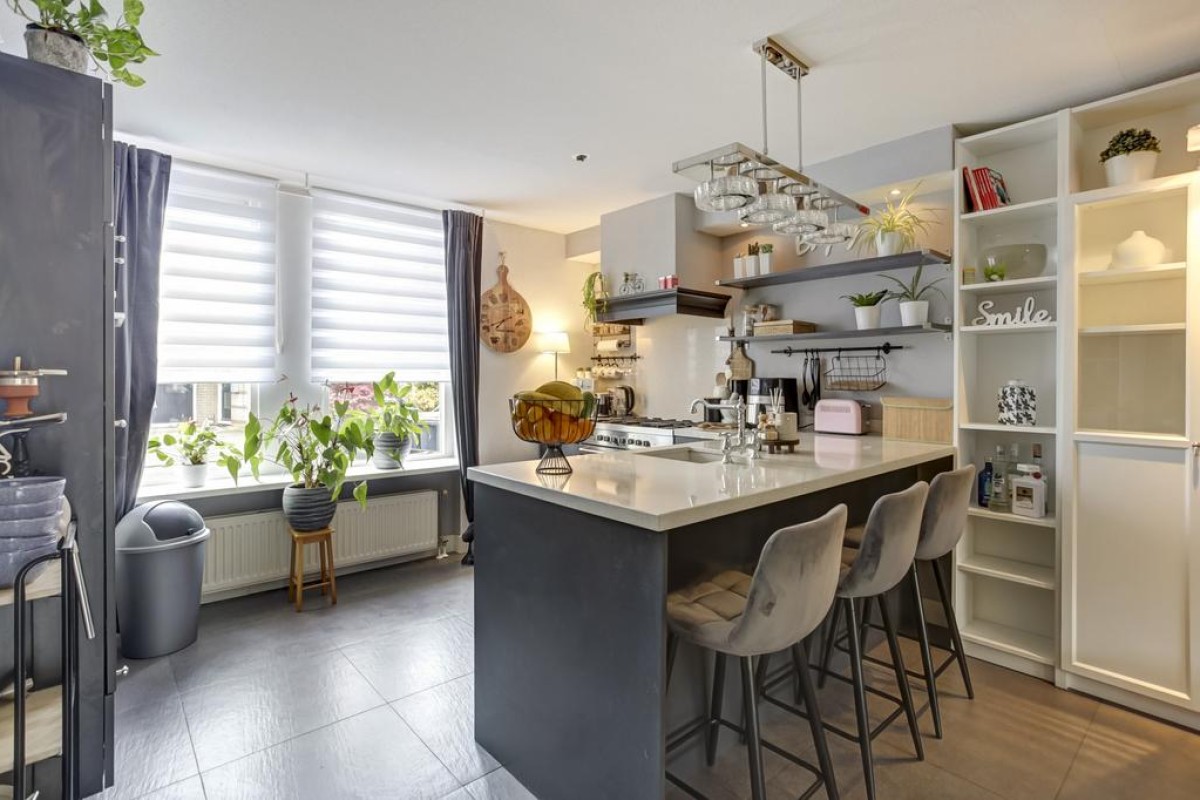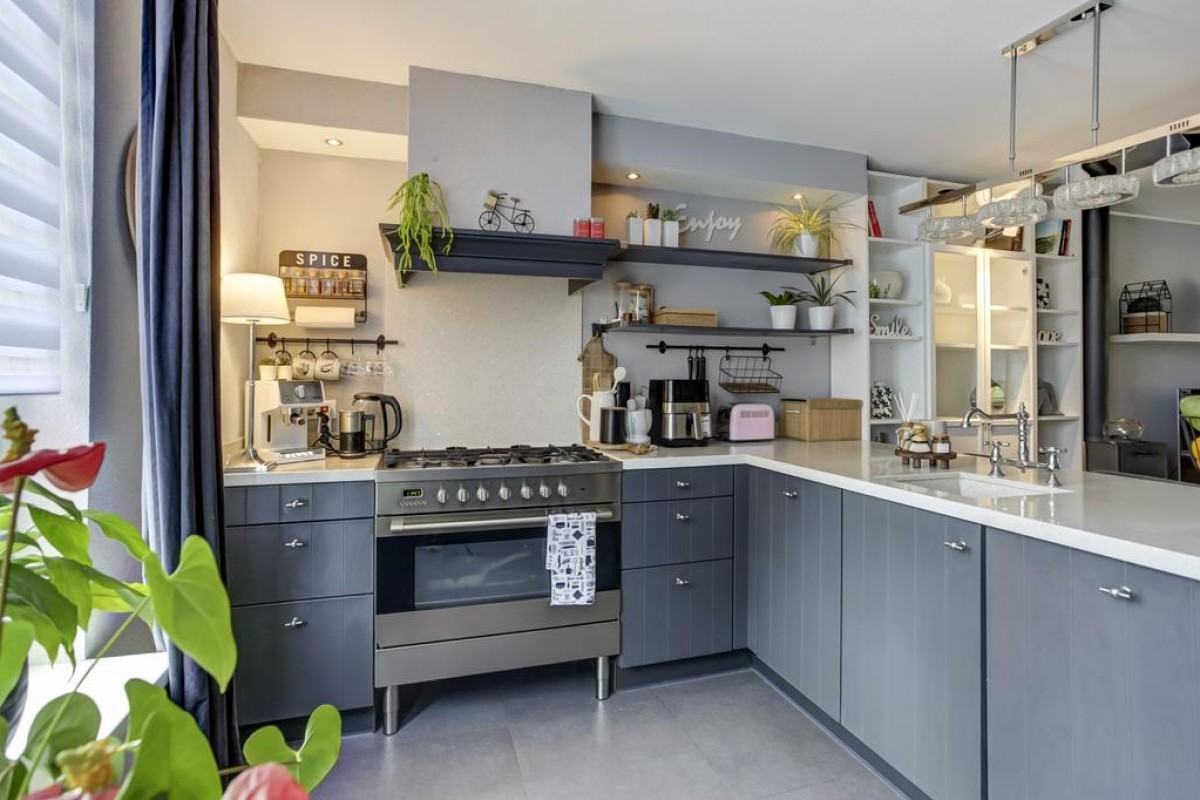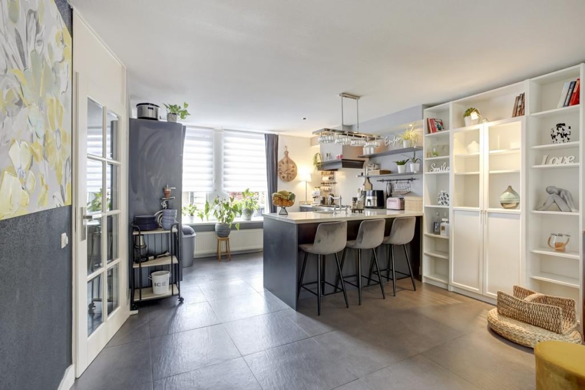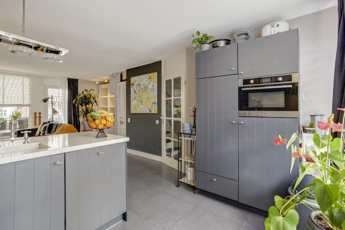 Lees verderTuingerichte woonkamer met een sfeervolle houtkachel en aangrenzend de luxe straatgerichte keuken met een ruime eetbar en veel kastruimte. De moderne keuken is voorzien van een ingebouwde koelkast, vrieskast, groot fornuis met 2 wokbranders en een grote oven, een afzuigschouw, een vaatwasser en een combimagnetron.