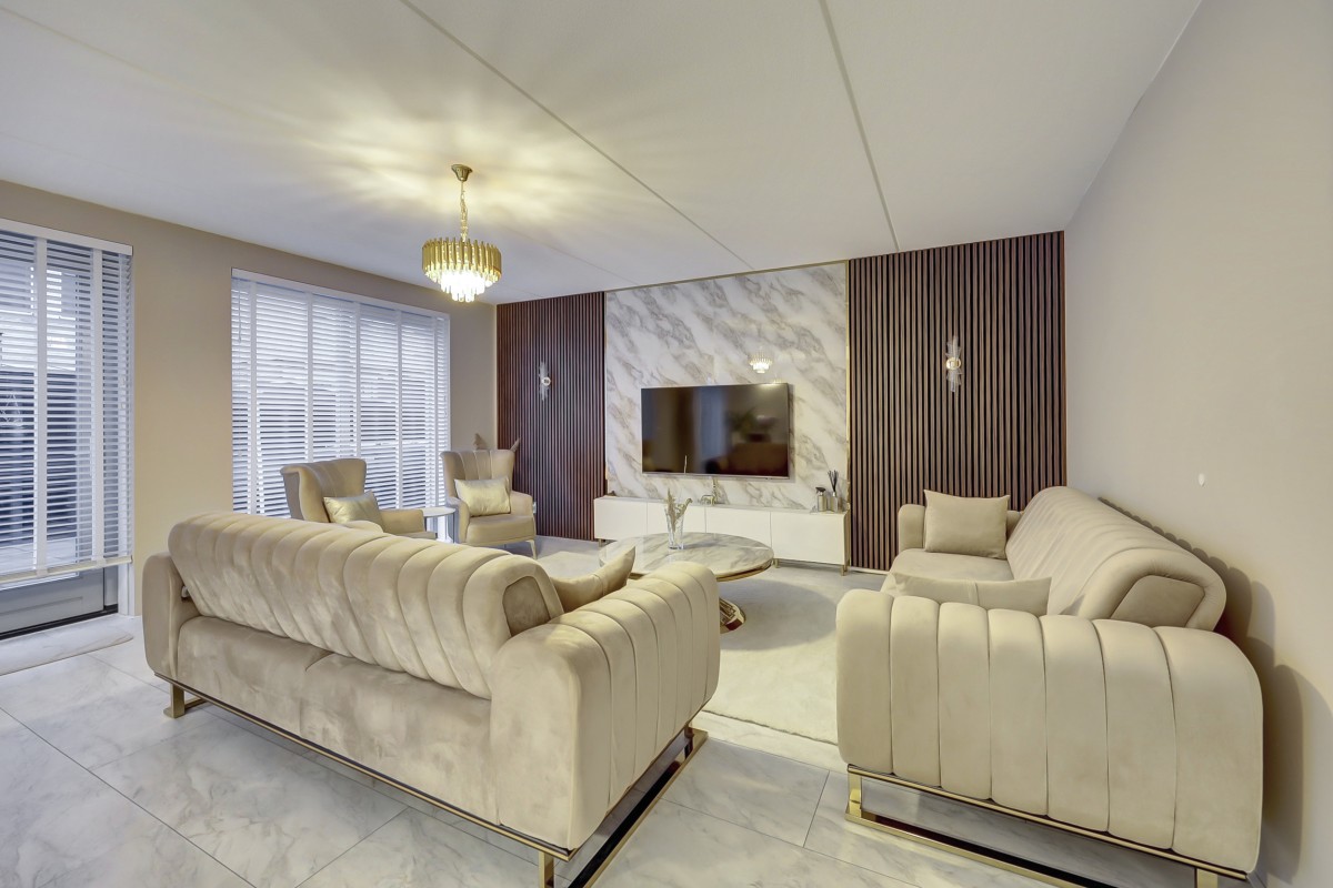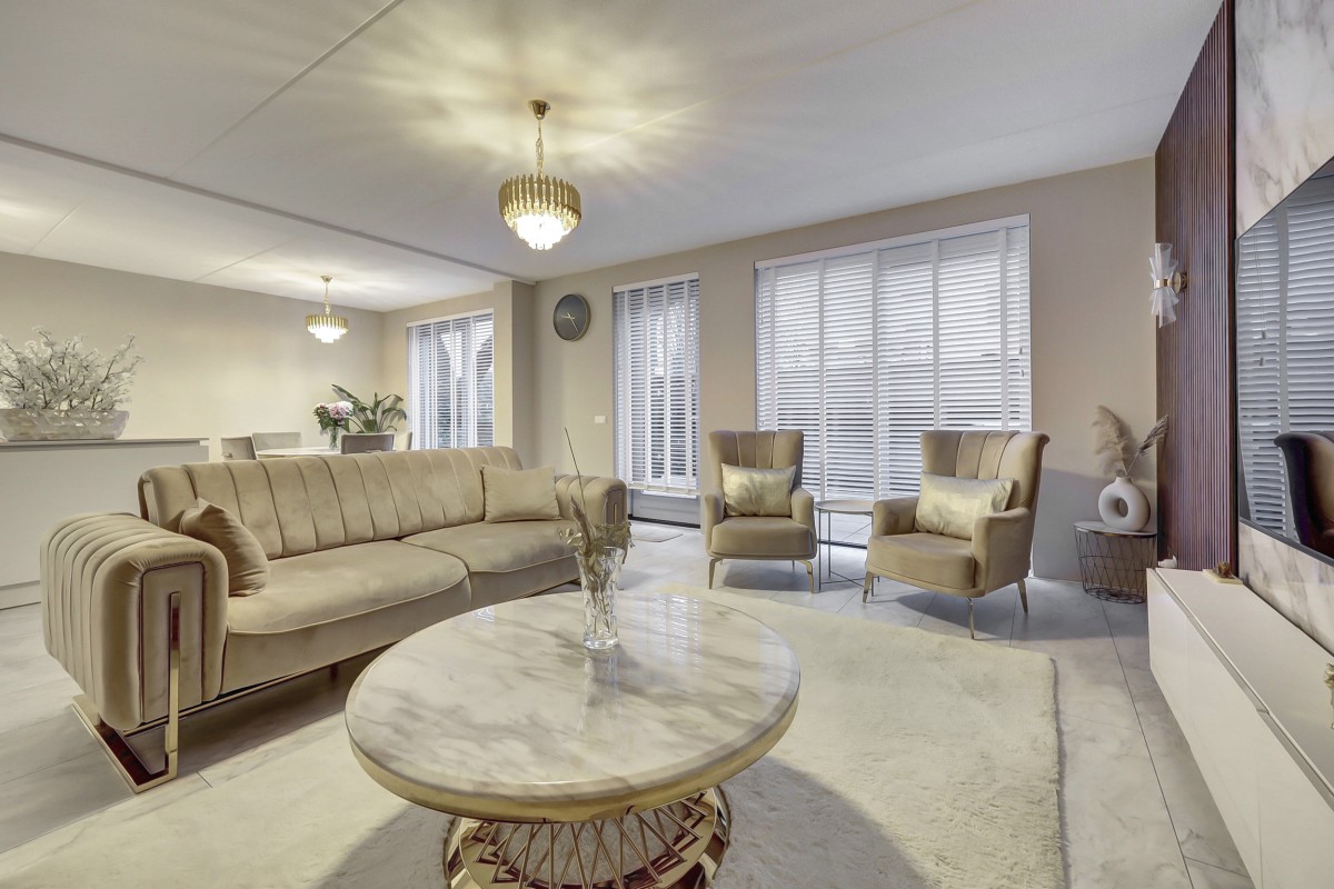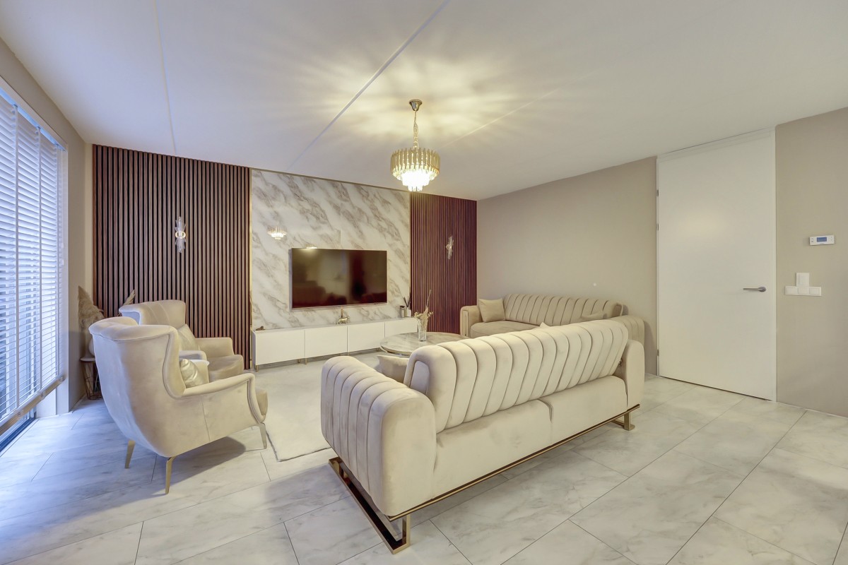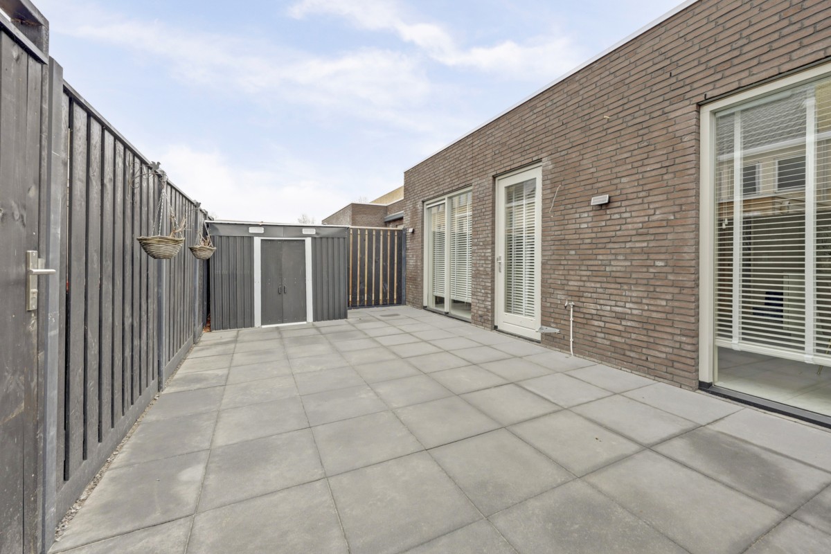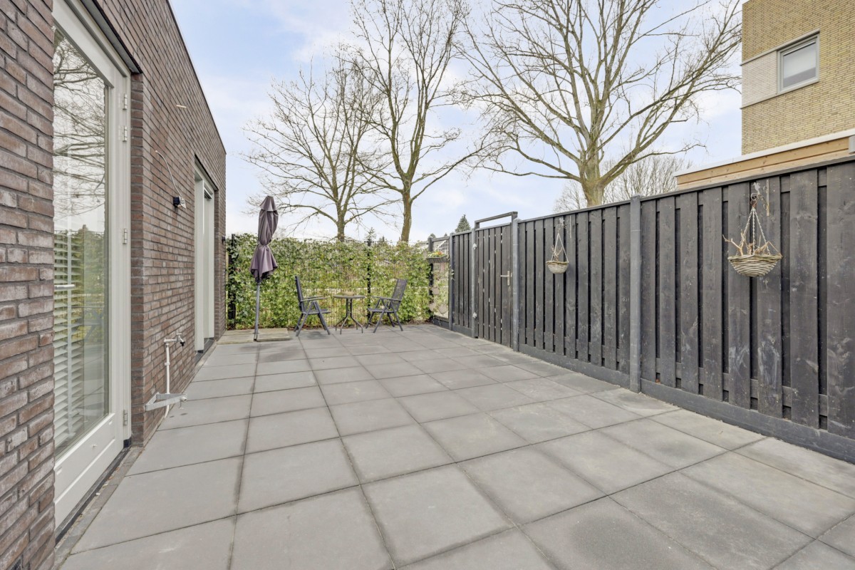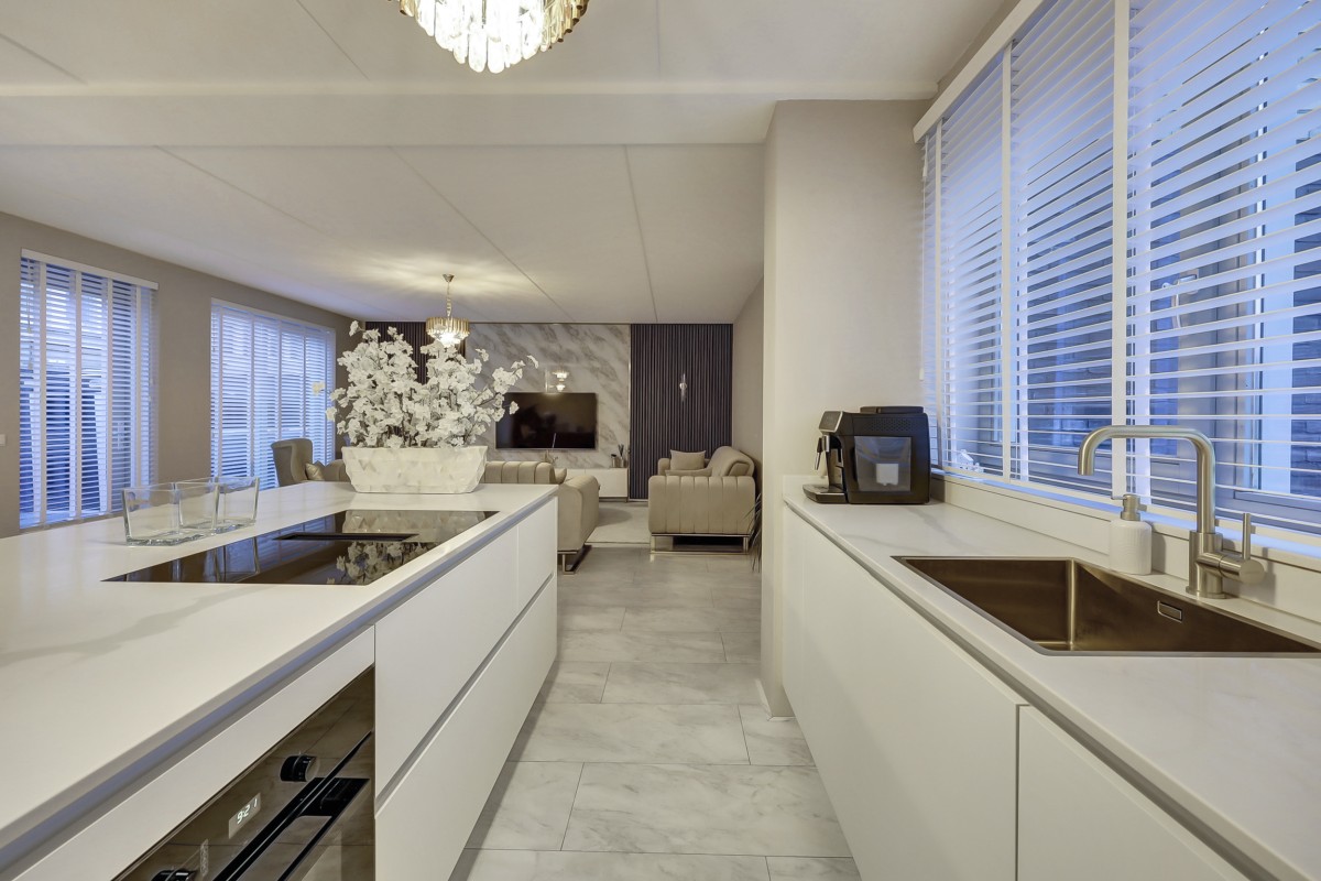 Begane grond: overdekte entree, ruime hal met garderobe, meterkast (3-fase aansluiting), trapkast, moderne toiletruimte met hangcloset en fonteintje. Uitgebouwde tuingerichte woonkamer deels voorzien van akoestische-, en marmerlook wandpanelen, een loopdeur naar de tuin en aangrenzend de ruime eethoek en luxe open keuken welke is afgewerkt met een marmerlook composiet werkblad en strakke witte fronten. De keuken is voorzien van een schiereiland met een ingebouwde Miele apparatuur waaronder een inductie kookplaat met 4 zones en downdraft afzuiging, een vaatwasser, koel-/vriescombinatie en een oven. Vanuit de woonkamer is er middels een loopdeur toegang tot de onderhoudsarme aangelegde tuin op het westen. De tuin biedt een terras met moderne bestrating, vrijstaande stalen berging, buitenkraan en een achterom.