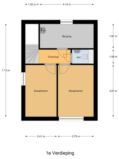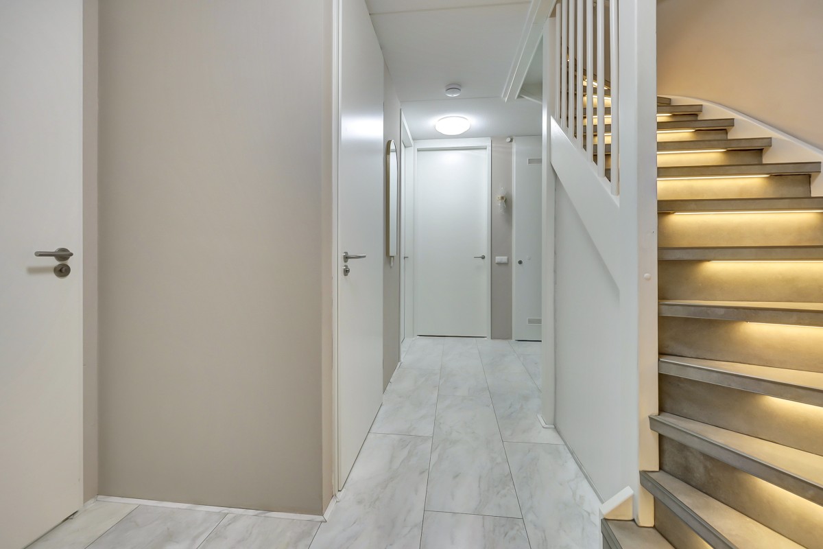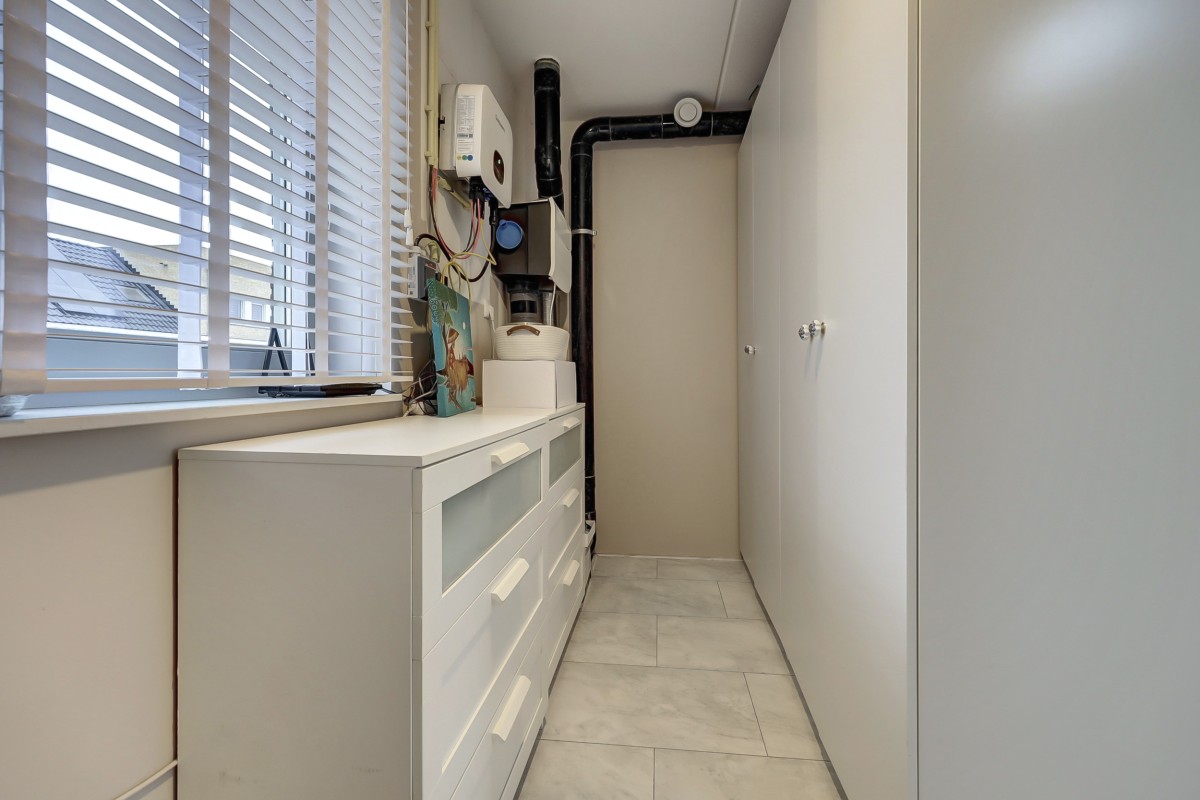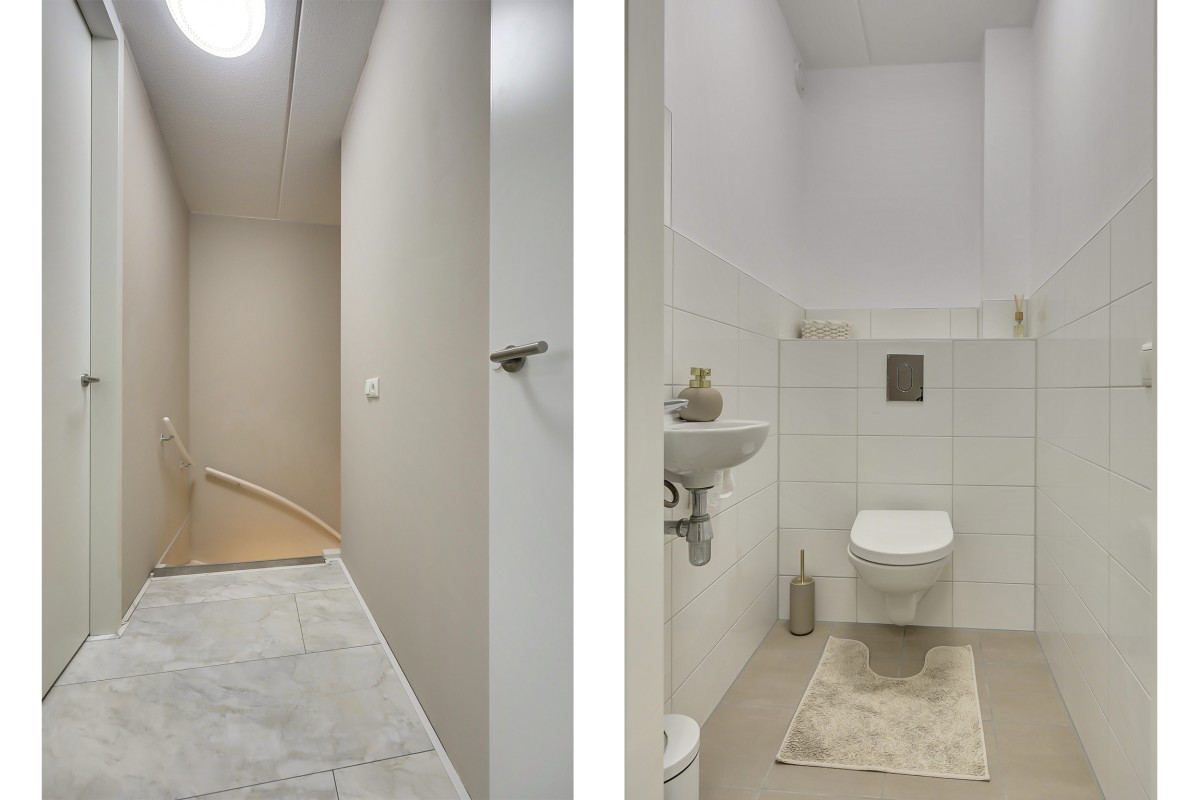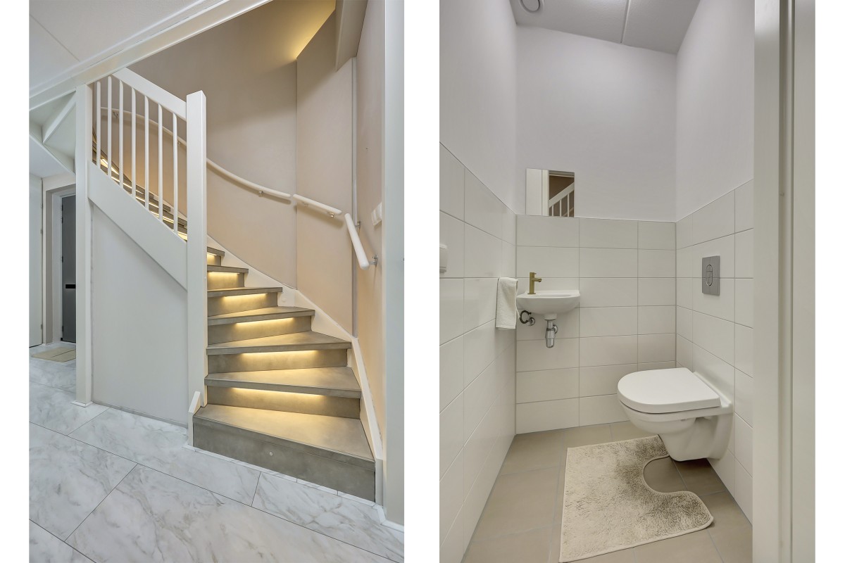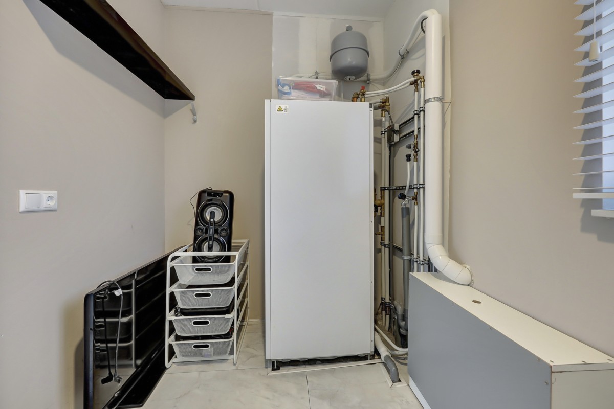 Eerste verdieping: Vaste trap naar de eerste verdieping met overloop en aangrenzend twee mooie slaapkamers, een separate toiletruimte met een hangcloset en fonteintje en een technische/berg ruimte met de opstelplaats van de warmte pomp, mechanische ventilatie, omvormer voor de zonnepanelen en voldoende praktische opbergruimte. Ook de eerste verdieping is geheel afgewerkt met een fraaie marmerlook laminaatvloer.