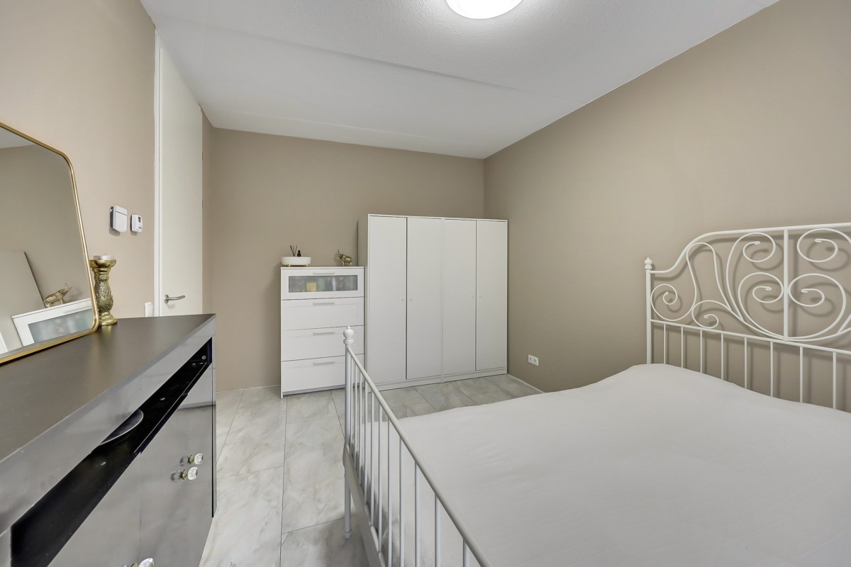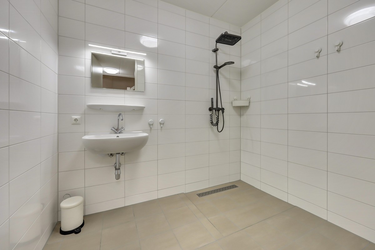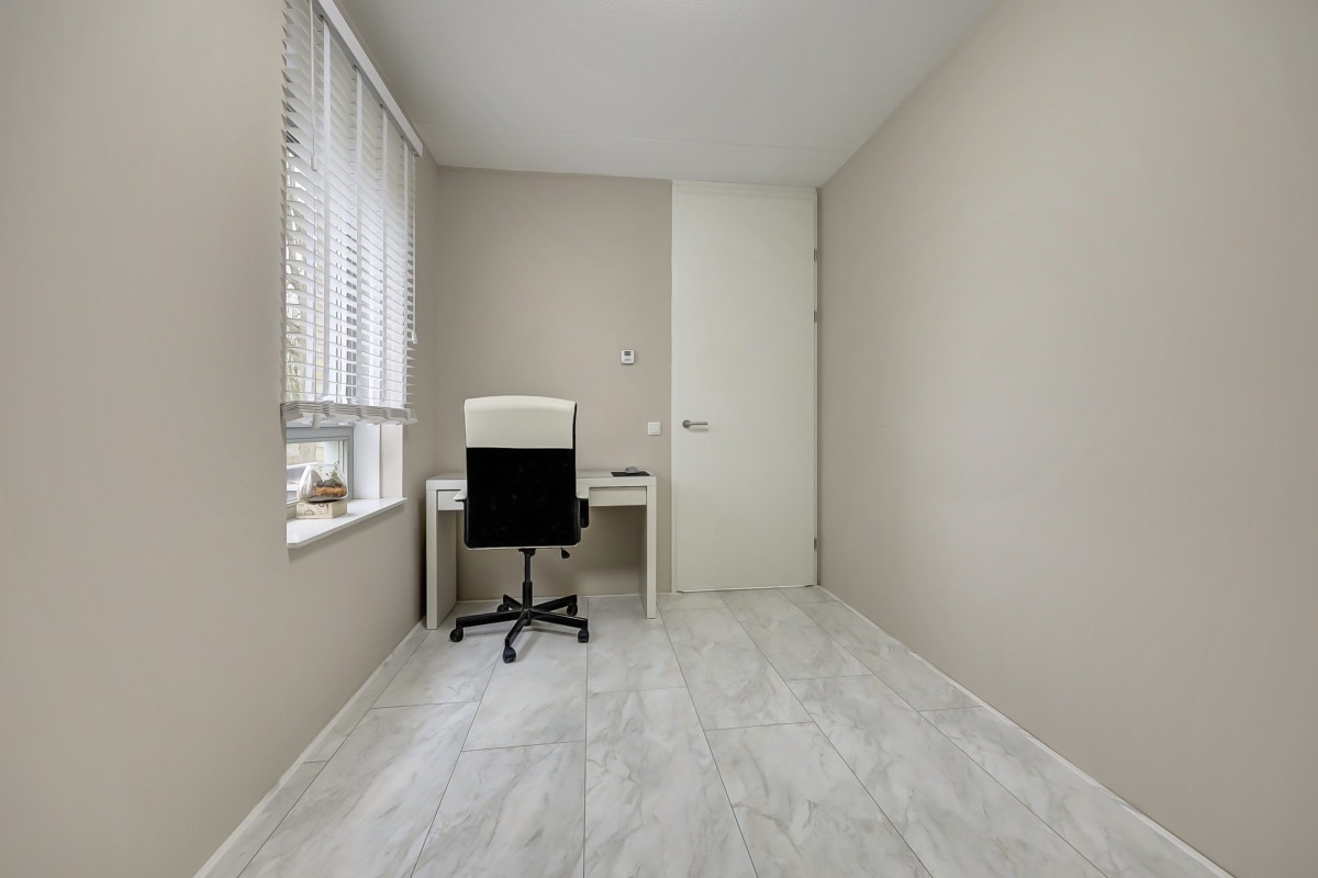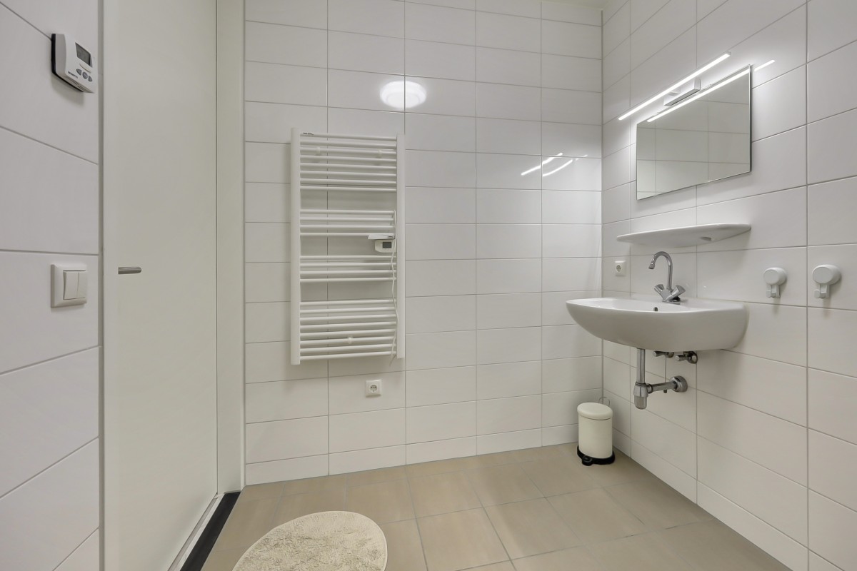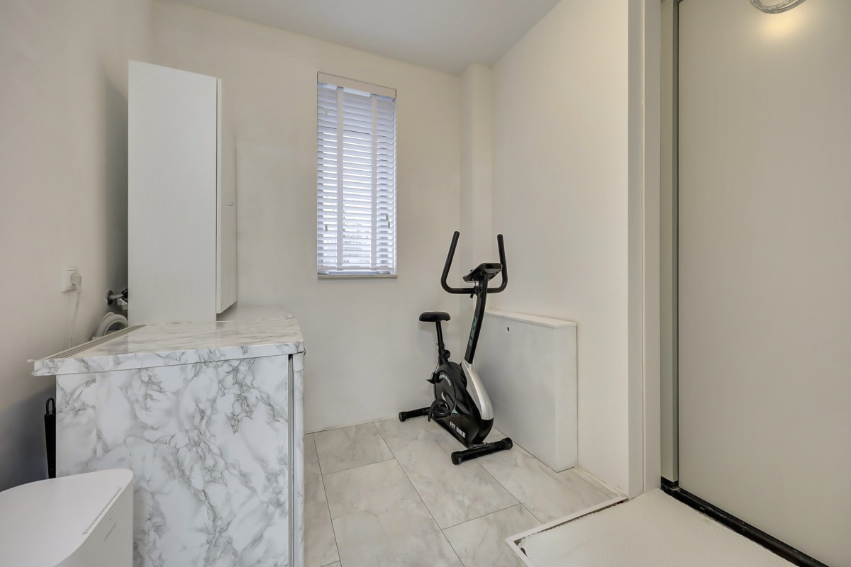 Vanuit de hal is er tevens toegang tot de slaapkamer (14m2) en badkamer op de begane grond alsmede de bijkeuken. De badkamer is volledig betegeld en biedt een ruime douchehoek met regen en handdouche, een wastafel, handdoekenradiator en vloerverwarming. De bijkeuken heeft een loopdeur naar de oprit en hier is de opstelplaats voor de wasapparatuur alsmede voldoende opbergruimte. De gehele begane grond vloer is afgewerkt met een fraaie marmerlook laminaat vloer.