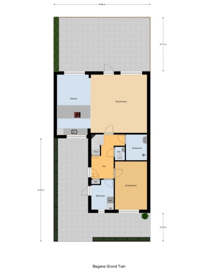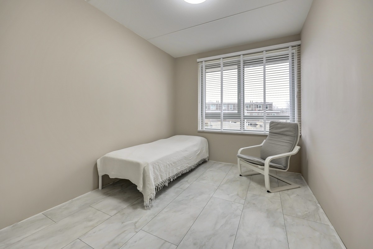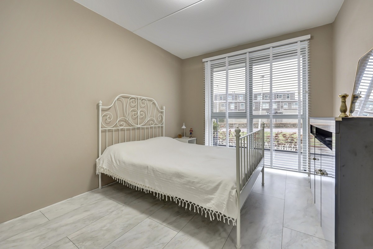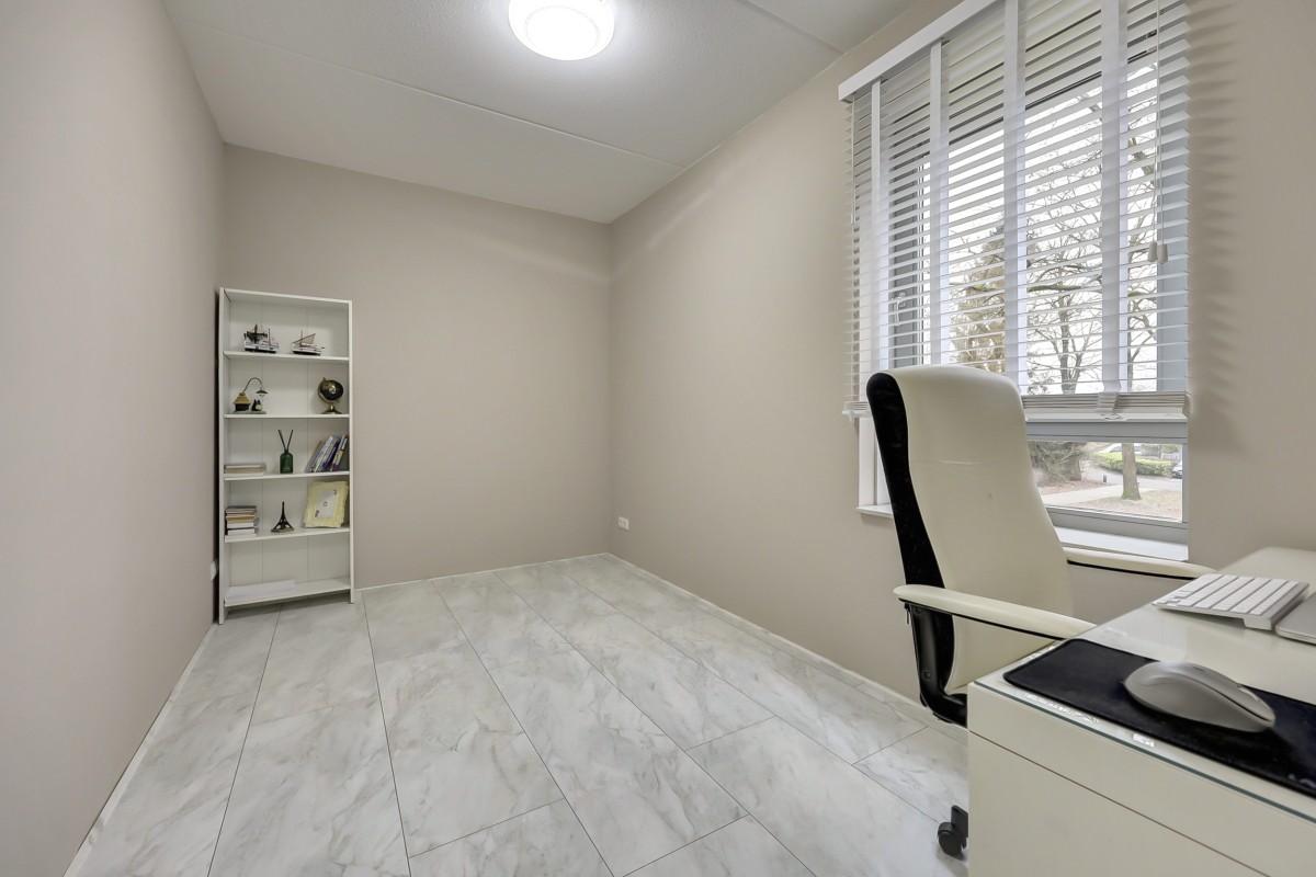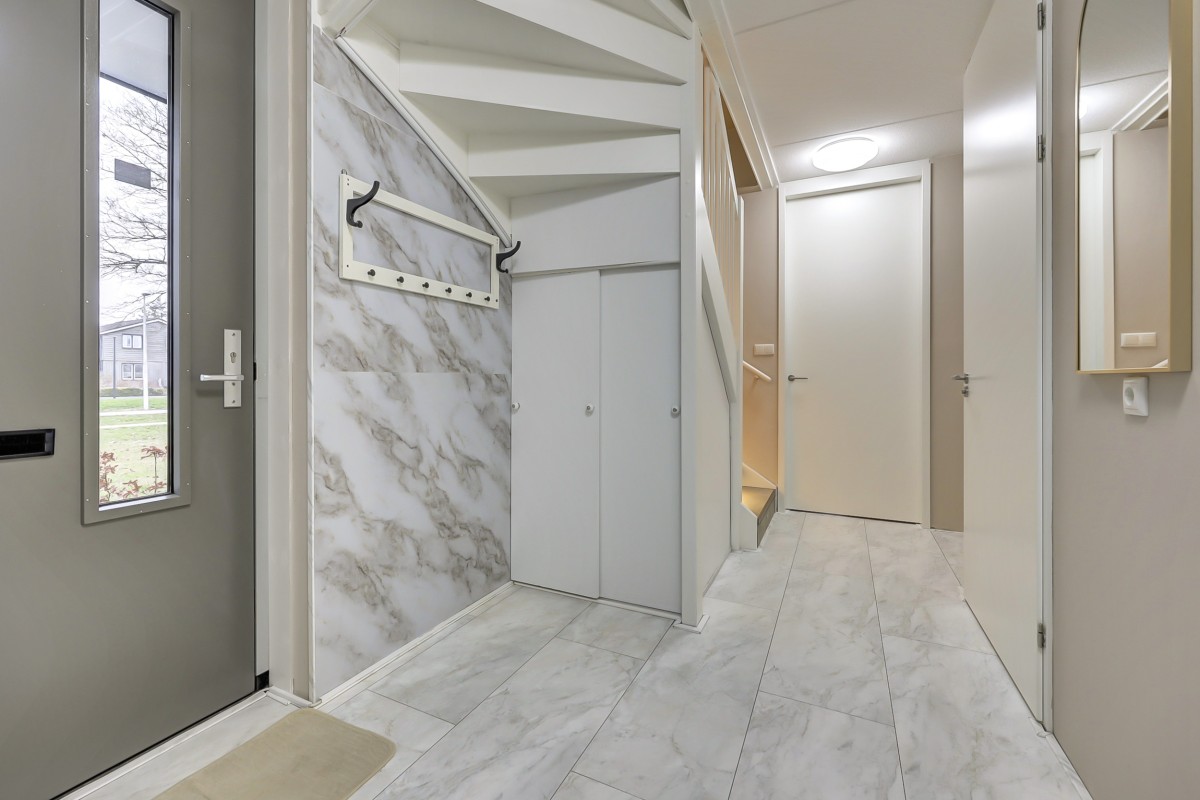 Vanuit de hal is er tevens toegang tot de slaapkamer (14m2) en badkamer op de begane grond alsmede de bijkeuken. De badkamer is volledig betegeld en biedt een ruime douchehoek met regen en handdouche, een wastafel, handdoekenradiator en vloerverwarming. De bijkeuken heeft een loopdeur naar de oprit en hier is de opstelplaats voor de wasapparatuur alsmede voldoende opbergruimte. De gehele begane grond vloer is afgewerkt met een fraaie marmerlook laminaat vloer.