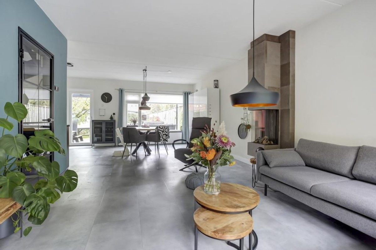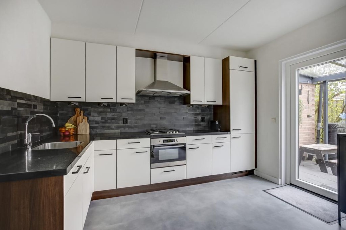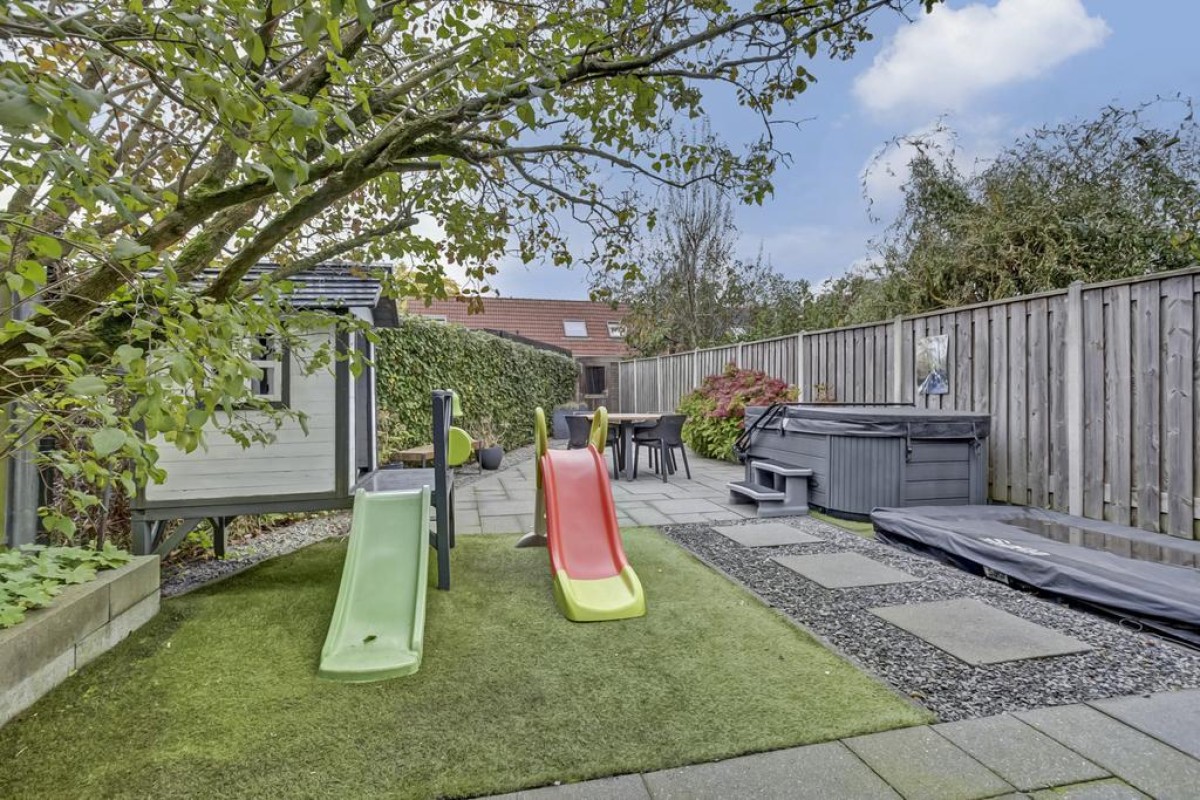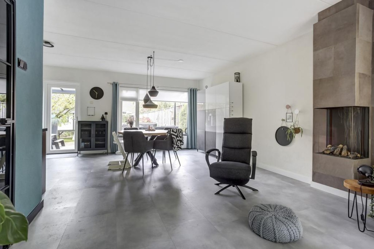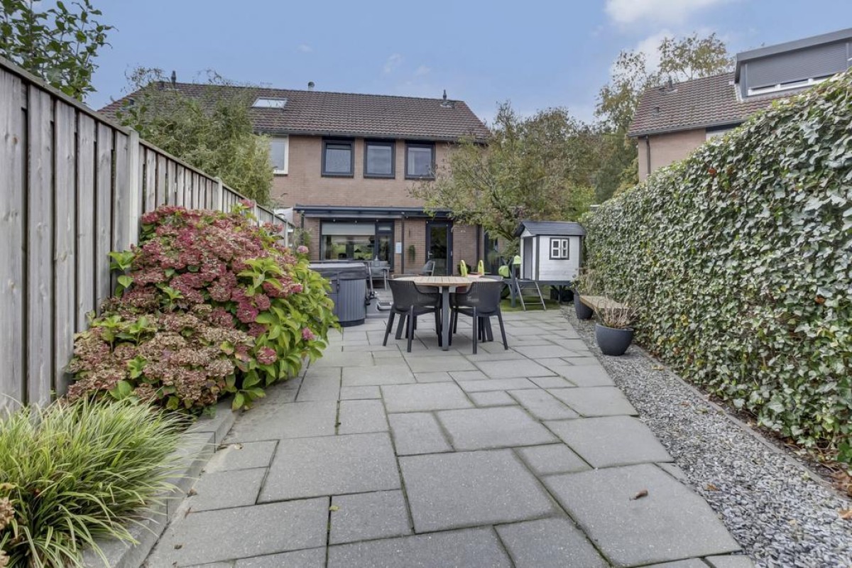 Begane grond: entree, ruime ontvangsthal met garderobe, meterkast, bergkast, toiletruimte met hangcloset en fonteintje, doorgang naar de woonkamer met mooie gashaard en vrij uitzicht over groen. Aan de achterzijde van de woning is de ruime eethoek gesitueerd met aansluitend de open keuken voorzien van een gaskookplaat, koelkast, oven en afzuigkap. De hoek opgestelde keuken biedt tevens veel kastruimte en werkruimte. De begane grond beschikt over een moderne PVC-vloer. Een loopdeur geeft toegang tot het overdekte terras, waarmee de garage droog te bereiken is. De moderne overkapping is over de gehele breedte van de woning gerealiseerd en beschik tevens over een elektrisch zonnescherm. De aangebouwde stenen garage is in gebruik als berging, doch geeft ook de mogelijkheid om een auto te stallen. De achtertuin is mooi groen aangelegd en beschikt over een groot terras tegen de woning alsmede meerdere zitjes in de tuin. Achterin de tuin is een vrijstaande houten berging aanwezig.