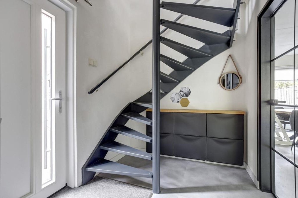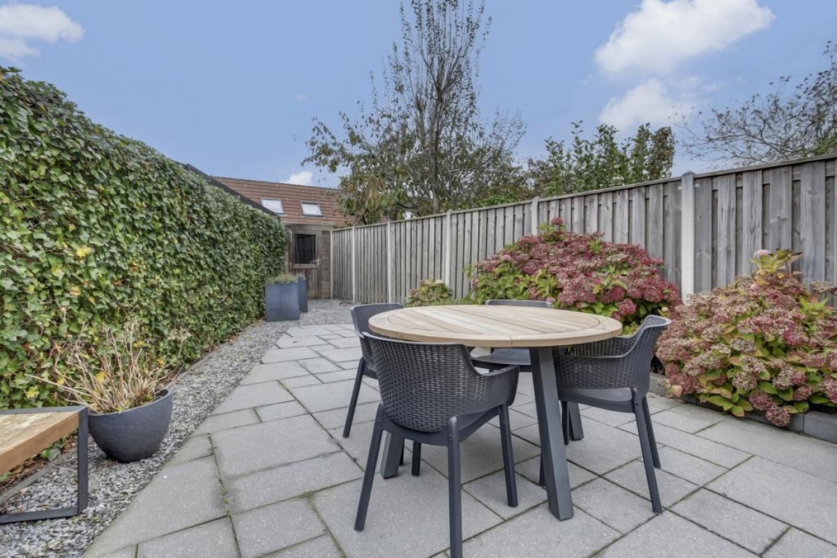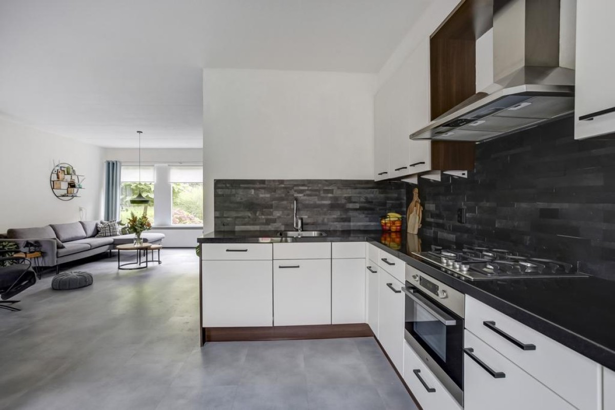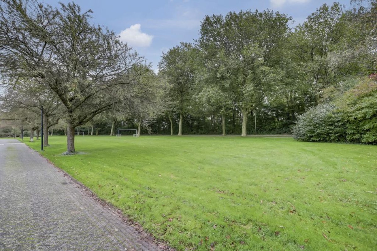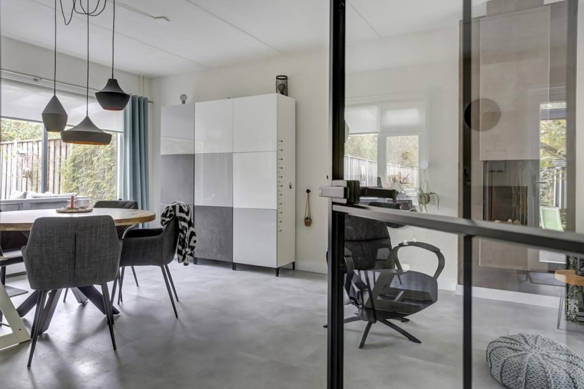 Begane grond: entree, ruime ontvangsthal met garderobe, meterkast, bergkast, toiletruimte met hangcloset en fonteintje, doorgang naar de woonkamer met mooie gashaard en vrij uitzicht over groen. Aan de achterzijde van de woning is de ruime eethoek gesitueerd met aansluitend de open keuken voorzien van een gaskookplaat, koelkast, oven en afzuigkap. De hoek opgestelde keuken biedt tevens veel kastruimte en werkruimte. De begane grond beschikt over een moderne PVC-vloer. Een loopdeur geeft toegang tot het overdekte terras, waarmee de garage droog te bereiken is. De moderne overkapping is over de gehele breedte van de woning gerealiseerd en beschik tevens over een elektrisch zonnescherm. De aangebouwde stenen garage is in gebruik als berging, doch geeft ook de mogelijkheid om een auto te stallen. De achtertuin is mooi groen aangelegd en beschikt over een groot terras tegen de woning alsmede meerdere zitjes in de tuin. Achterin de tuin is een vrijstaande houten berging aanwezig.