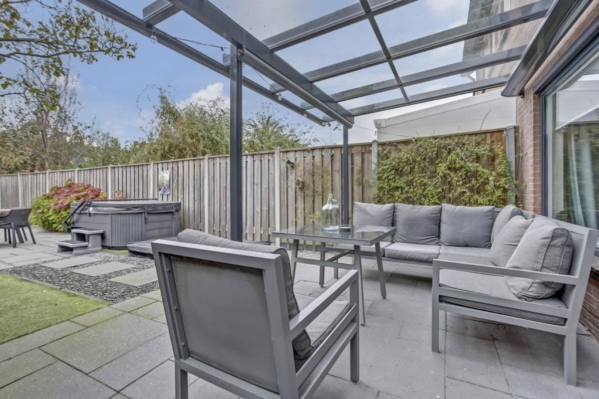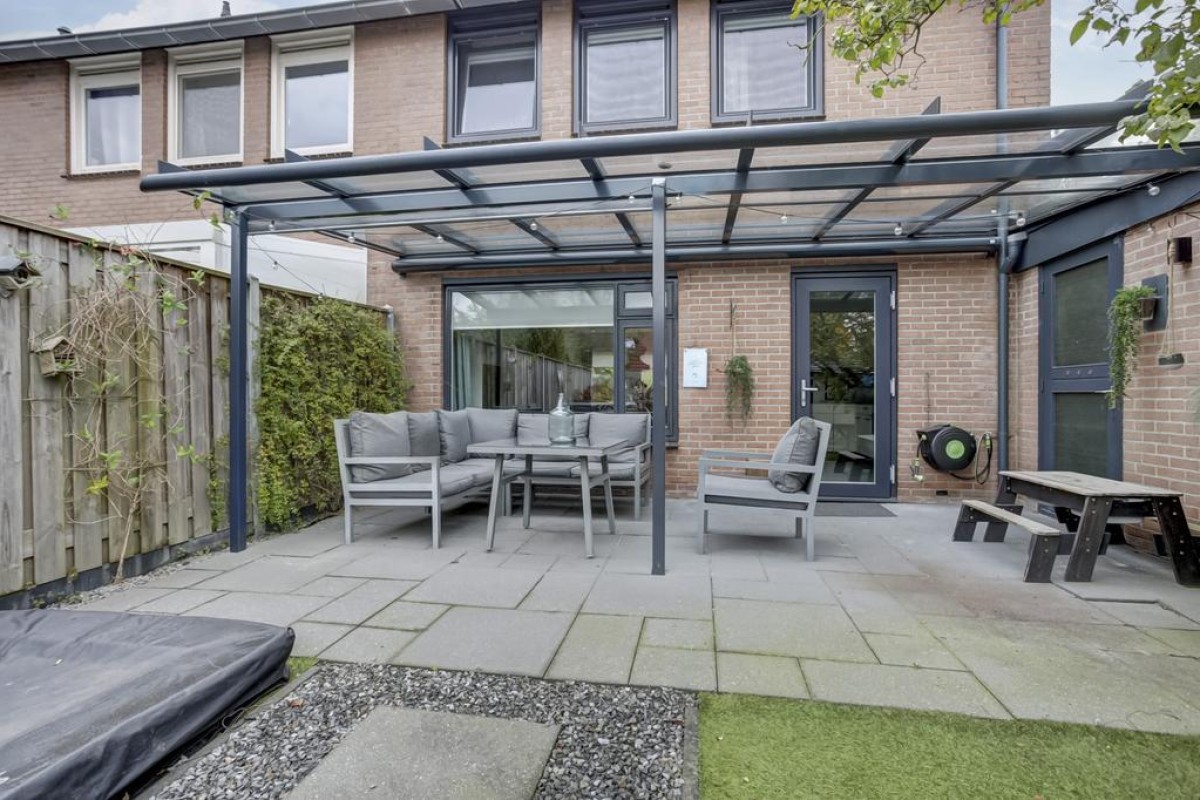 * Brede overkapping met zonnescherm tegen de achtergevel