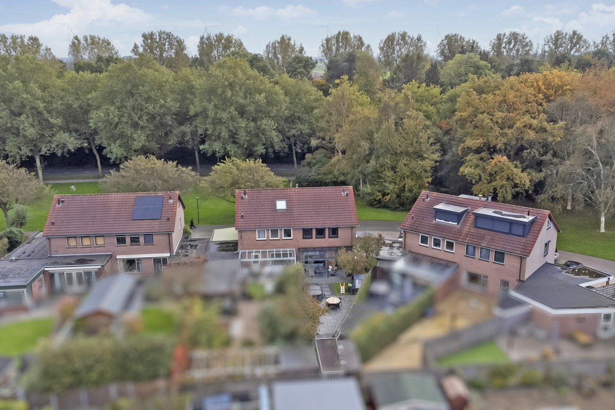 Deze geschakelde 2-onder-1-kapwoning met aangebouwde stenen garage is op korte afstand van het winkelcentrum Dronten-zuid gelegen met scholen, het gezondheidscentrum en uitvalswegen naar Almere, Lelystad, Kampen en Emmeloord nabij. Aan de voorzijde grenst de woning aan een brede groenvoorziening en bosstrook, waarmee vrij uitzicht een absolute USP van dit perceel is. Het perceel biedt parkeergelegenheid voor 3 auto's en de straat beschikt over ruime openbare parkeergelegenheid. De diepe tuin is op het westen gesitueerd en beschikt over een vrijstaande berging en een mooie overkapping tegen de achtergevel van de woning.