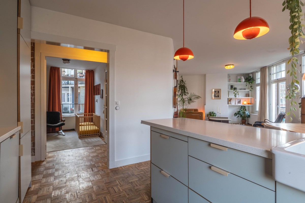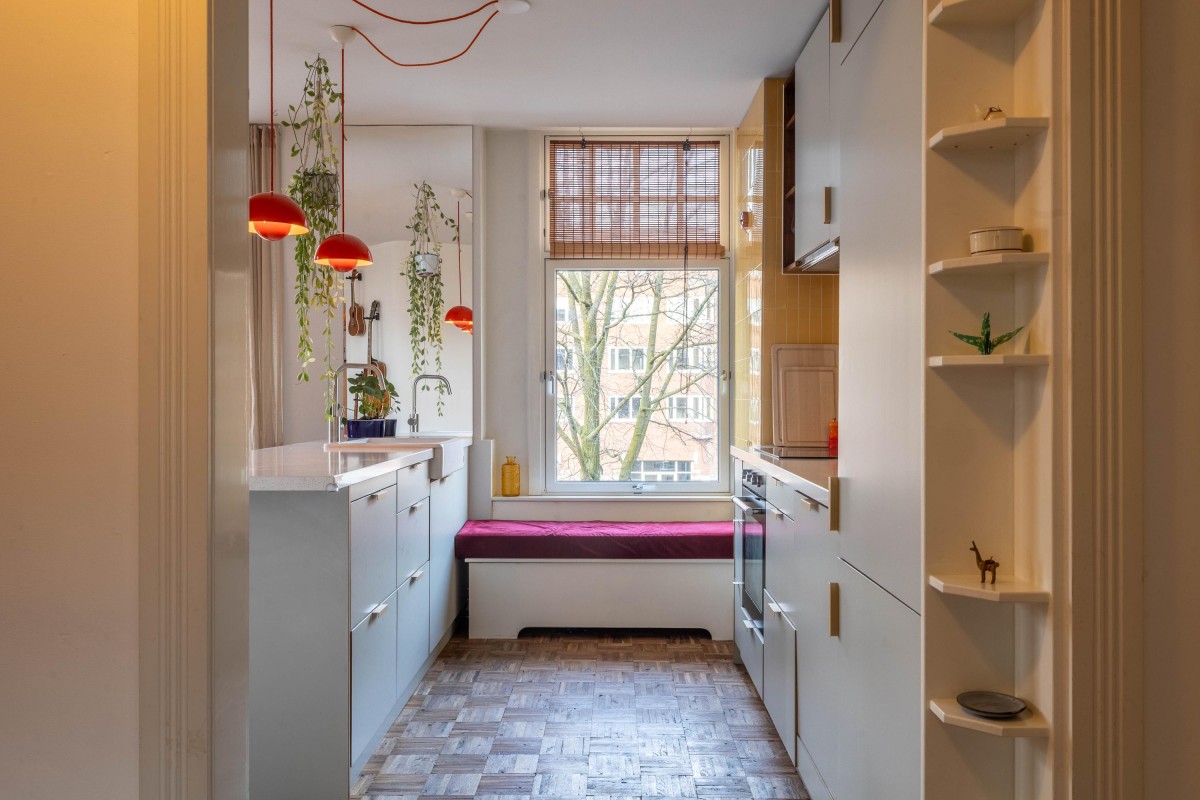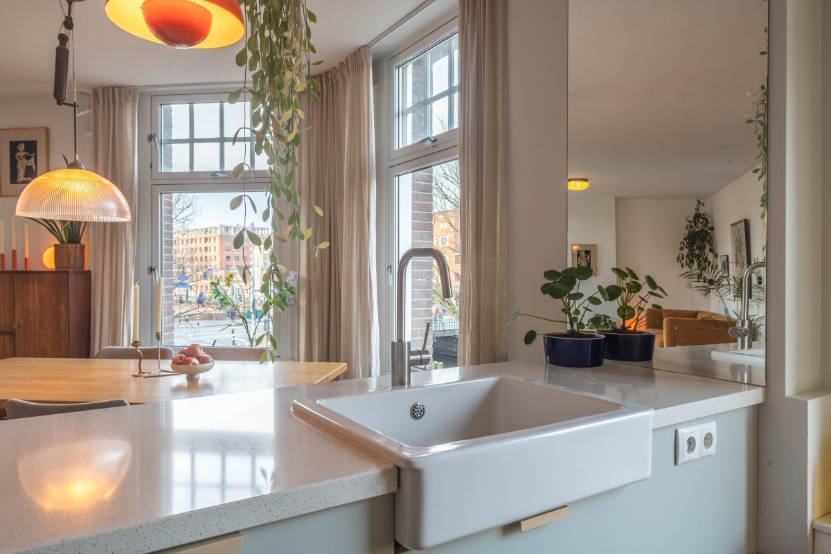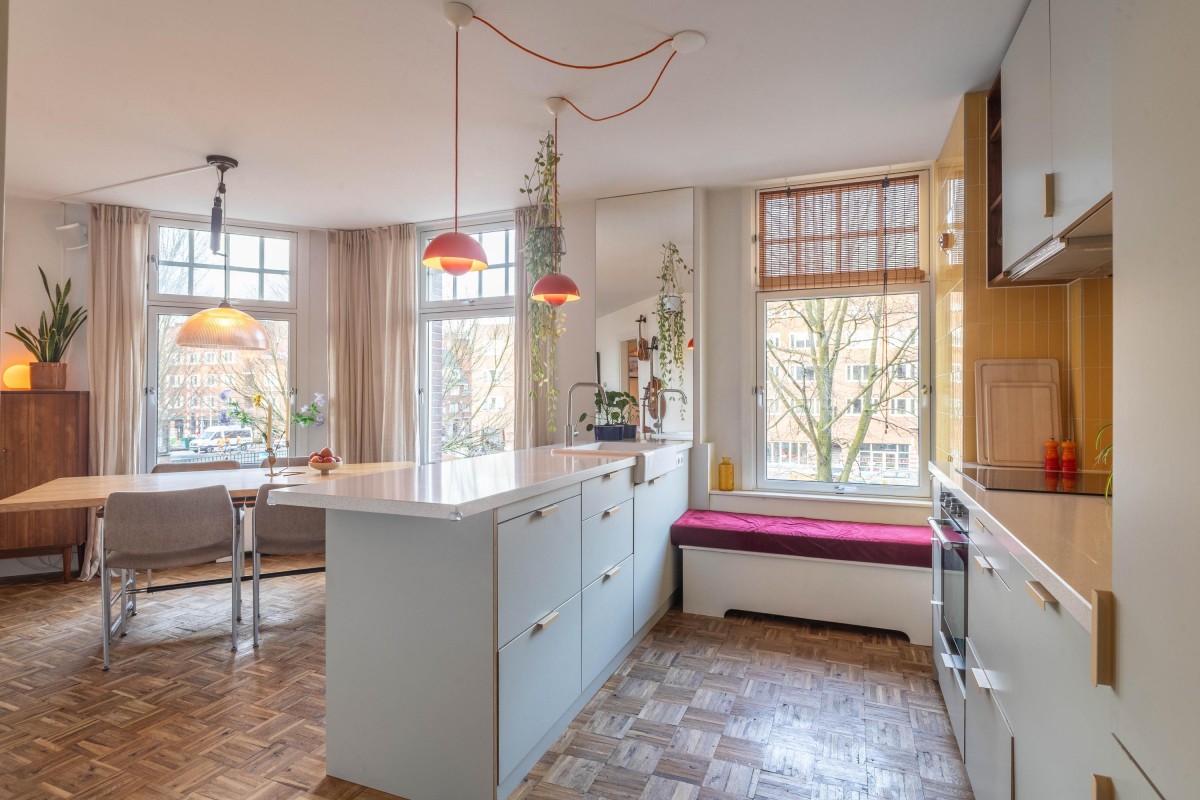 The bright living room at the front of the apartment features large windows, with smaller upper panes above them, giving the home a distinctive and characterful look. The living room offers beautiful views over the Kostverlorenvaart canal and provides access to the southwest-facing balcony, where you can enjoy the afternoon and evening sun.