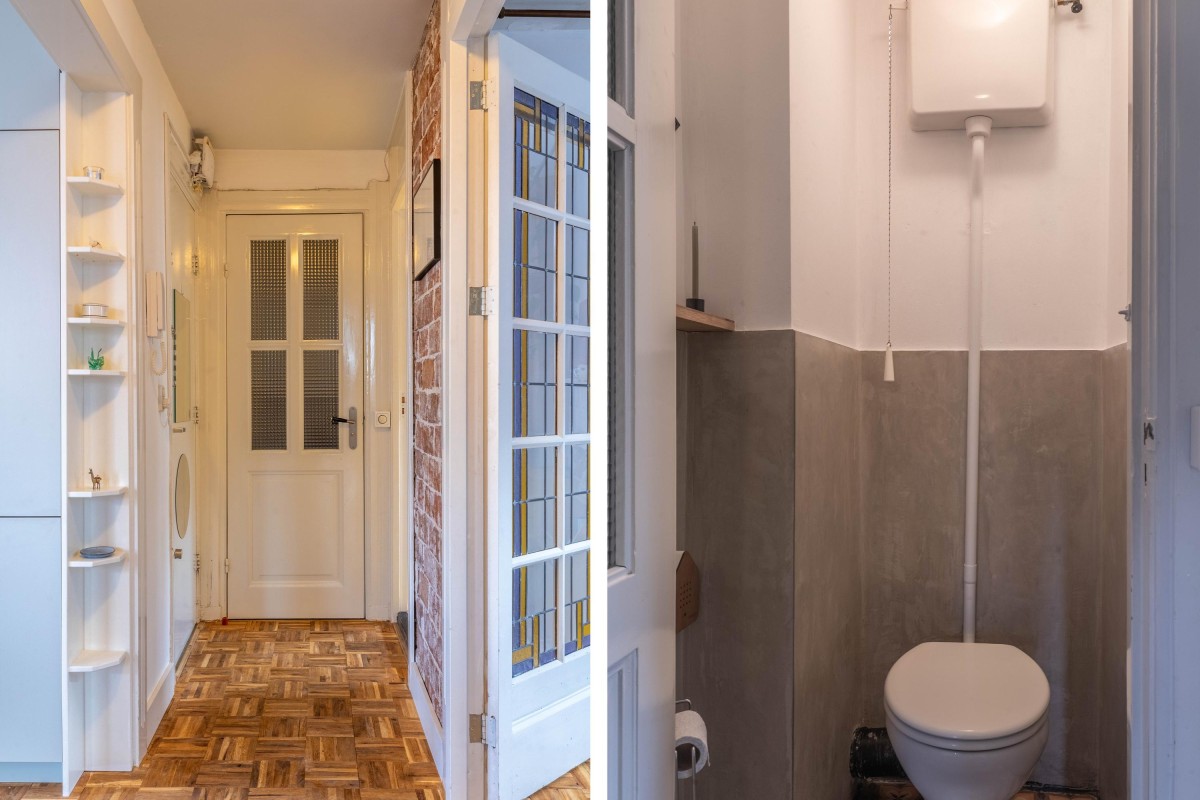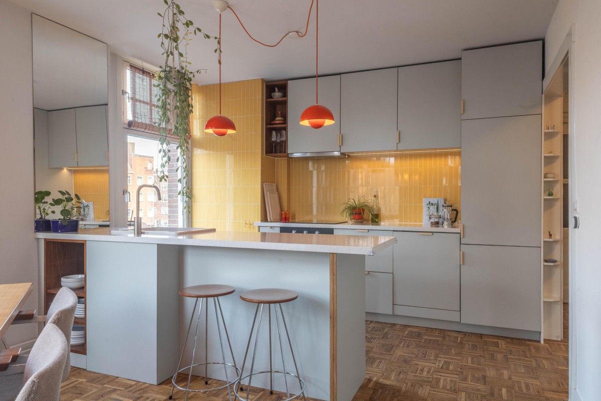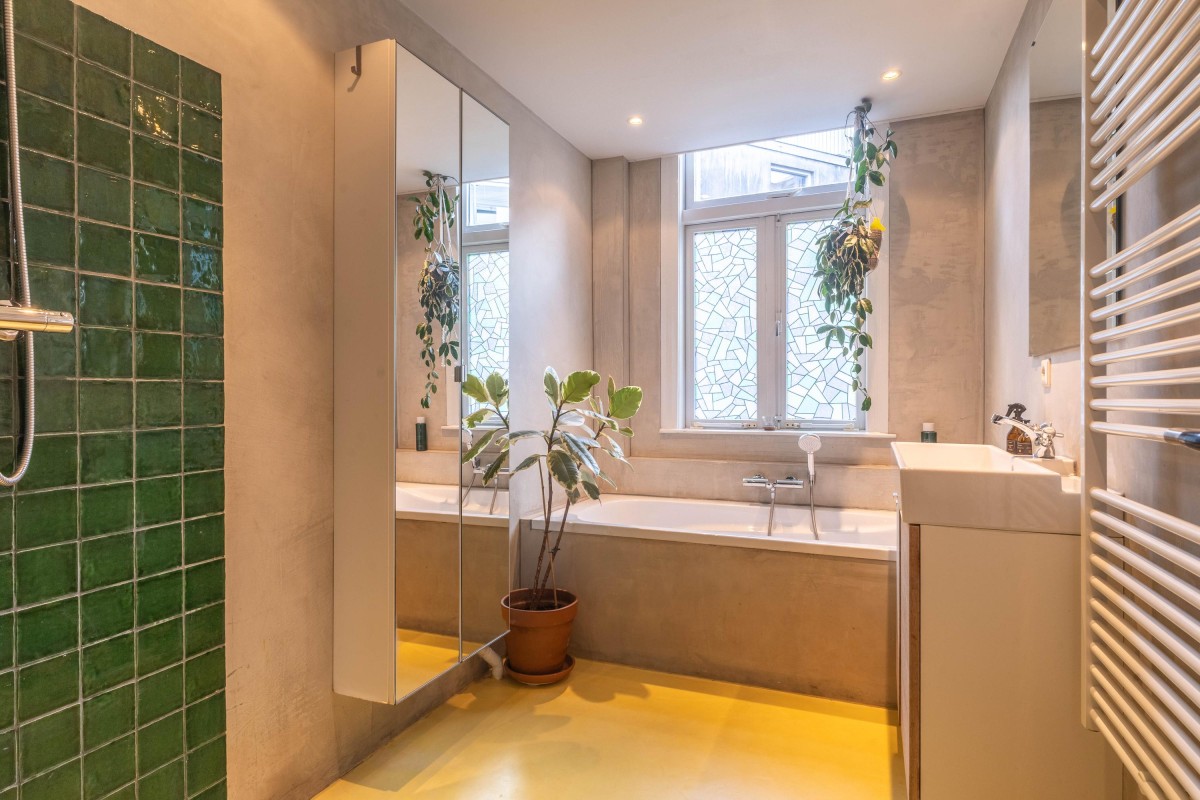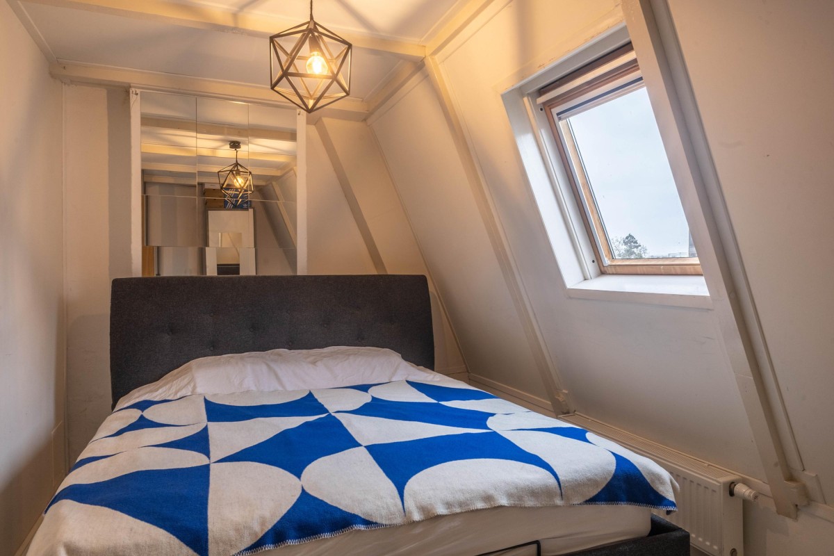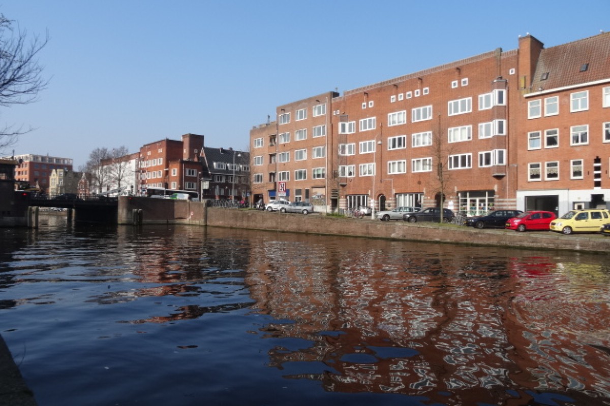 The bright living room at the front of the apartment features large windows, with smaller upper panes above them, giving the home a distinctive and characterful look. The living room offers beautiful views over the Kostverlorenvaart canal and provides access to the southwest-facing balcony, where you can enjoy the afternoon and evening sun.