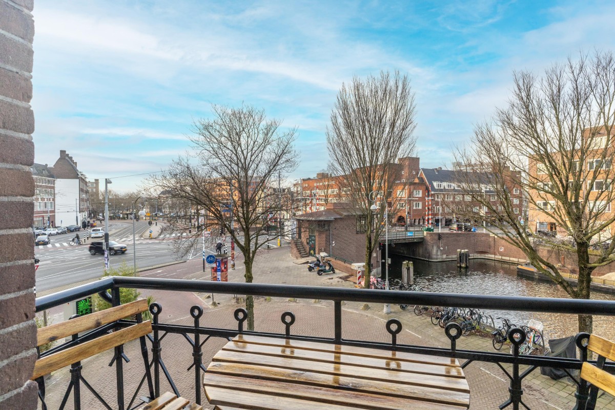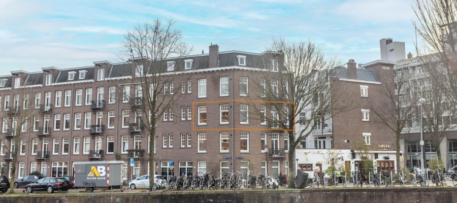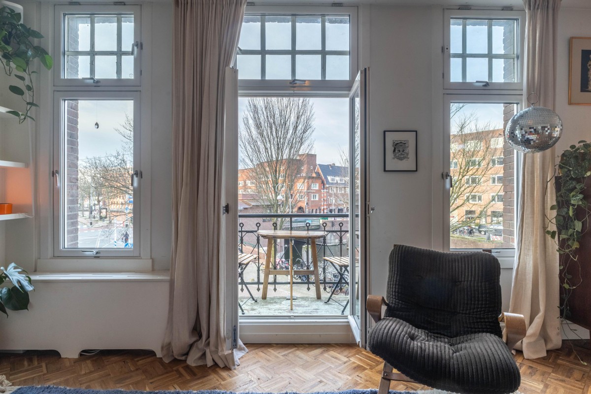 De lichte woonkamer aan de voorzijde van het appartement heeft grote raampartijen, met daarboven kleine vensters die de woning een unieke en karakteristieke uitstraling geven. De woonkamer biedt prachtig uitzicht over de Kostverlorenvaart en toegang tot het balkon op het zuidwesten, waar u heerlijk van de middag- en avondzon kunt genieten.