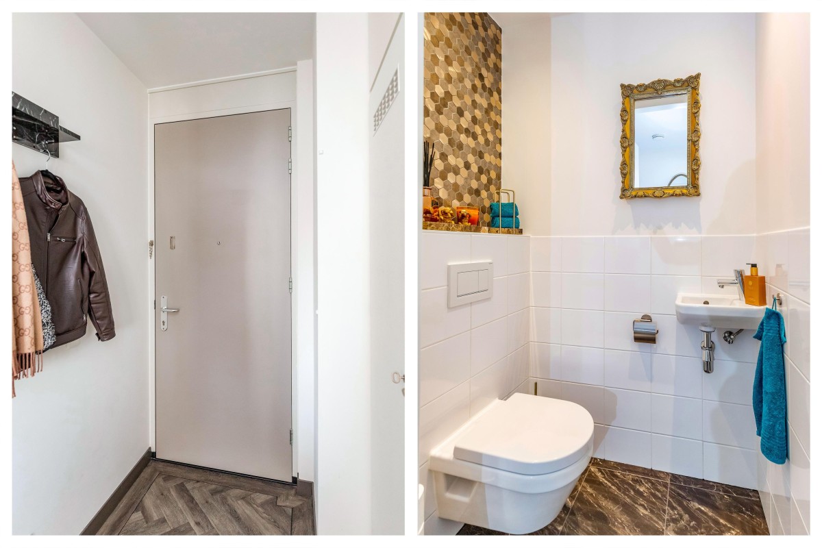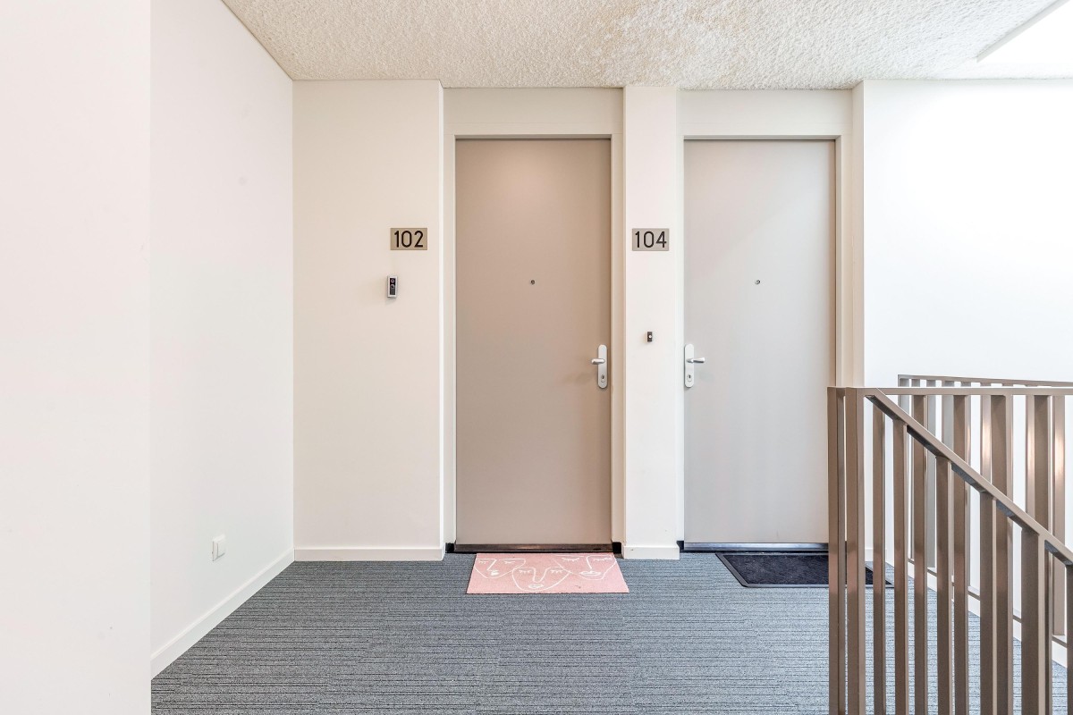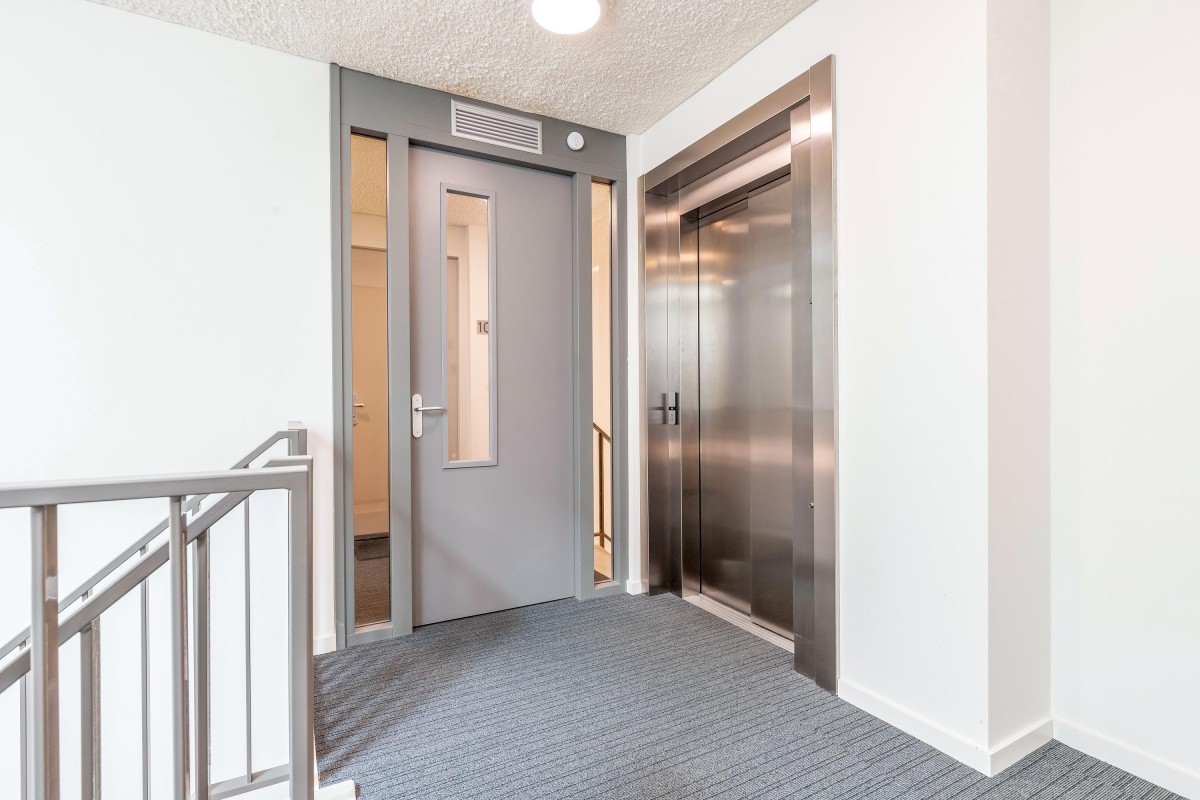 Centrale entree met brievenbussen, bellenplateau, liftinstallatie en eigen berging en parkeerplaats.