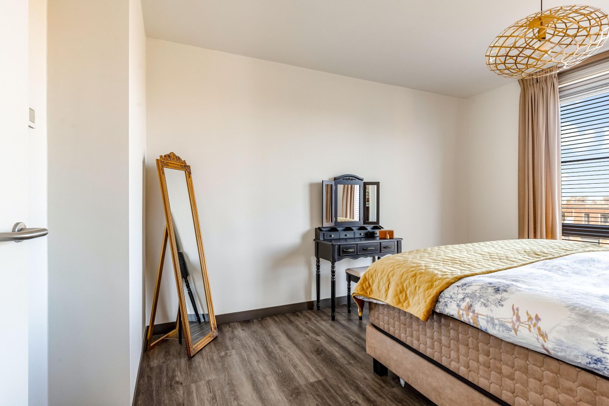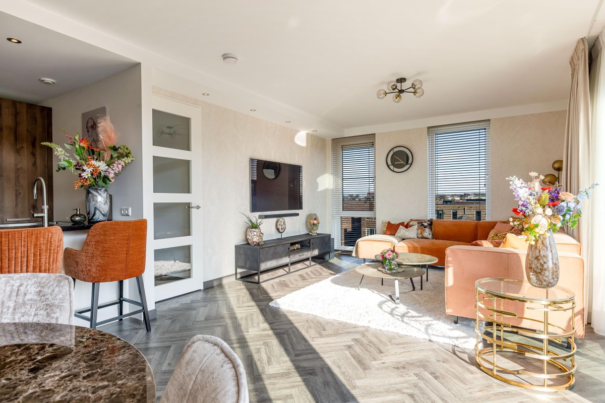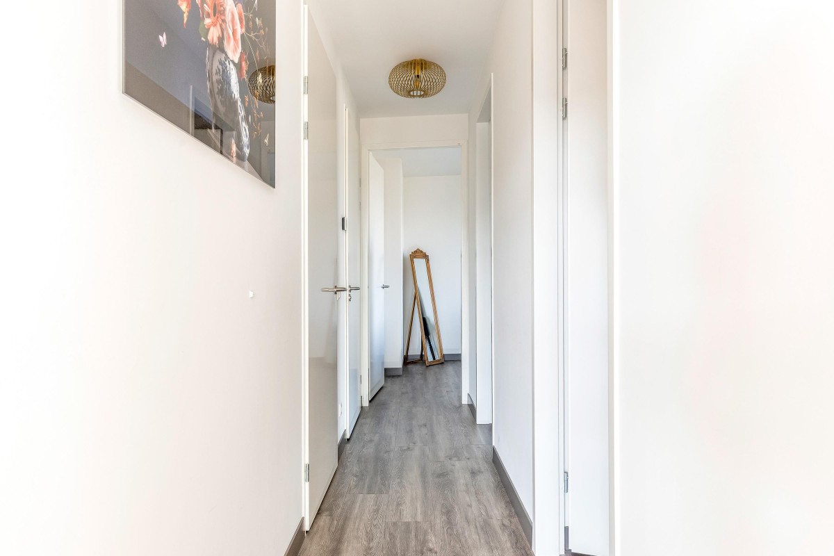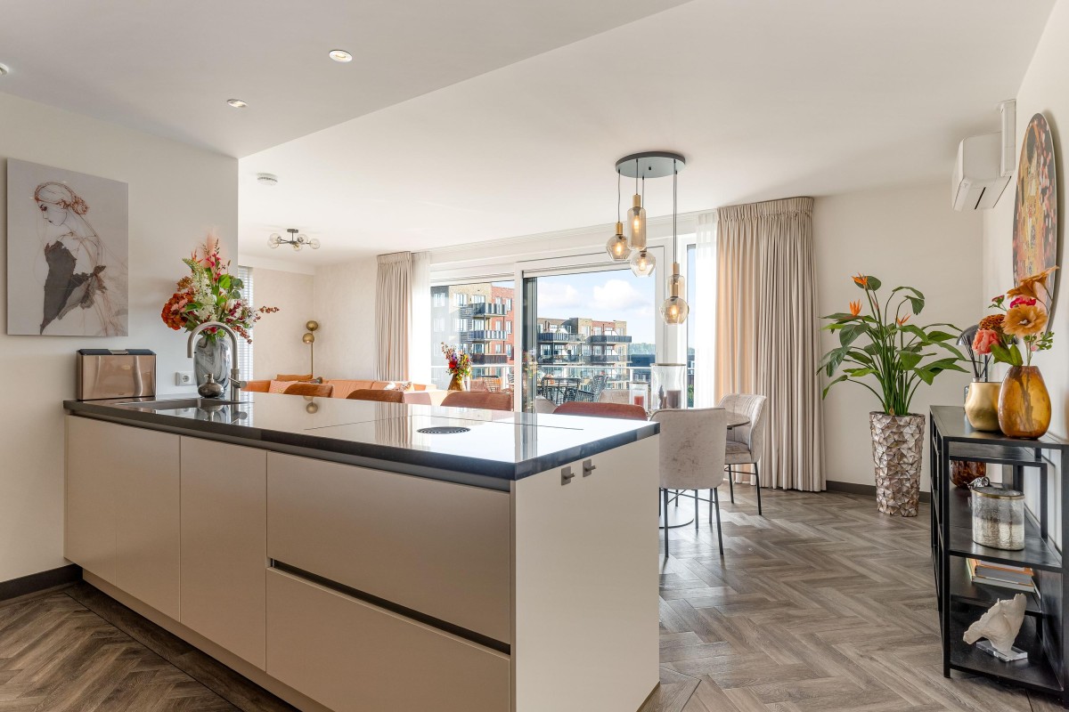 Entree/hal met intercom, meterkast, toilet en toegang tot de woonruimte. De ruime en licht woonkamer kenmerkt zich door de vele ramen en de schuifpui naar het balkon welke is gelegen op het Oosten. De moderne en luxueuze open keuken is werkelijk van alle gemakken voorzien: koffieapparaat, oven met stoom functie, combi magnetron, heet waterkraan (quooker), inductie kookplaat met geïntegreerde afzuiging (bora), koelkast, vriezer en vaatwasser. Verder is de keuken voorzien van voldoende bergruimte en een graniet werkblad. De badkamer is voorzien van lichte betegeling tot aan het plafond, een inloopdouche, design radiator en wastafel met meubel en een tweede toilet. De grote slaapkamer is prima geschikt voor een bed van 2.00x2.00 en een grote kledingkast. De tweede slaapkamer is zeer eenvoudig te vergrote door de wand van de inloopkast te verwijderen. Het gehele appartement is gestuct en voorzien van een PVC-vloer in combinatie met vloerverwarming.