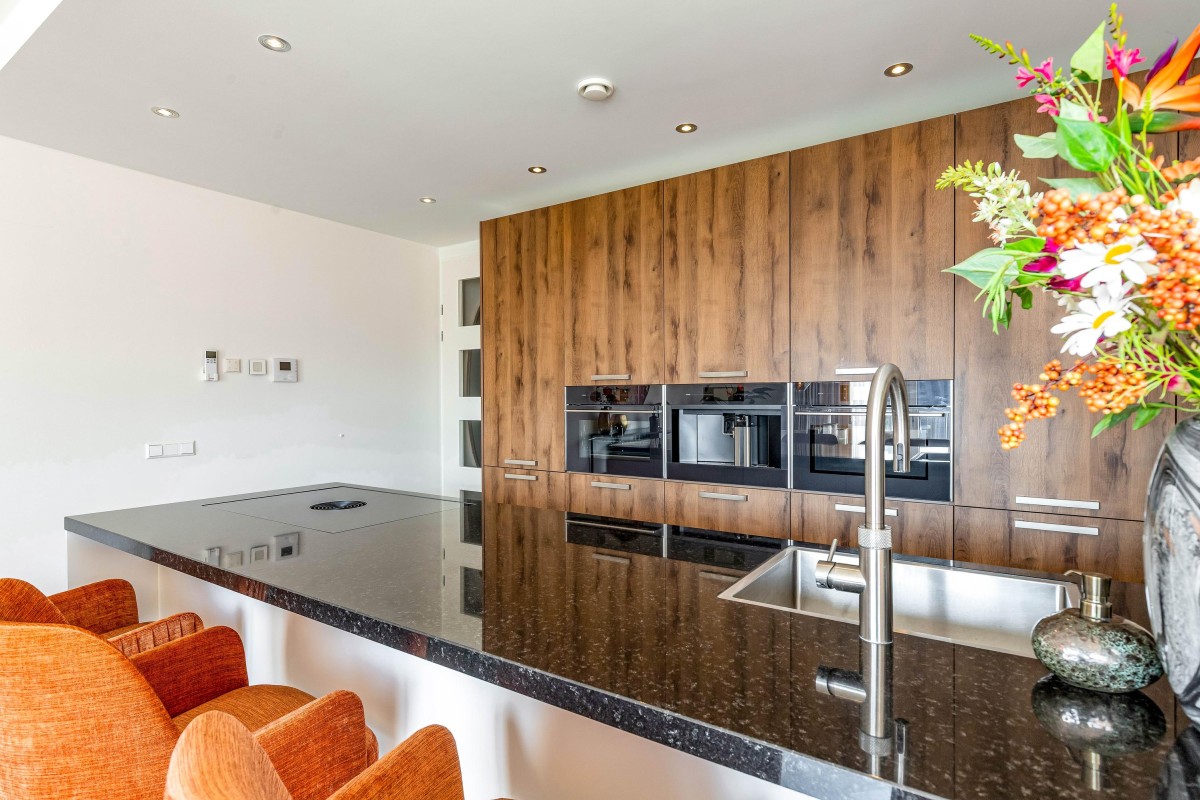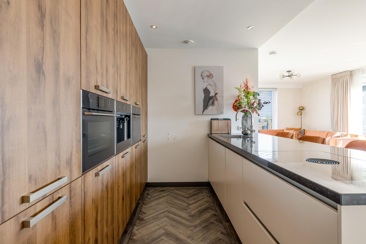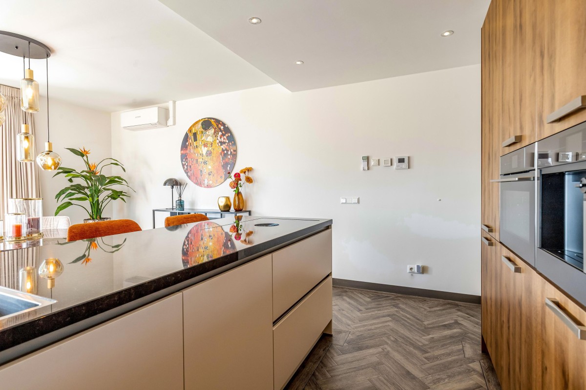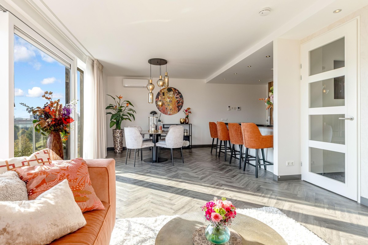 Entree/hal met intercom, meterkast, toilet en toegang tot de woonruimte. De ruime en licht woonkamer kenmerkt zich door de vele ramen en de schuifpui naar het balkon welke is gelegen op het Oosten. De moderne en luxueuze open keuken is werkelijk van alle gemakken voorzien: koffieapparaat, oven met stoom functie, combi magnetron, heet waterkraan (quooker), inductie kookplaat met geïntegreerde afzuiging (bora), koelkast, vriezer en vaatwasser. Verder is de keuken voorzien van voldoende bergruimte en een graniet werkblad. De badkamer is voorzien van lichte betegeling tot aan het plafond, een inloopdouche, design radiator en wastafel met meubel en een tweede toilet. De grote slaapkamer is prima geschikt voor een bed van 2.00x2.00 en een grote kledingkast. De tweede slaapkamer is zeer eenvoudig te vergrote door de wand van de inloopkast te verwijderen. Het gehele appartement is gestuct en voorzien van een PVC-vloer in combinatie met vloerverwarming.